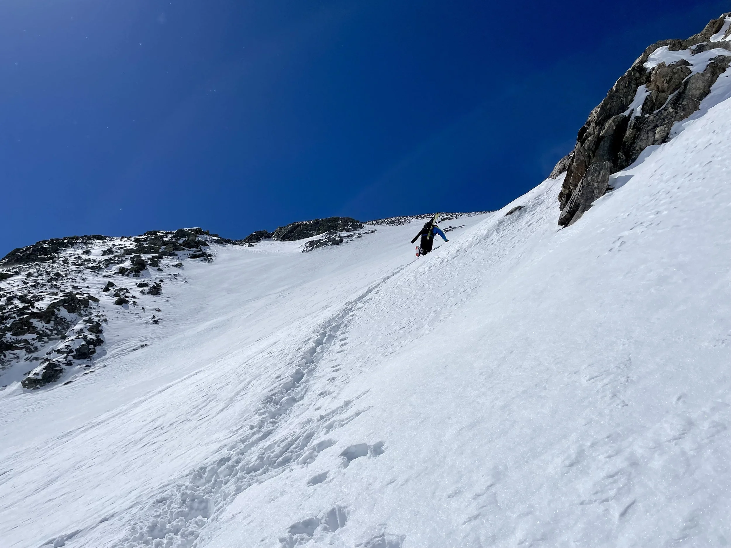 Similar to the day before on Mount Guyot, we found a wind crust on the surface of the snow. This made the boot pack much more exhausting as we had to break through this layer of snow. I’m glad Mike was breaking trail! We had to boot pack the last ~500 ft of vert. At the top of the ridge, we were met by some pretty strong winds so our snack break was very short, and we quickly transitioned to ski down.