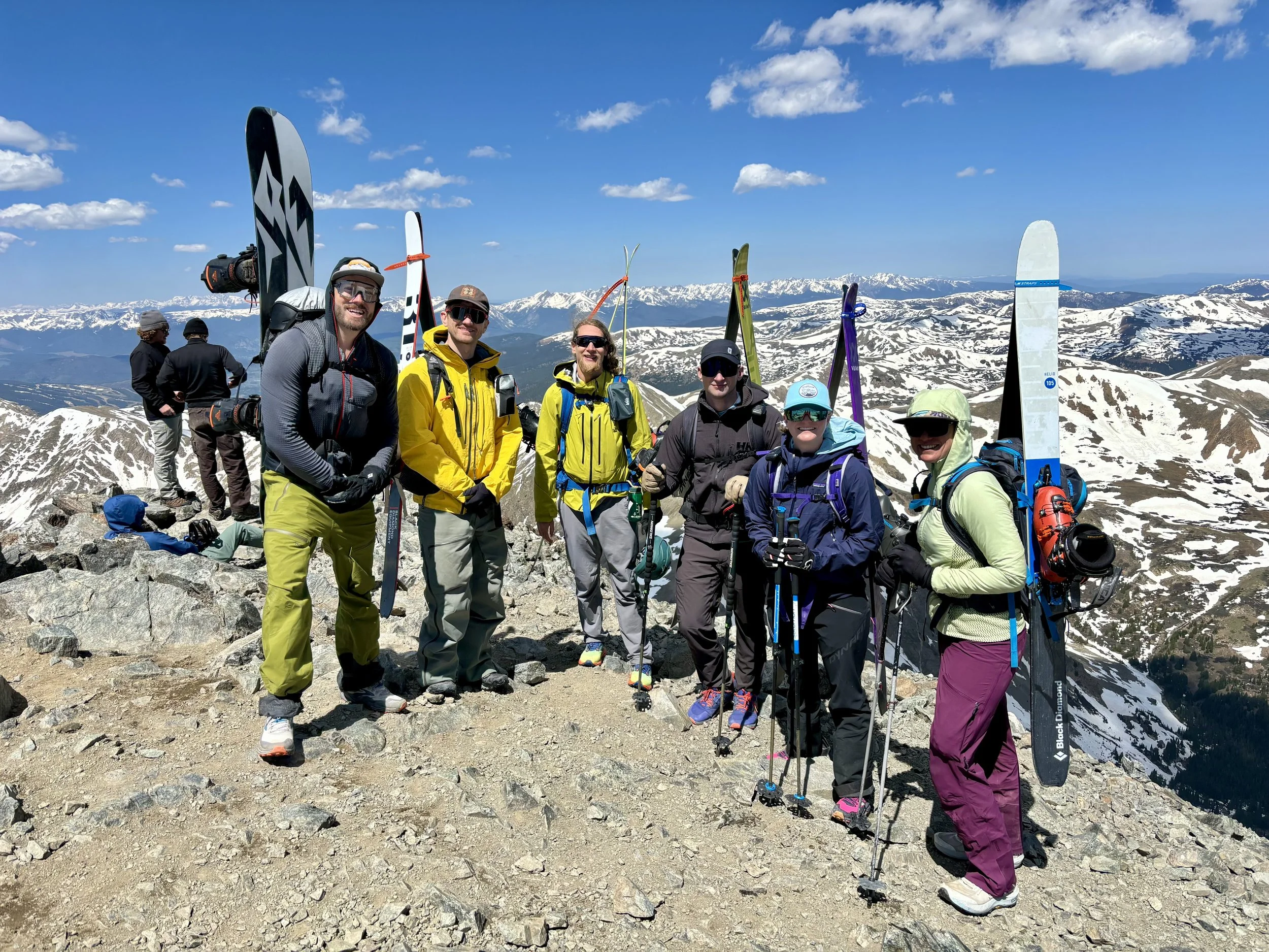 We parked one car by Grizzly Gulch and all squeezed into another car that we’d park at the summer trailhead for Gray’s Peak. Our plan was to hike the summer trail in our trail running shoes and carry our skis and boots attached to our backpacks. It was a beautiful morning to hike a 14er. As expected, we didn’t have the trail to ourselves and saw quite a few people along the way. The trail was mostly snow-free with one small snowfield that we had to traverse before the saddle between Gray’s and Torrey’s. We put Microspikes for this snowfield, but in hindsight I don’t think we really need them. Once we reached the saddle, it was just a couple hundred more feet of elevation gain to the top.