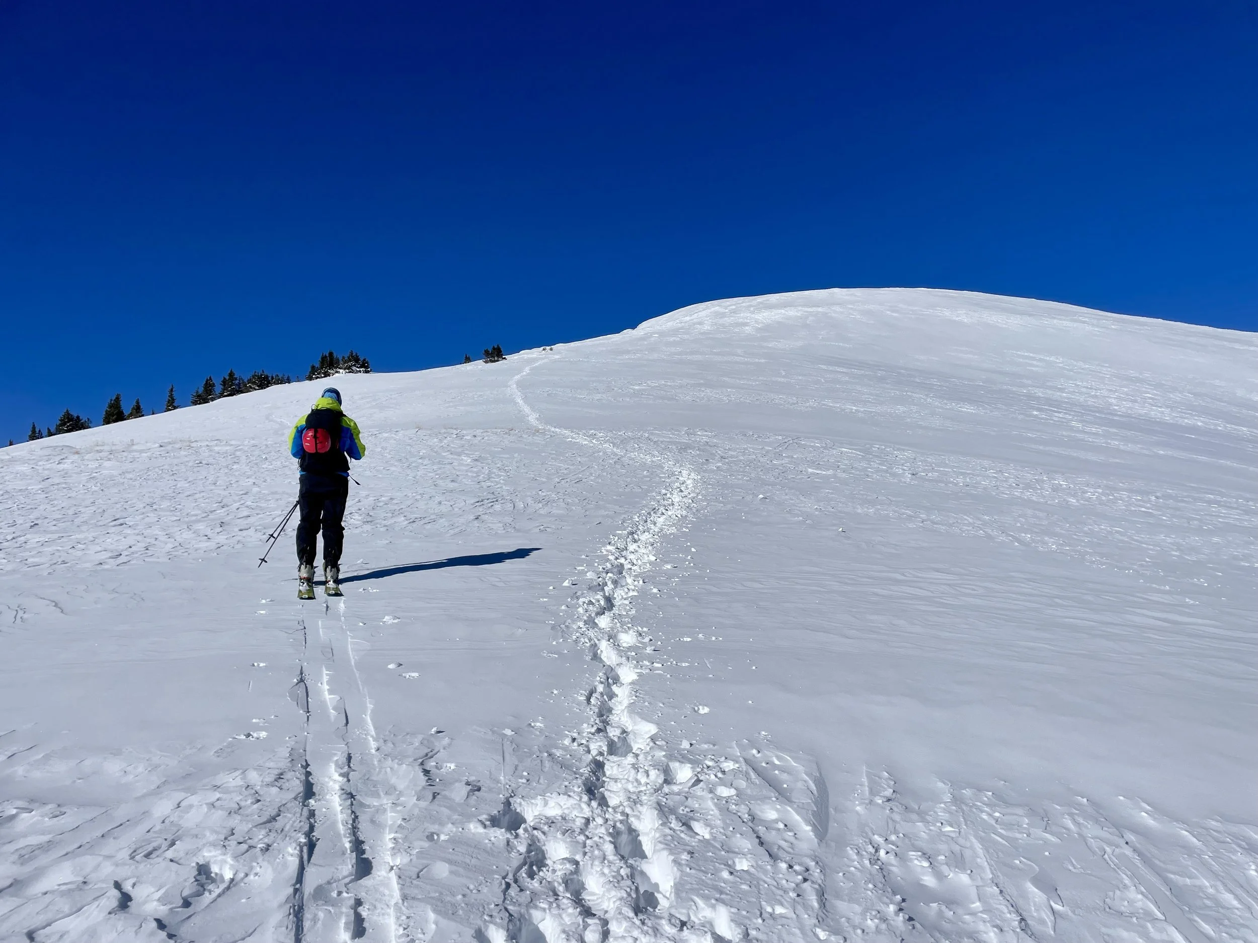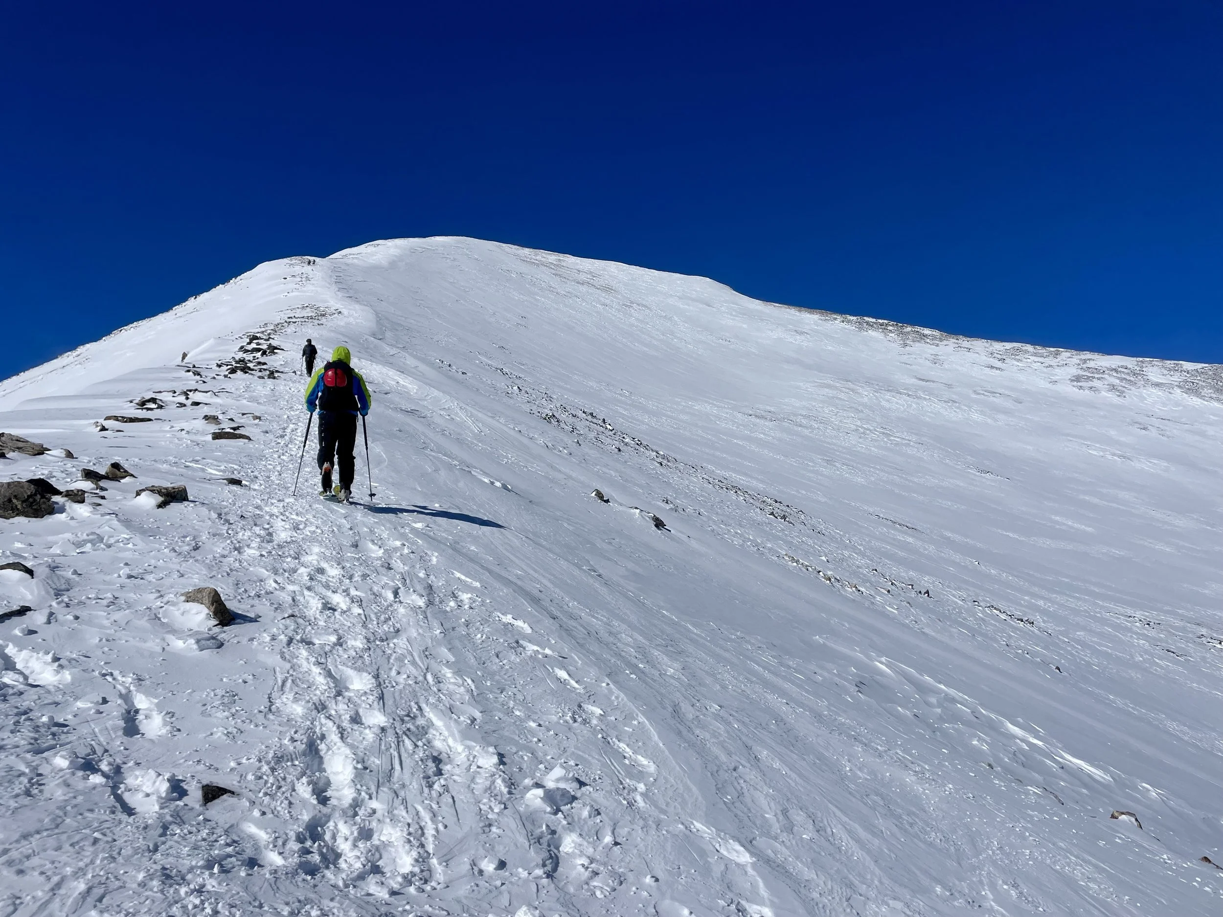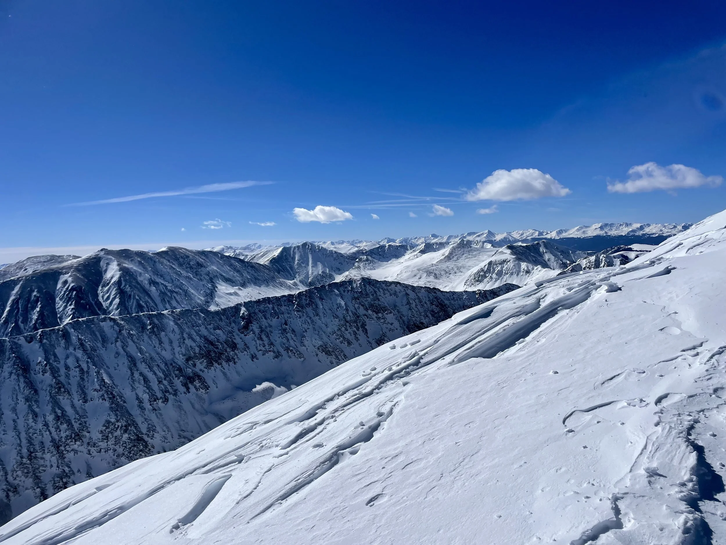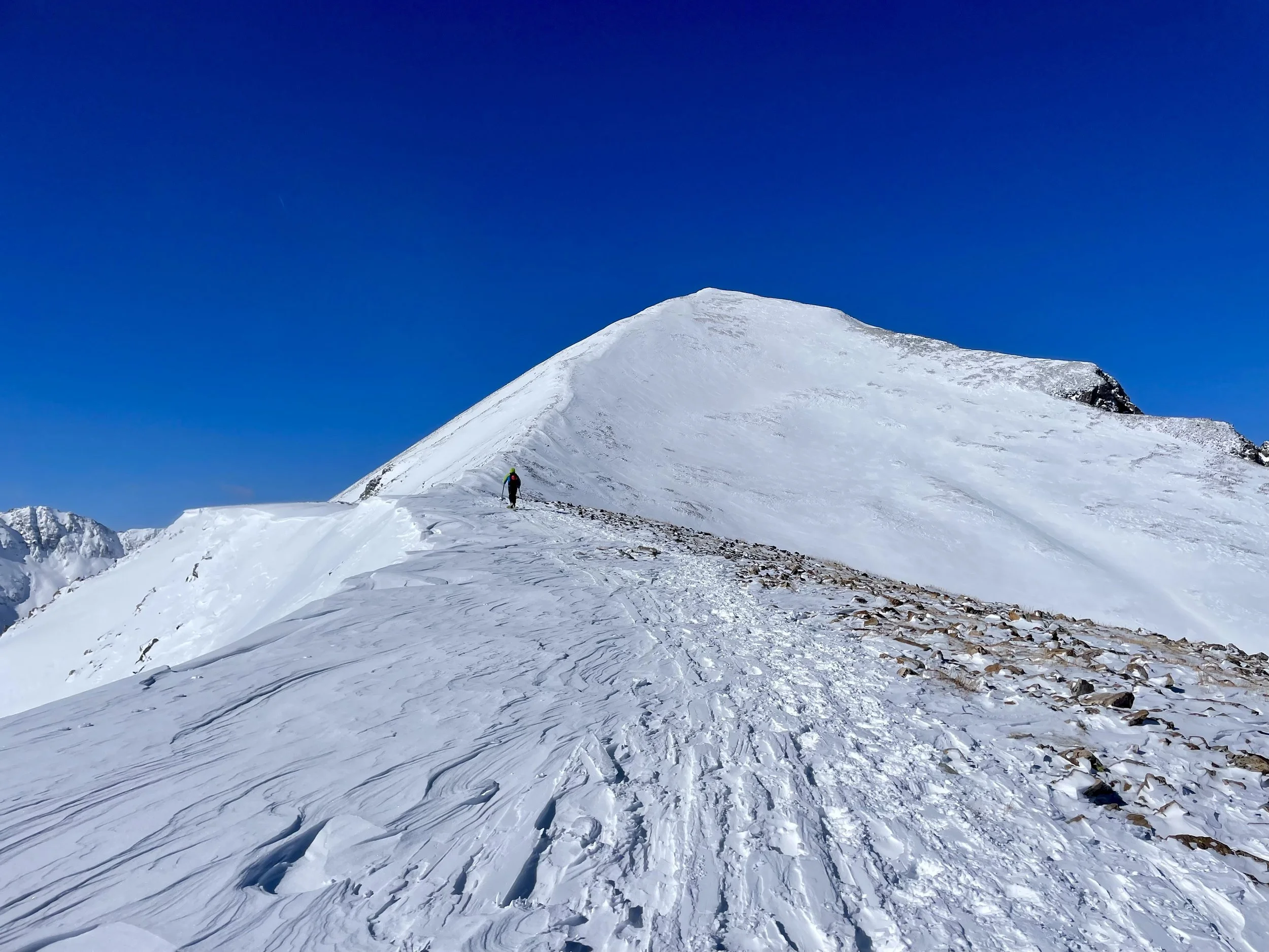 We started out that morning from the Quandary Peak trailhead in Blue River, which at the time of writing does not require reservations in the winter (you need reservations to park there in the summer). We started skinning up the summer hiking trail route, which is what we followed to the top of the mountain for the most part. It was a beautiful bluebird day with no wind below treeline. Once we got above treeline, the winds started to pick up as they typically do on this peak. We continued skinning up along the ridge and only needed to take off our skis for one short section to walk over the exposed rocks. As we approached the final saddle and could see the condition of the upper bowl better, we realized it wasn’t going to be a great ski down. This was confirmed when we needed to put on ski crampons to make it up the last part of the ridge to the top. I have skinned up Quandary a few times before and this was the first time I needed ski crampons.