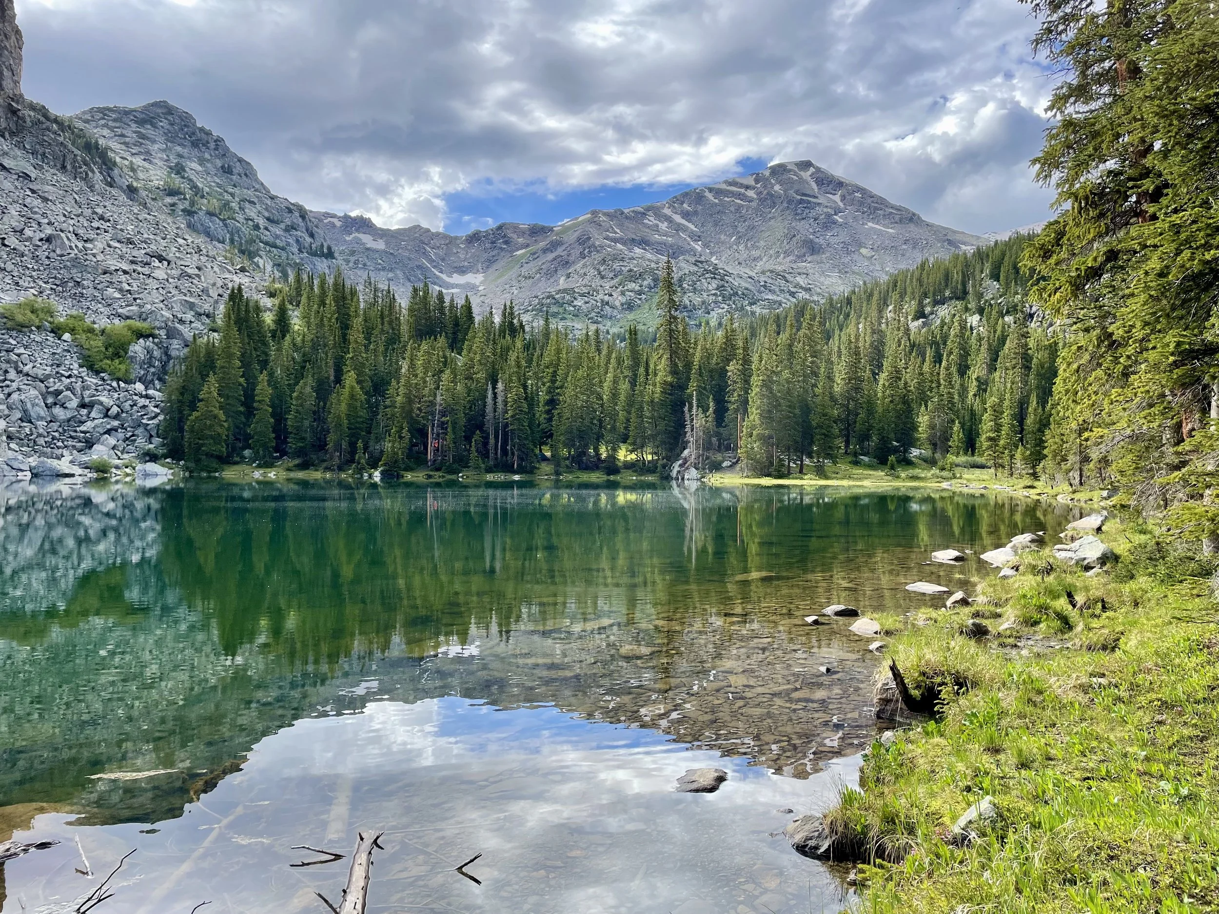 As we got above tree line, we ran into several sections with snow that we had to traverse across. Thankfully, they were all pretty easy to walk through. We had thought snow would be our biggest obstacle, but the marshy terrain towards the top of the pass ended up giving us the most problems. After I ended up getting both feet totally wet in the marsh, we decided to hike the next 3/4 of a mile in crocs. I’m glad we didn’t end up running into anyone because we probably would have gotten a few looks. As we approached the top of the pass, the clouds were starting to get darker so we didn’t linger at the top of the pass for long and started our descent towards the Seven Sisters Lakes. This part of the hike was new to me and the lakes were each incredibly beautiful. I was wishing it was later in the summer when thunderstorms are less likely, and it would have been safer to camp above tree line. I’ll have to save that trip for another time because unfortunately on this day there was an 80% chance of an afternoon thunderstorm so we continued towards tree line.