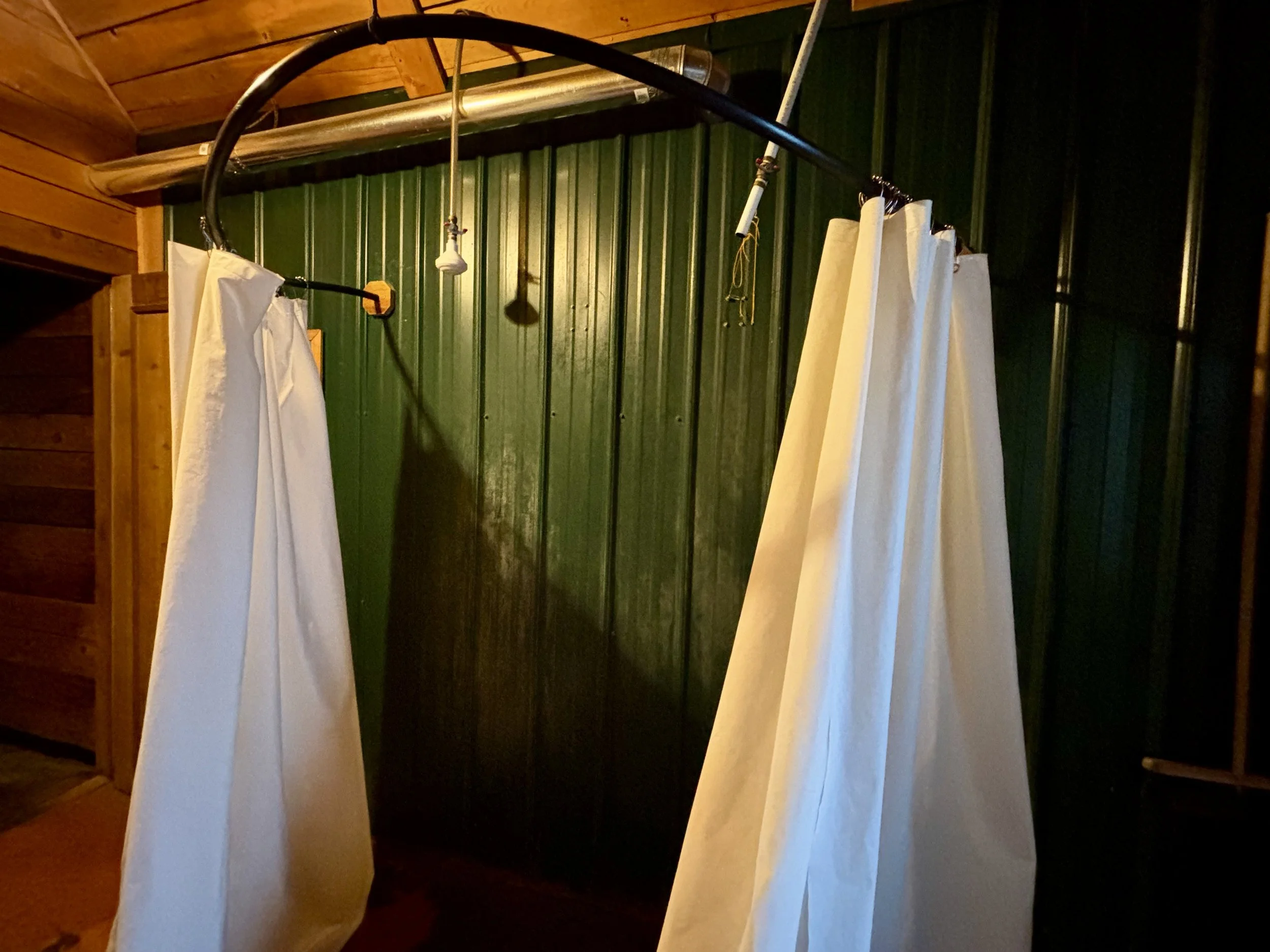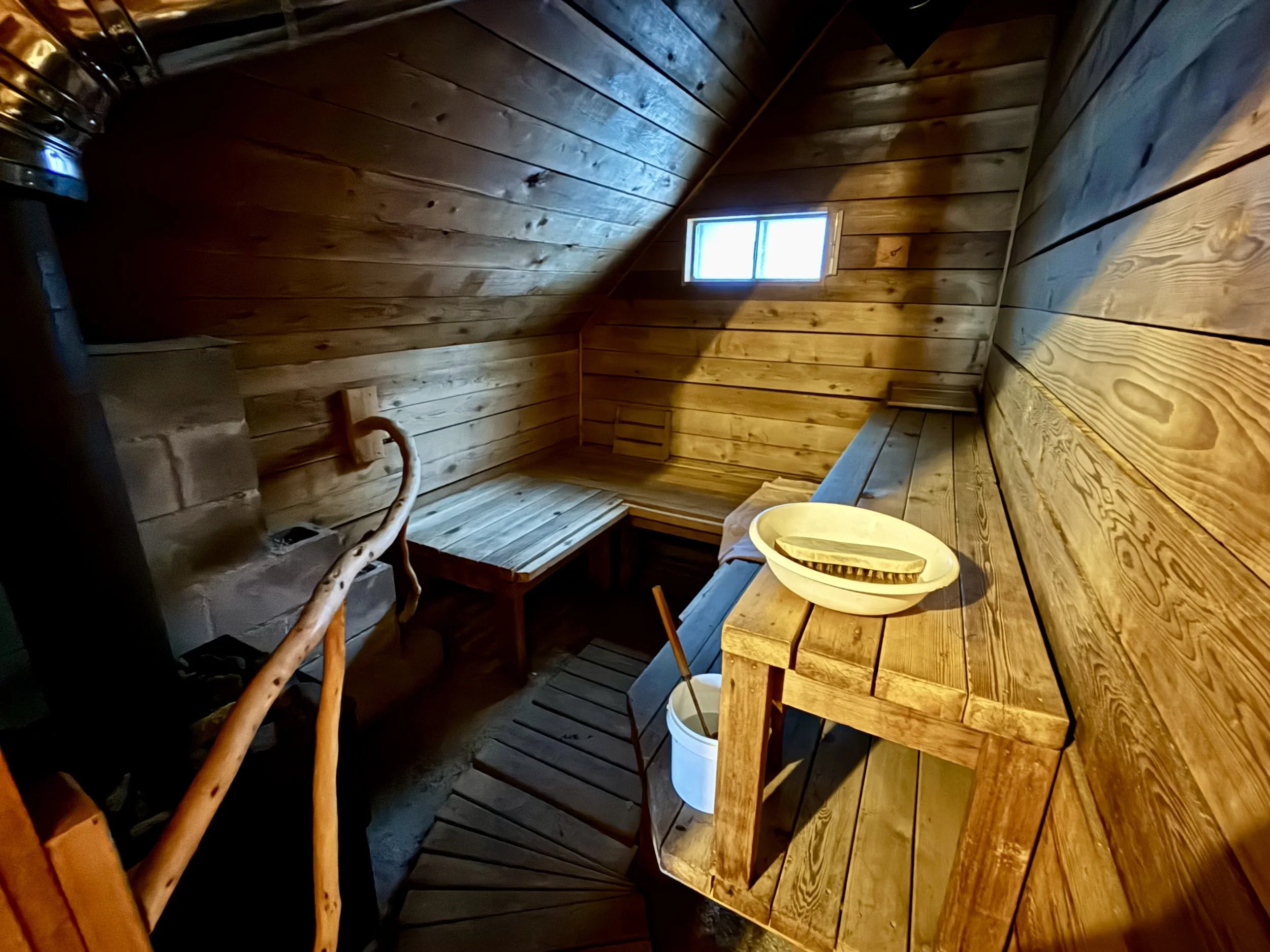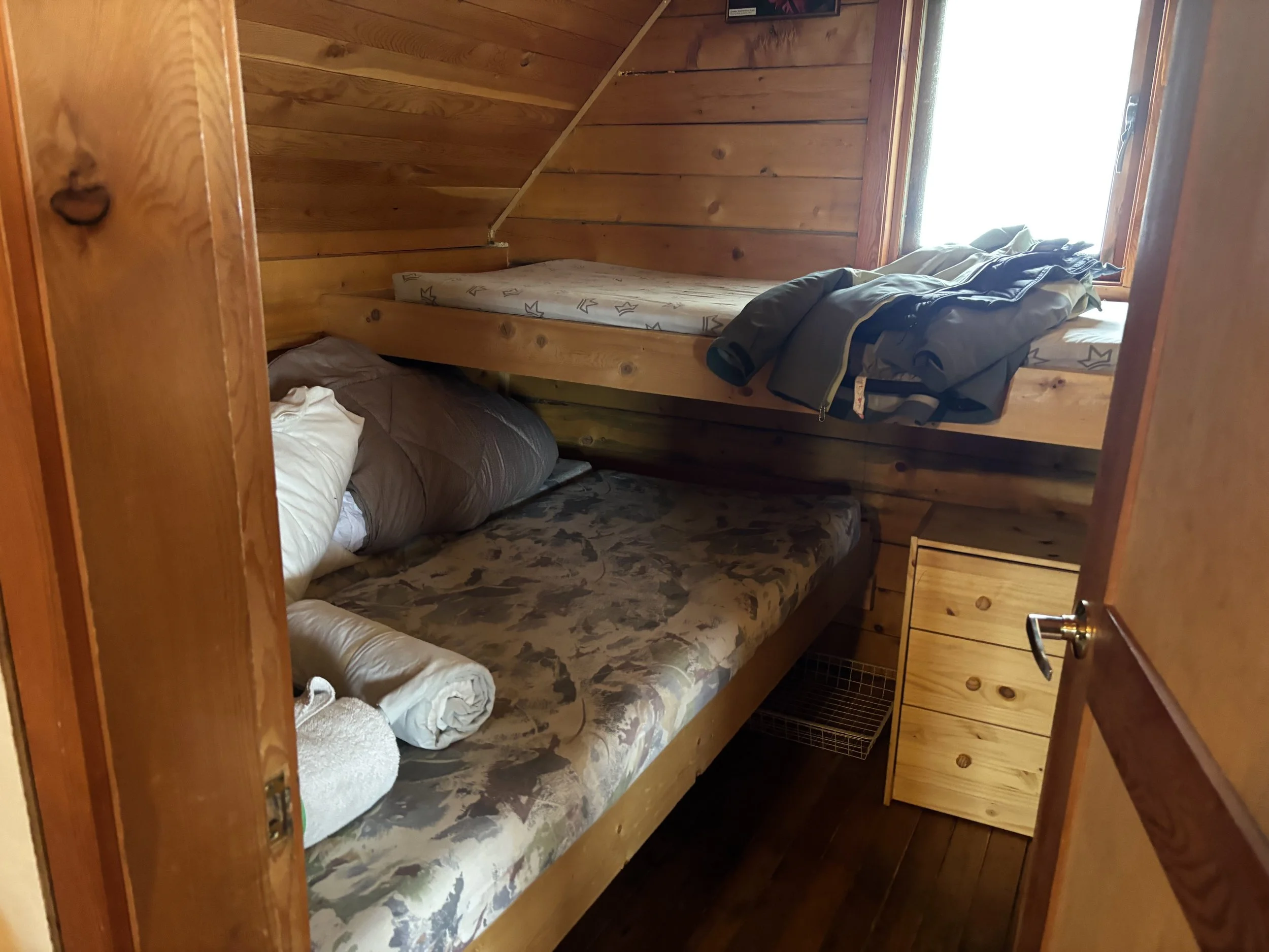 In terms of hut layout, we comfortably slept 11 guests. The kitchen and eating area were both on the main floor. There were also two bedrooms on the main floor, one with two beds that slept two and another with two bunk beds that slept four. Upstairs, there were three additional bedrooms that had two beds in each room. The two rooms on the main floor are much cooler than the rooms upstairs. I slept in a room on the main floor and still found myself opening our window to cool it off frequently. The main floor also has two sinks with running water, which is really nice for refilling water bottles, washing hands, and brushing teeth. On the bottom floor there was the guides’ quarters (I didn’t see what it looked like), a sauna, and a dressing room with a shower (cold water only) in it. There is a way to warm up water for a warmer shower, but it seemed like such a hassle that I didn’t use it. I did use the cold shower almost every day, which I actually found to feel quite nice after a hot sauna. The outhouse has three stalls and requires walking outside to get to it as it is a few hundred feet from the hut. One quirky thing about the hut is that they ask that you don’t go outside during the night to use the restroom. They ask guests to pee in a bottle (that they provide). The bottles are mostly old peanut butter jars. My recommendation for ladies is to consider bringing a shewee or something similar.