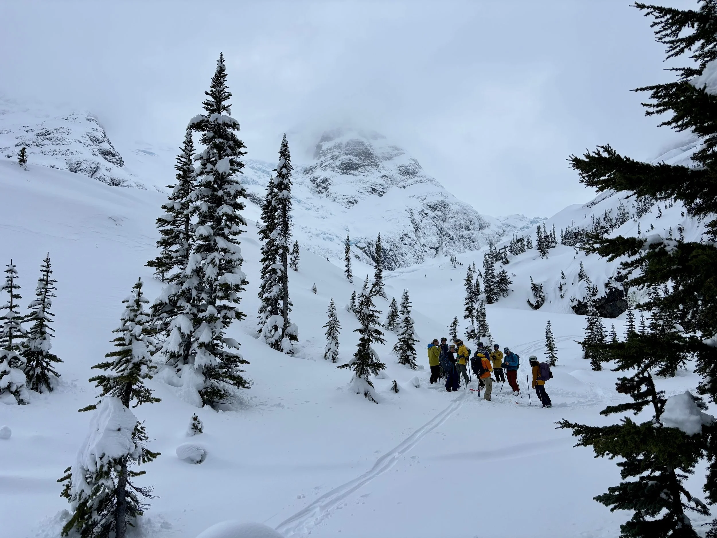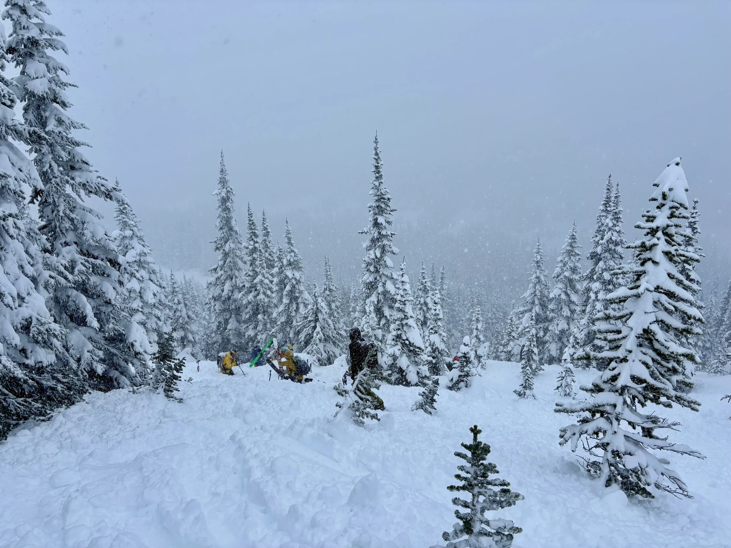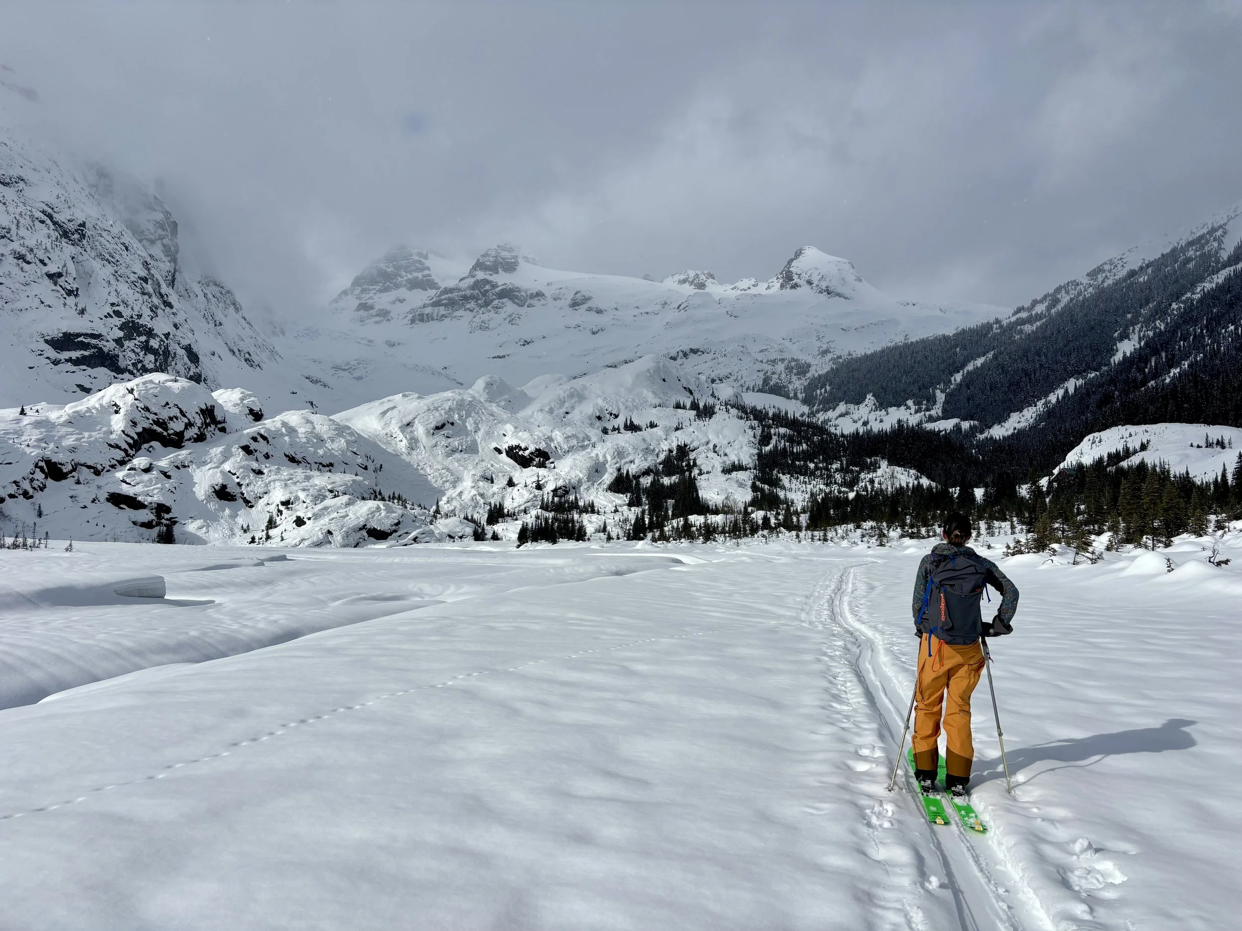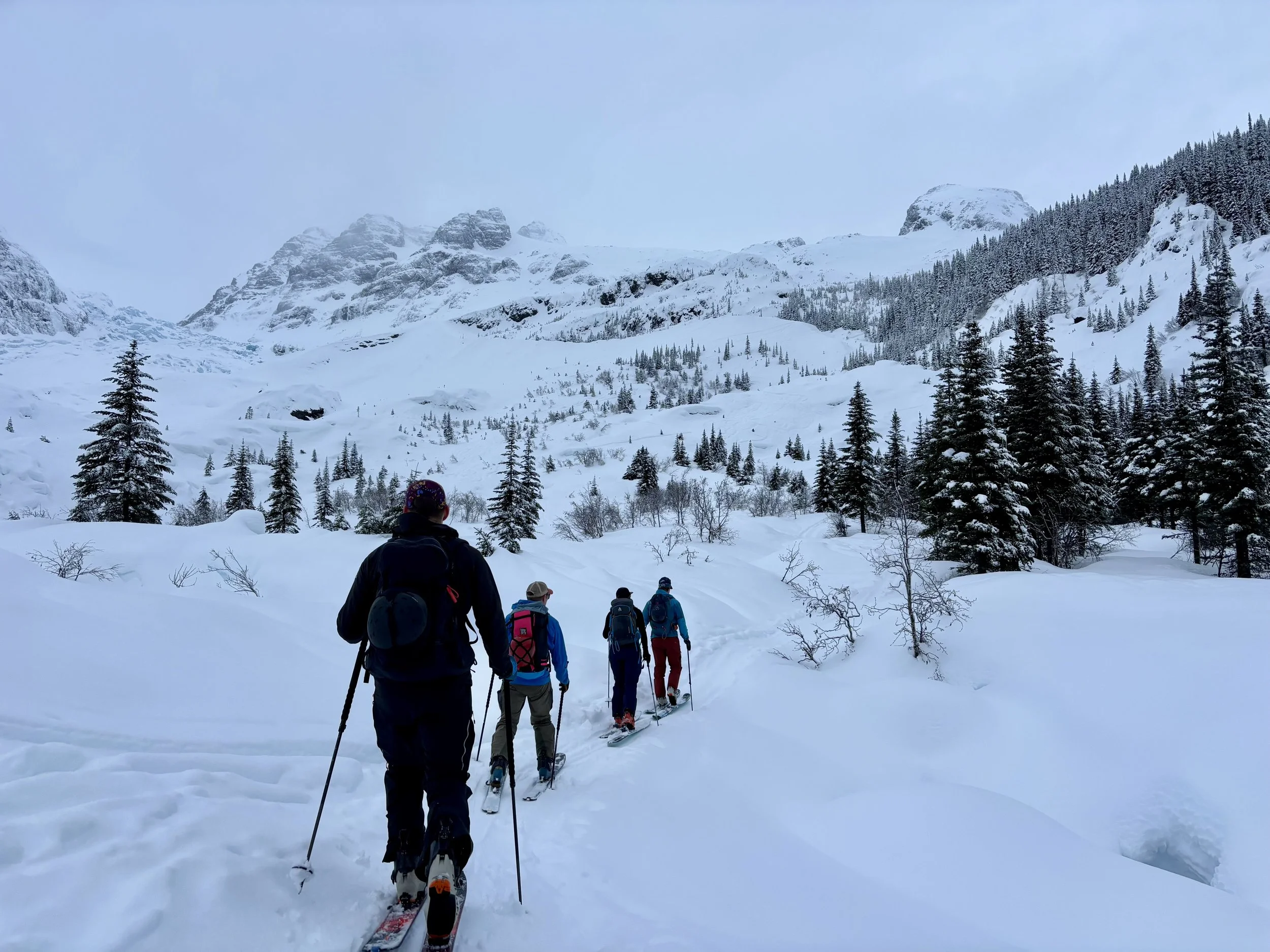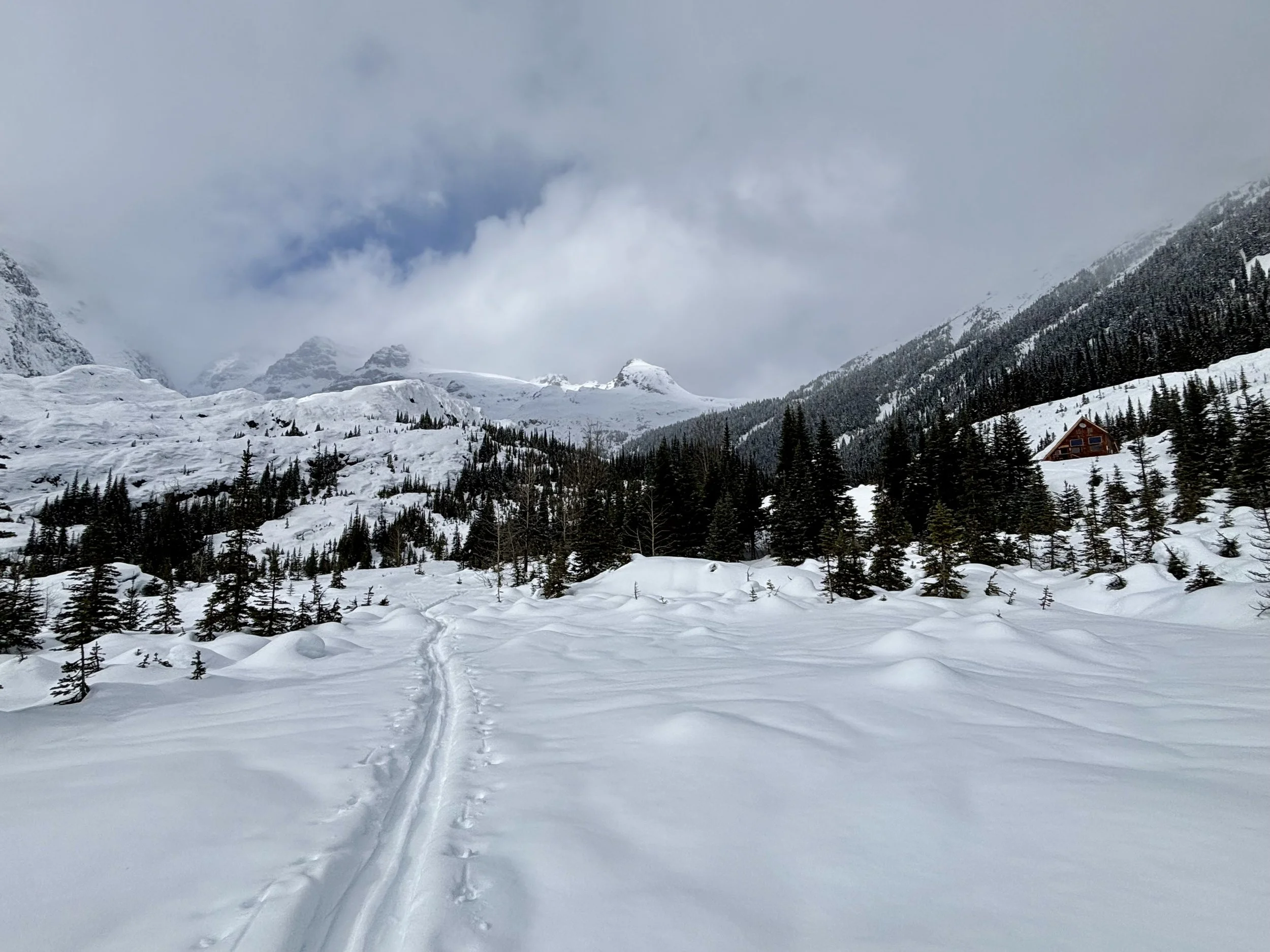 Feeling like I was in a better mindset after the day off, I decided to head out skiing again the following day. We once again took the skin track up towards Tom George. At the decision point of whether we should go to the glacier or ski the trees, I voted trees with the primary reason being it was totally flat light, and I was worried about getting injured if we went up any higher. I said the snow where we were standing at the bottom of the trees felt quite good and it was what I wanted to ski. I was then told by Conor that the snow in the trees had a crust that wouldn’t ski well and risk of injury was high there. I didn’t observe this crust he mentioned and think it was just a way to convince us to go up to the alpine. Once again frustrated, I followed the group up to the alpine. Once we got to the spot where we had turned around 2 days before, I voiced that I was 100% going to turn around regardless of what others wanted to do because visibility was so poor, and I didn’t want to be in connected, alpine avalanche terrain with a large group of people in considerable avalanche danger with limited visibility (our guides rated the avalanche danger as considerable that day above tree line, while AvCan rated it as high - I did not know this at the time. The avalanche forecast for the region said “Dangerous avalanche conditions exist. Avoid large slopes, overhead hazards, and steep terrain” ). So the group split up and several of us skied back down the way we had come up with one of the guides. On the way down, I had zero visibility and at one point found myself in free fall into a wind scoop. This was exactly what I was trying to avoid. Thankfully, I was uninjured and able to get out of the scoop by myself. We then headed over to the trees that I had pushed to ski earlier than morning. As we were ascending, remarks were made about how good the snow felt from others. I agreed and this is why I wanted to ski this terrain in the first place! When Conor met us there on his second lap, he said that because we gave the slope time, the crust disappeared. It had been maybe an hour since he had made the comment about the crust in the first place and there was no sun or warm temps to soften the snow. What made the originally mentioned “crust” disappear? I think the fact that it didn’t exist in the first place. I did two laps in the trees and then we headed back to the hut.