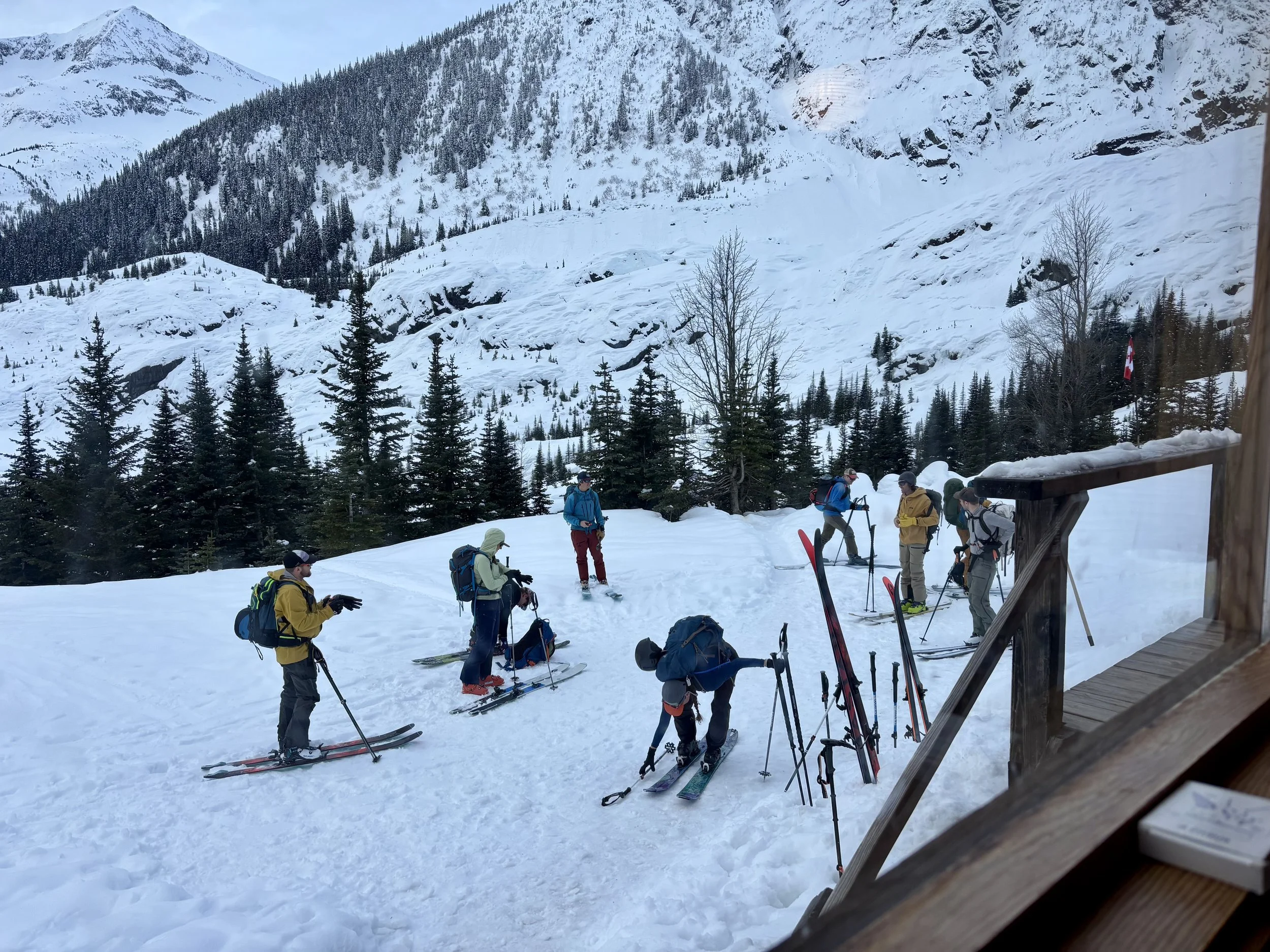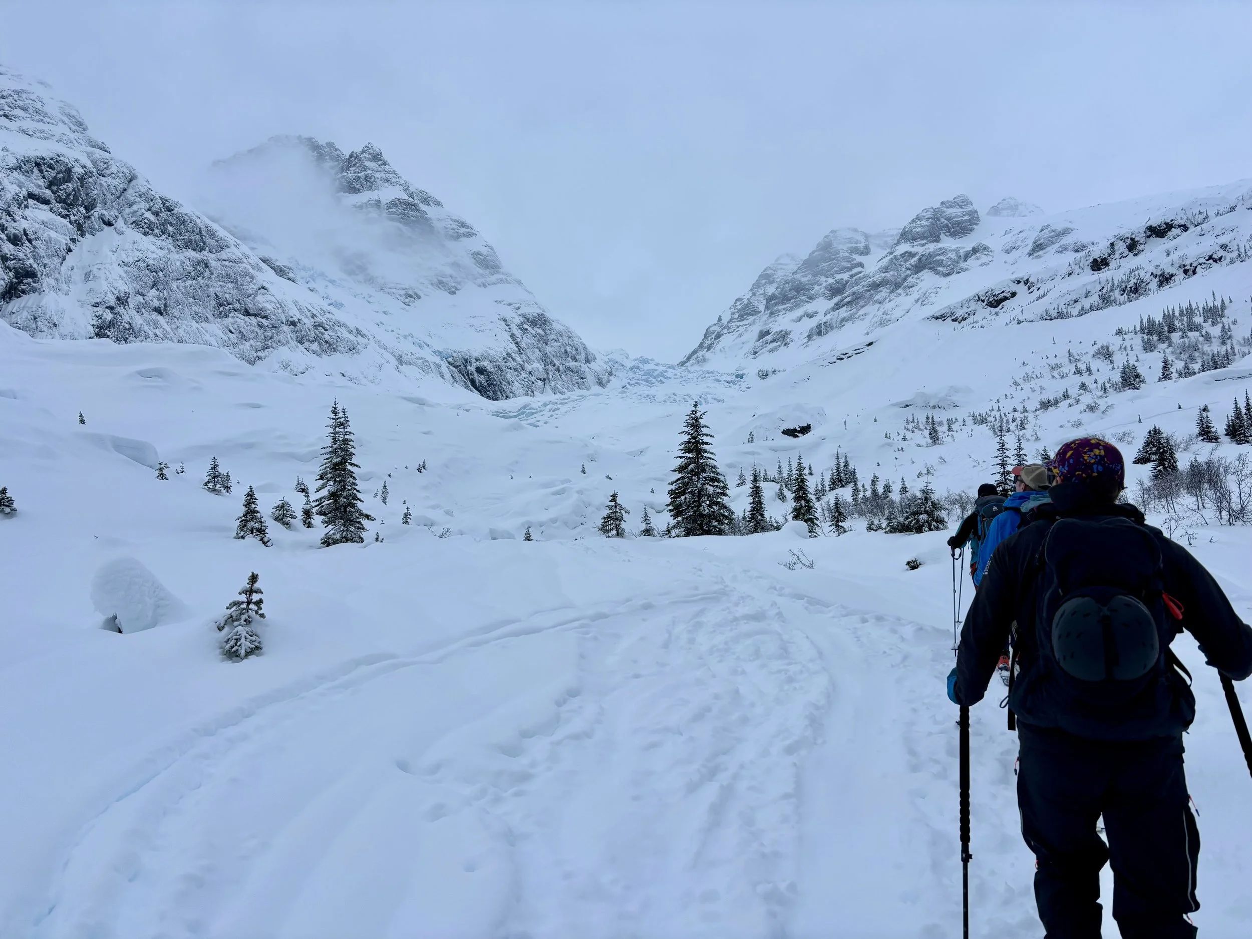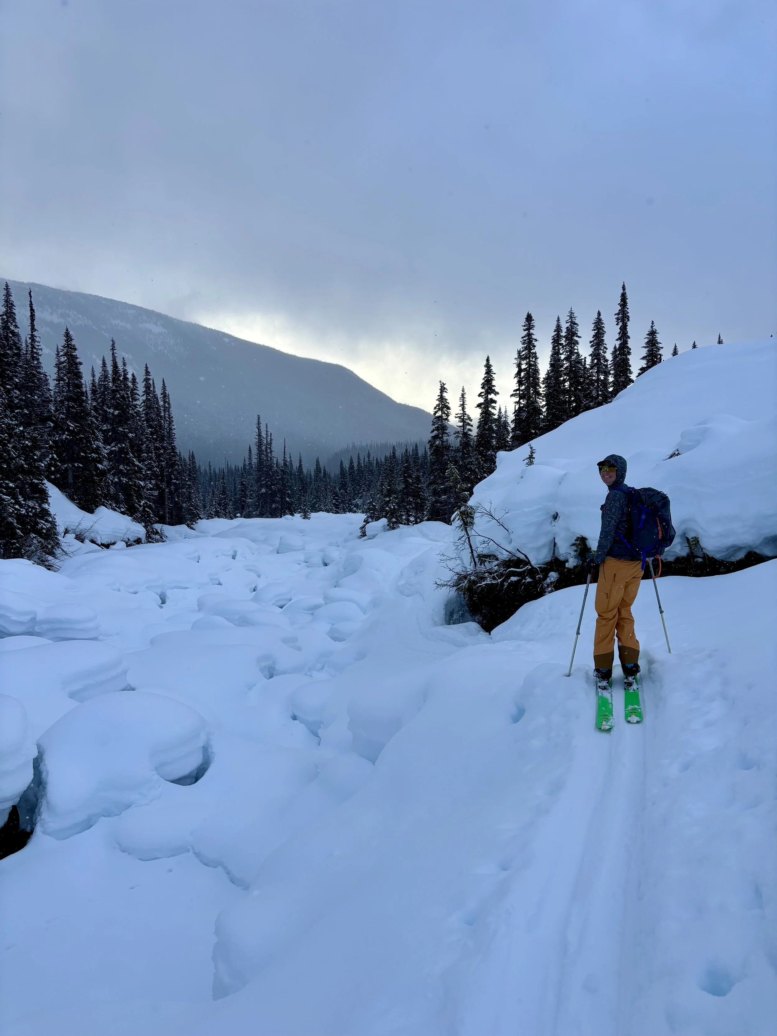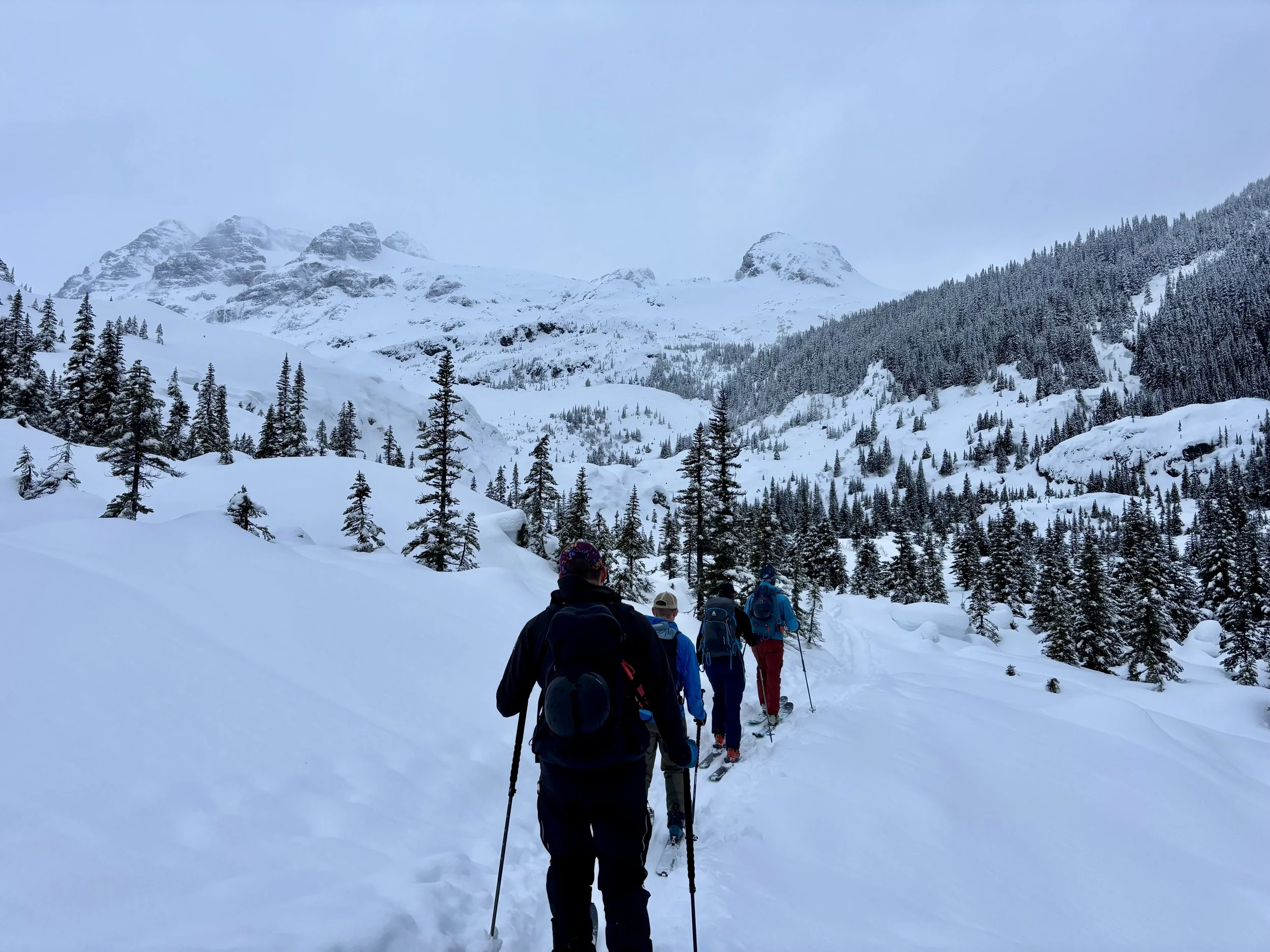 Feeling like I was in a better mindset after the day off, I decided to head out skiing again the following day. We once again took the skin track up towards Tom George. At the decision point of whether we should go to the glacier or ski the trees, I voted trees with the primary reason being it was totally flat light, and I was worried about getting injured if we went up any higher. I said the snow where we were standing at the bottom of the trees felt quite good and it was what I wanted to ski. I was then told by Conor that the snow in the trees had a crust that wouldn’t ski well and risk of injury was high there. I didn’t observe this crust he mentioned and think it was just a way to convince us to go up to the alpine. Once again frustrated, I followed the group up to the alpine. Once we got to the spot where we had turned around 2 days before, I voiced that I was 100% going to turn around regardless of what others wanted to do because visibility was so poor, and I didn’t want to be in connected, alpine avalanche terrain with a large group of people in considerable avalanche danger with limited visibility (our guides rated the avalanche danger as considerable that day above tree line, while AvCan rated it as high - I did not know this at the time. The avalanche forecast for the region said “Dangerous avalanche conditions exist. Avoid large slopes, overhead hazards, and steep terrain” ). So the group split up and several of us skied back down the way we had come up with one of the guides. On the way down, I had zero visibility and at one point found myself in free fall into a wind scoop. This was exactly what I was trying to avoid. Thankfully, I was uninjured and able to get out of the scoop by myself. We then headed over to the trees that I had pushed to ski earlier than morning. As we were ascending, remarks were made about how good the snow felt from others. I agreed and this is why I wanted to ski this terrain in the first place! When Conor met us there on his second lap, he said that because we gave the slope time, the crust disappeared. It had been maybe an hour since he had made the comment about the crust in the first place and there was no sun or warm temps to soften the snow. What made the originally mentioned “crust” disappear? I think the fact that it didn’t exist in the first place. I did two laps in the trees and then we headed back to the hut.