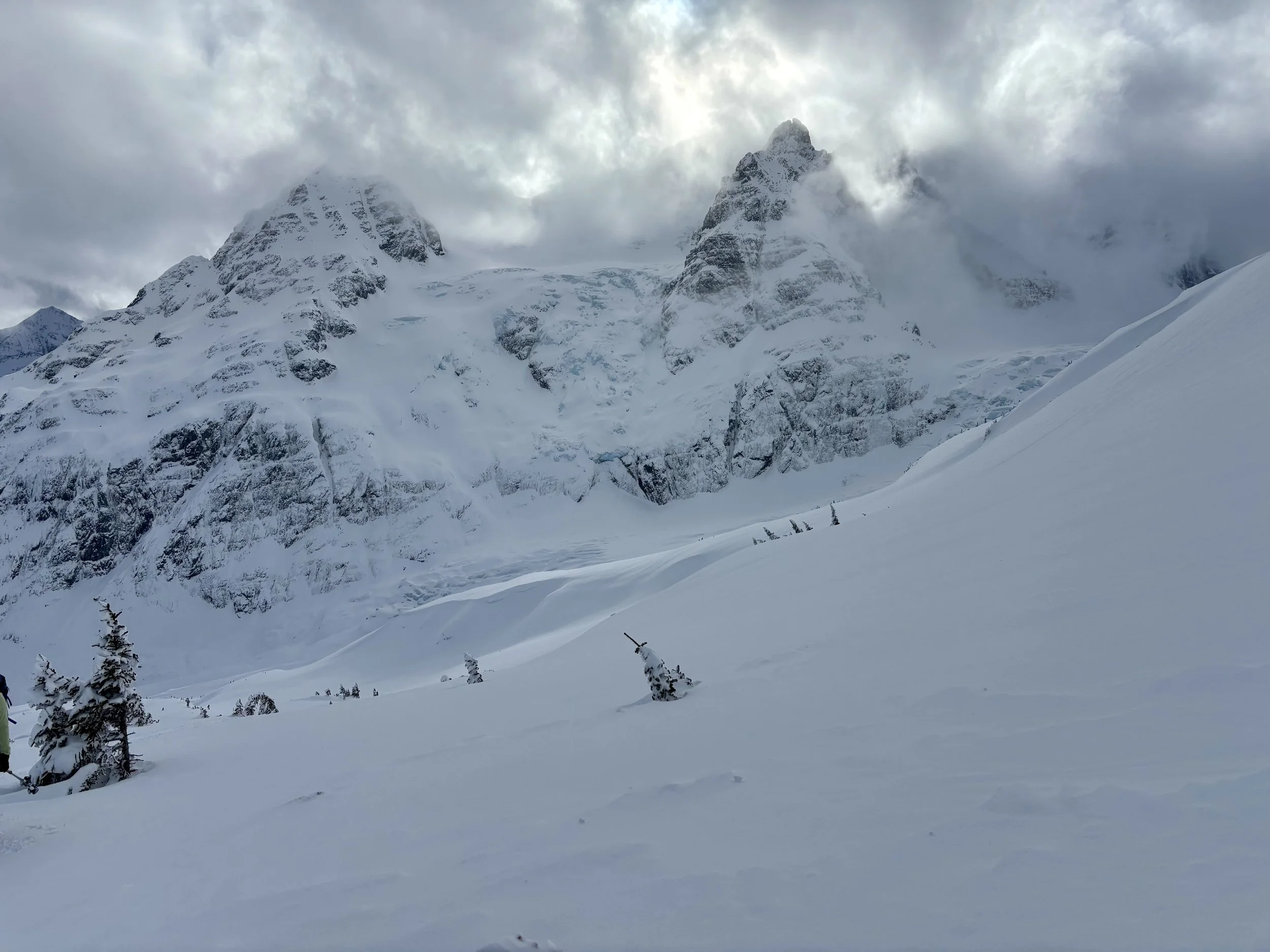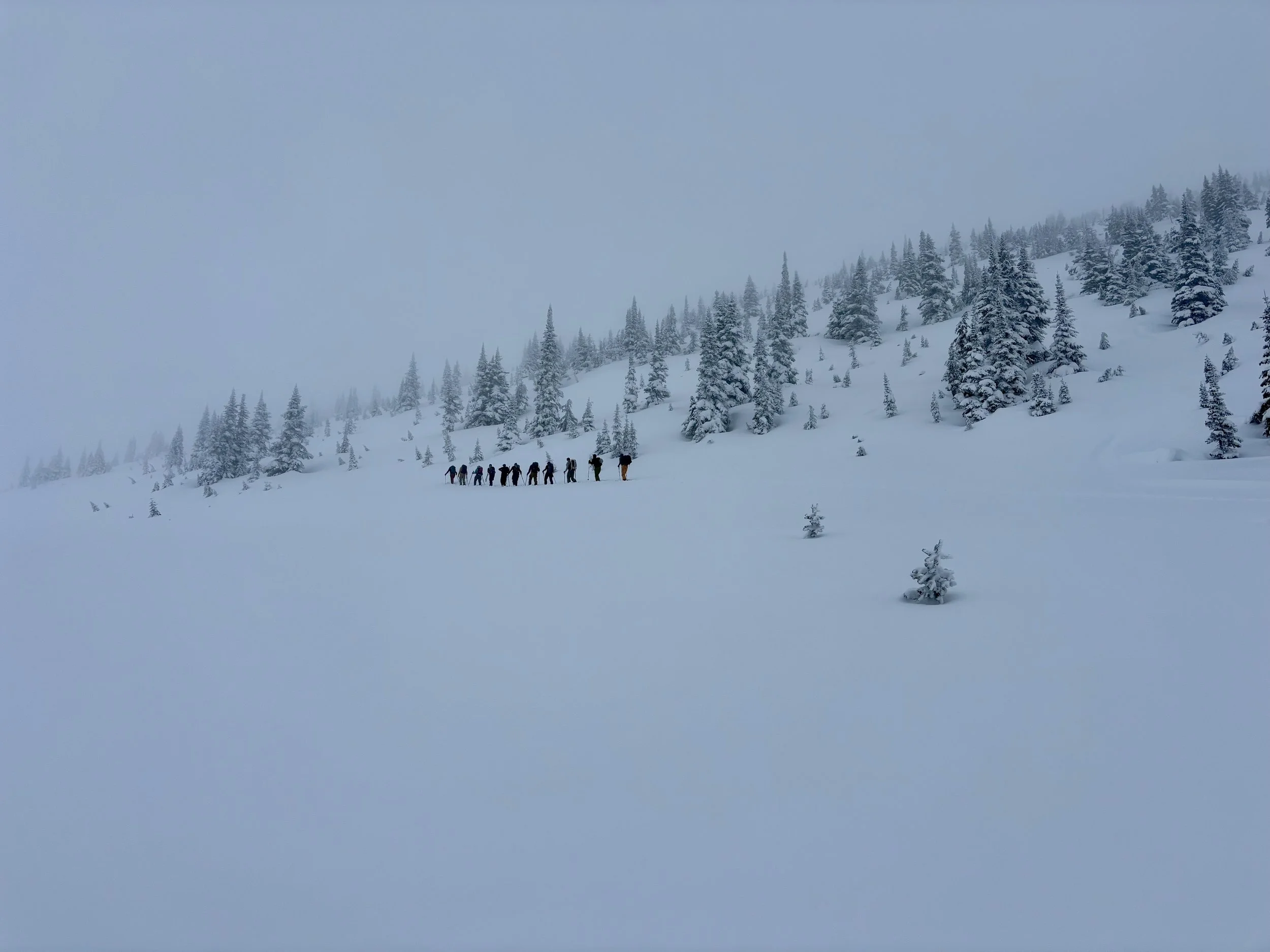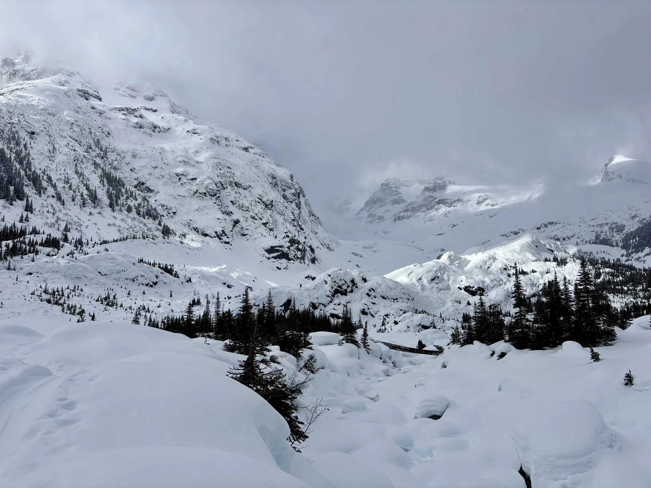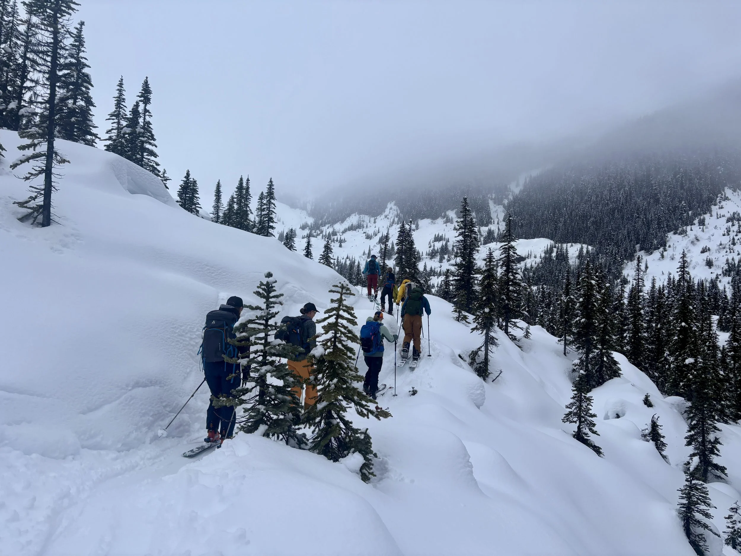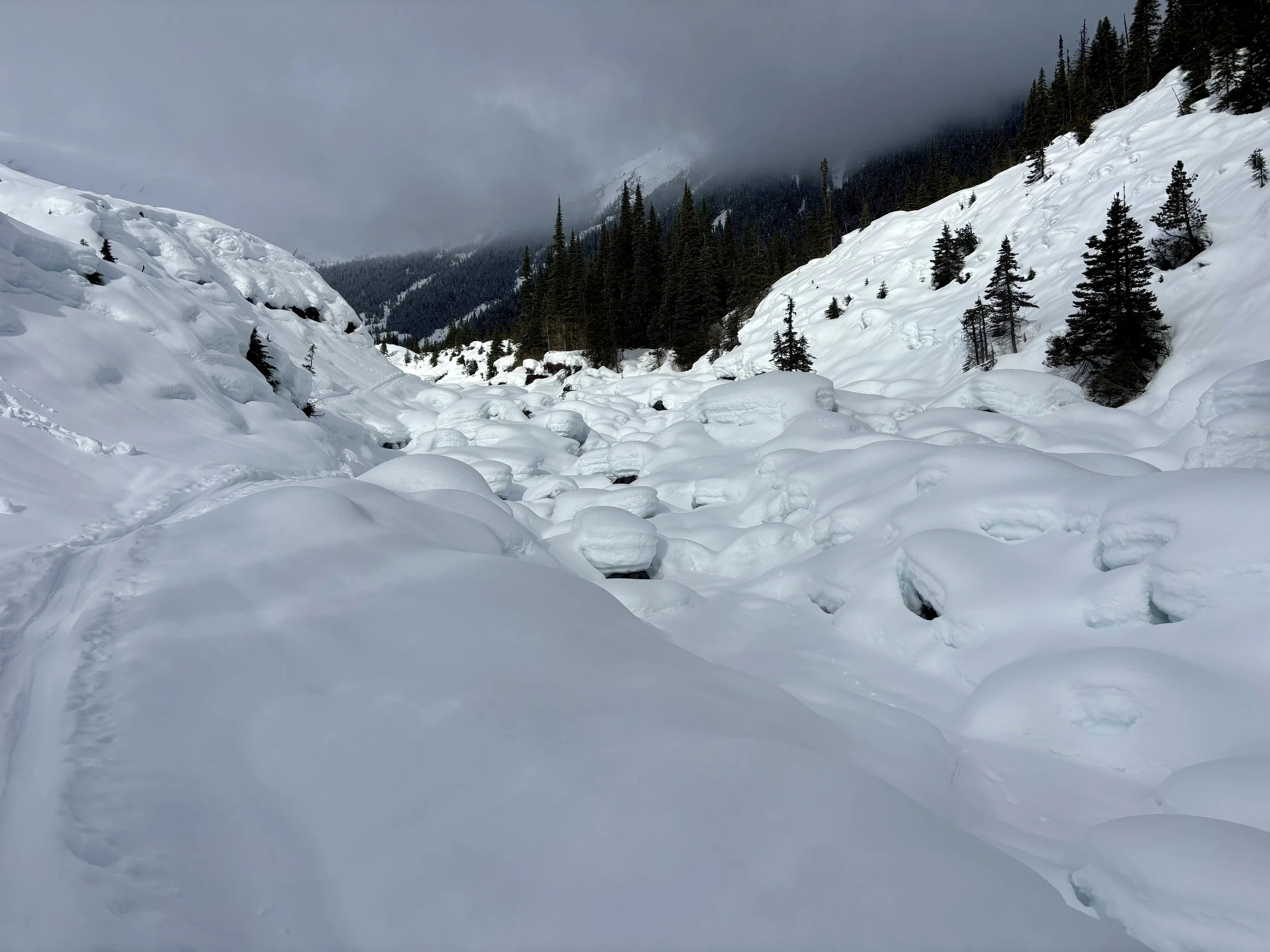 Feeling like I was in a better mindset after the day off, I decided to head out skiing again the following day. We once again took the skin track up towards Tom George. At the decision point of whether we should go to the glacier or ski the trees, I voted trees with the primary reason being it was totally flat light, and I was worried about getting injured if we went up any higher. I said the snow where we were standing at the bottom of the trees felt quite good and it was what I wanted to ski. I was then told by Conor that the snow in the trees had a crust that wouldn’t ski well and risk of injury was high there. I didn’t observe this crust he mentioned and think it was just a way to convince us to go up to the alpine. Once again frustrated, I followed the group up to the alpine. Once we got to the spot where we had turned around 2 days before, I voiced that I was 100% going to turn around regardless of what others wanted to do because visibility was so poor, and I didn’t want to be in connected, alpine avalanche terrain with a large group of people in considerable avalanche danger with limited visibility (our guides rated the avalanche danger as considerable that day above tree line, while AvCan rated it as high - I did not know this at the time. The avalanche forecast for the region said “Dangerous avalanche conditions exist. Avoid large slopes, overhead hazards, and steep terrain” ). So the group split up and several of us skied back down the way we had come up with one of the guides. On the way down, I had zero visibility and at one point found myself in free fall into a wind scoop. This was exactly what I was trying to avoid. Thankfully, I was uninjured and able to get out of the scoop by myself. We then headed over to the trees that I had pushed to ski earlier than morning. As we were ascending, remarks were made about how good the snow felt from others. I agreed and this is why I wanted to ski this terrain in the first place! When Conor met us there on his second lap, he said that because we gave the slope time, the crust disappeared. It had been maybe an hour since he had made the comment about the crust in the first place and there was no sun or warm temps to soften the snow. What made the originally mentioned “crust” disappear? I think the fact that it didn’t exist in the first place. I did two laps in the trees and then we headed back to the hut.
