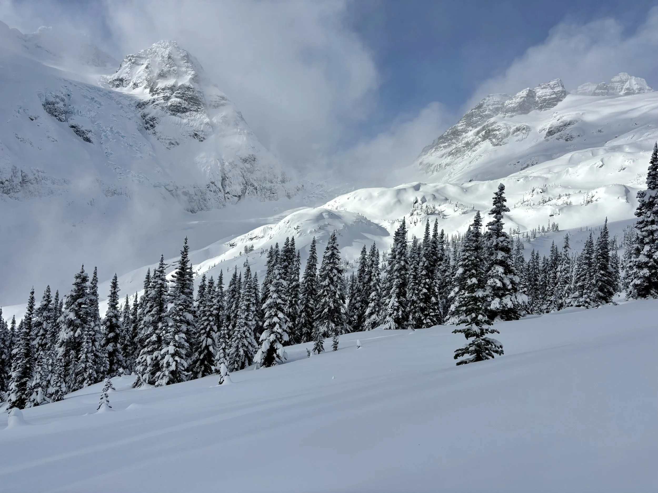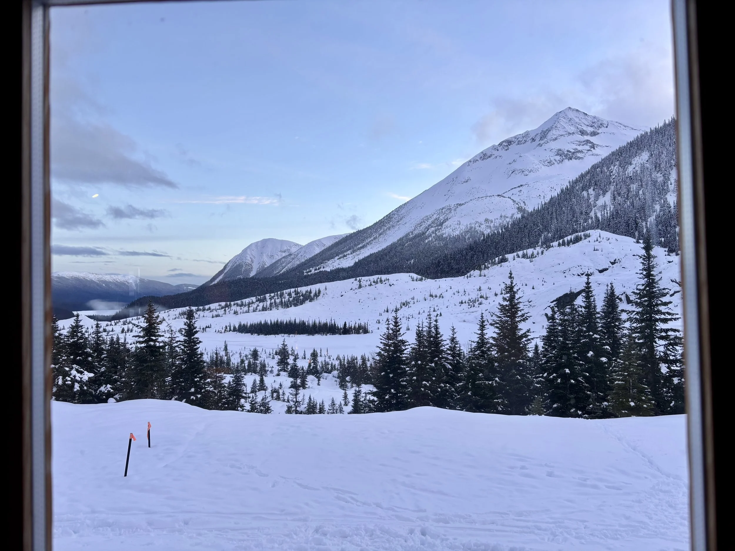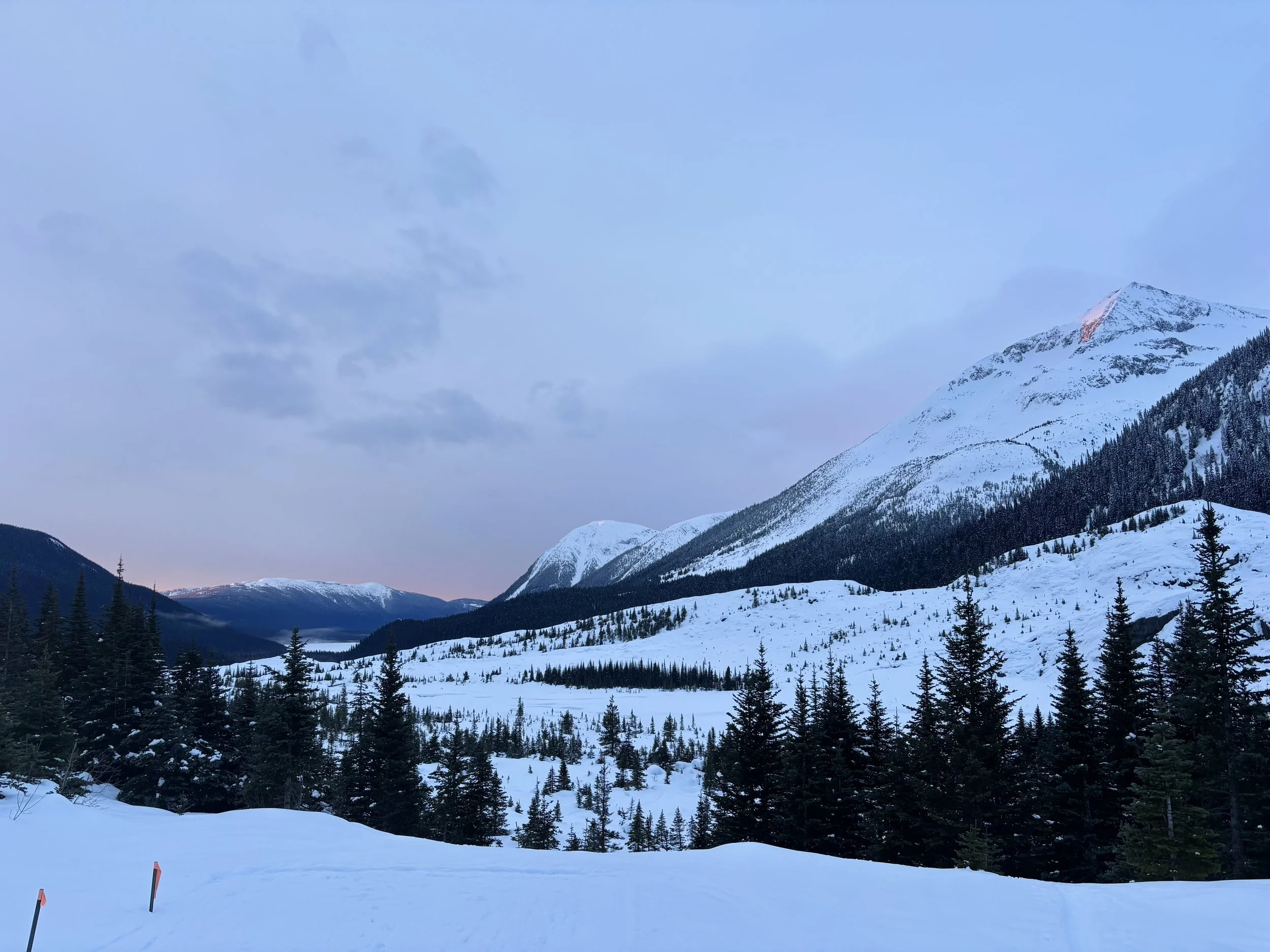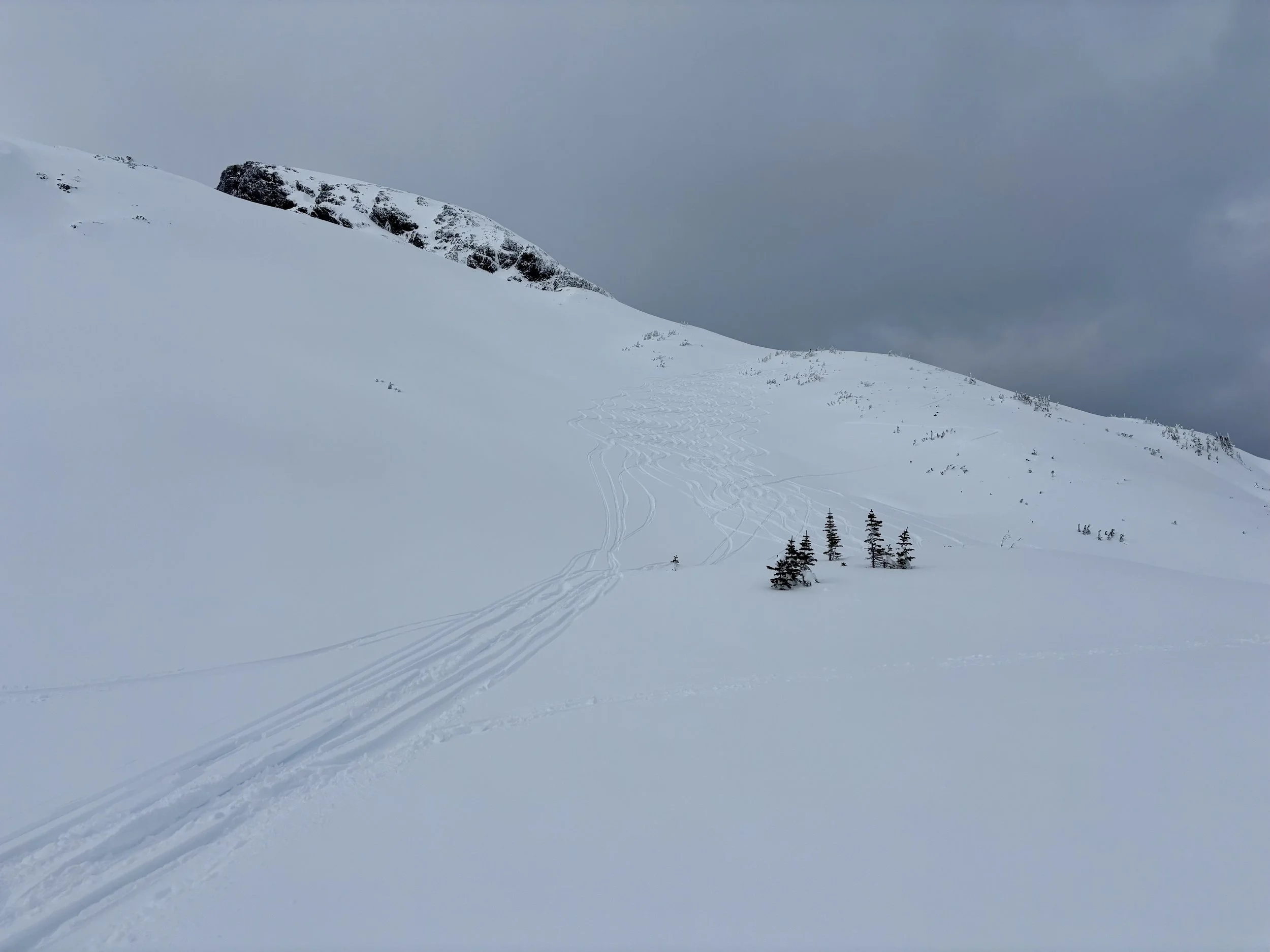 Feeling like I was in a better mindset after the day off, I decided to head out skiing again the following day. We once again took the skin track up towards Tom George. At the decision point of whether we should go to the glacier or ski the trees, I voted trees with the primary reason being it was totally flat light, and I was worried about getting injured if we went up any higher. I said the snow where we were standing at the bottom of the trees felt quite good and it was what I wanted to ski. I was then told by Conor that the snow in the trees had a crust that wouldn’t ski well and risk of injury was high there. I didn’t observe this crust he mentioned and think it was just a way to convince us to go up to the alpine. Once again frustrated, I followed the group up to the alpine. Once we got to the spot where we had turned around 2 days before, I voiced that I was 100% going to turn around regardless of what others wanted to do because visibility was so poor, and I didn’t want to be in connected, alpine avalanche terrain with a large group of people in considerable avalanche danger with limited visibility (our guides rated the avalanche danger as considerable that day above tree line, while AvCan rated it as high - I did not know this at the time. The avalanche forecast for the region said “Dangerous avalanche conditions exist. Avoid large slopes, overhead hazards, and steep terrain” ). So the group split up and several of us skied back down the way we had come up with one of the guides. On the way down, I had zero visibility and at one point found myself in free fall into a wind scoop. This was exactly what I was trying to avoid. Thankfully, I was uninjured and able to get out of the scoop by myself. We then headed over to the trees that I had pushed to ski earlier than morning. As we were ascending, remarks were made about how good the snow felt from others. I agreed and this is why I wanted to ski this terrain in the first place! When Conor met us there on his second lap, he said that because we gave the slope time, the crust disappeared. It had been maybe an hour since he had made the comment about the crust in the first place and there was no sun or warm temps to soften the snow. What made the originally mentioned “crust” disappear? I think the fact that it didn’t exist in the first place. I did two laps in the trees and then we headed back to the hut.