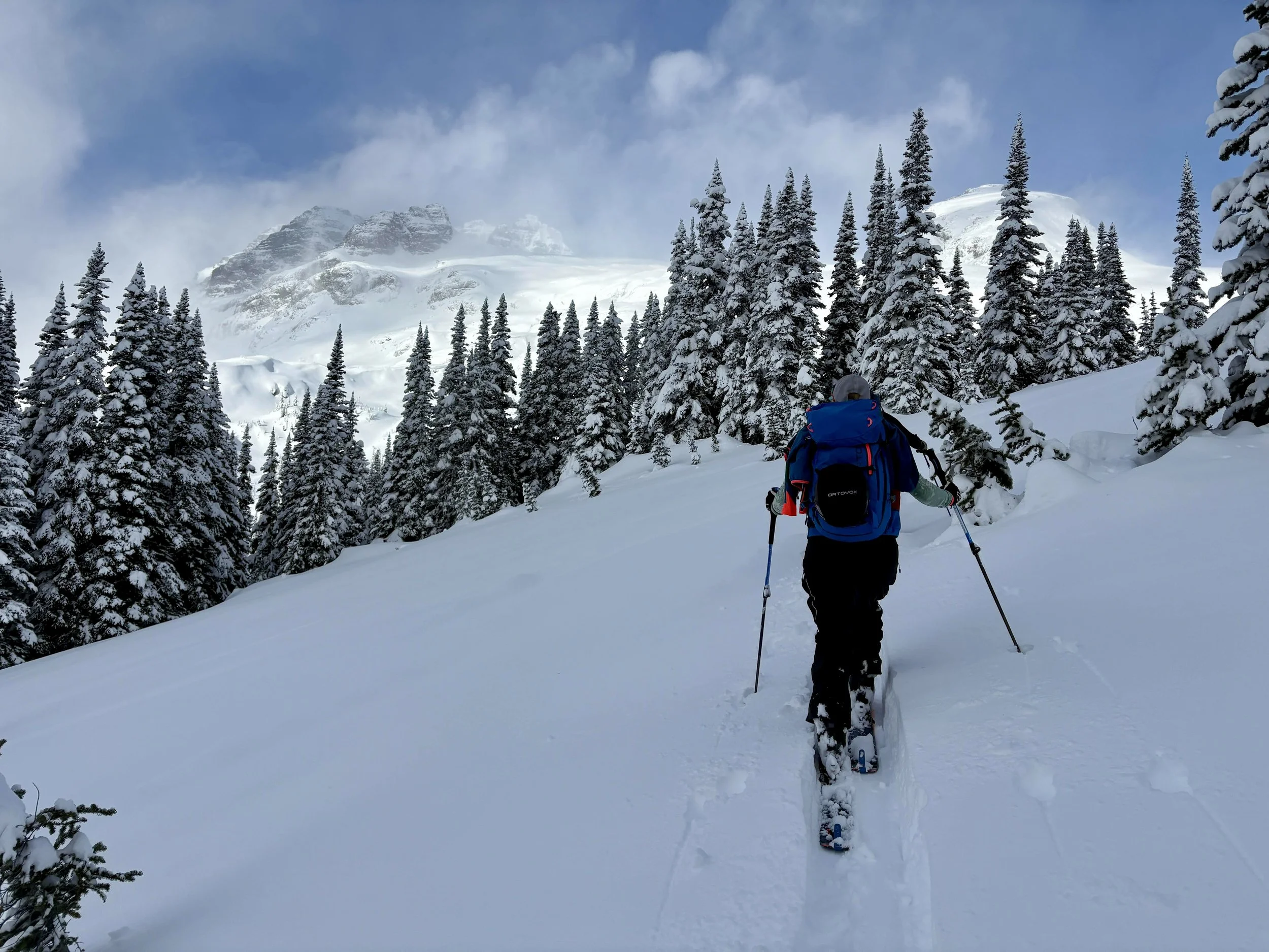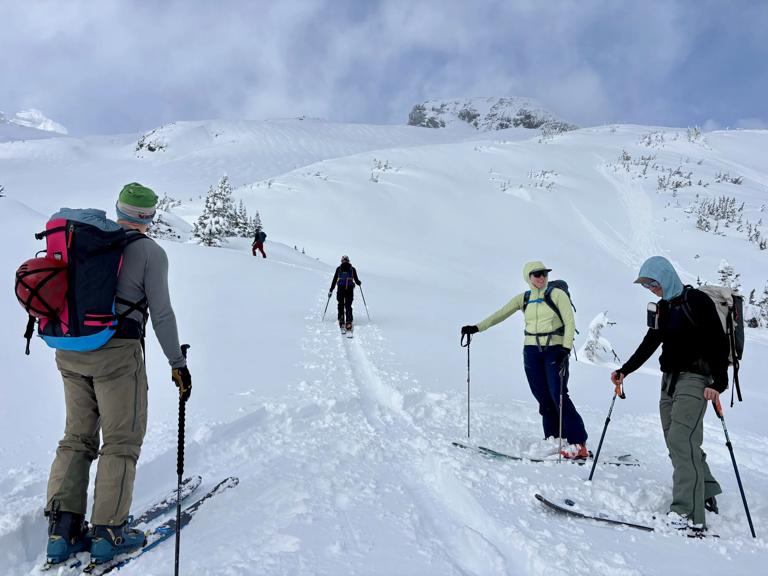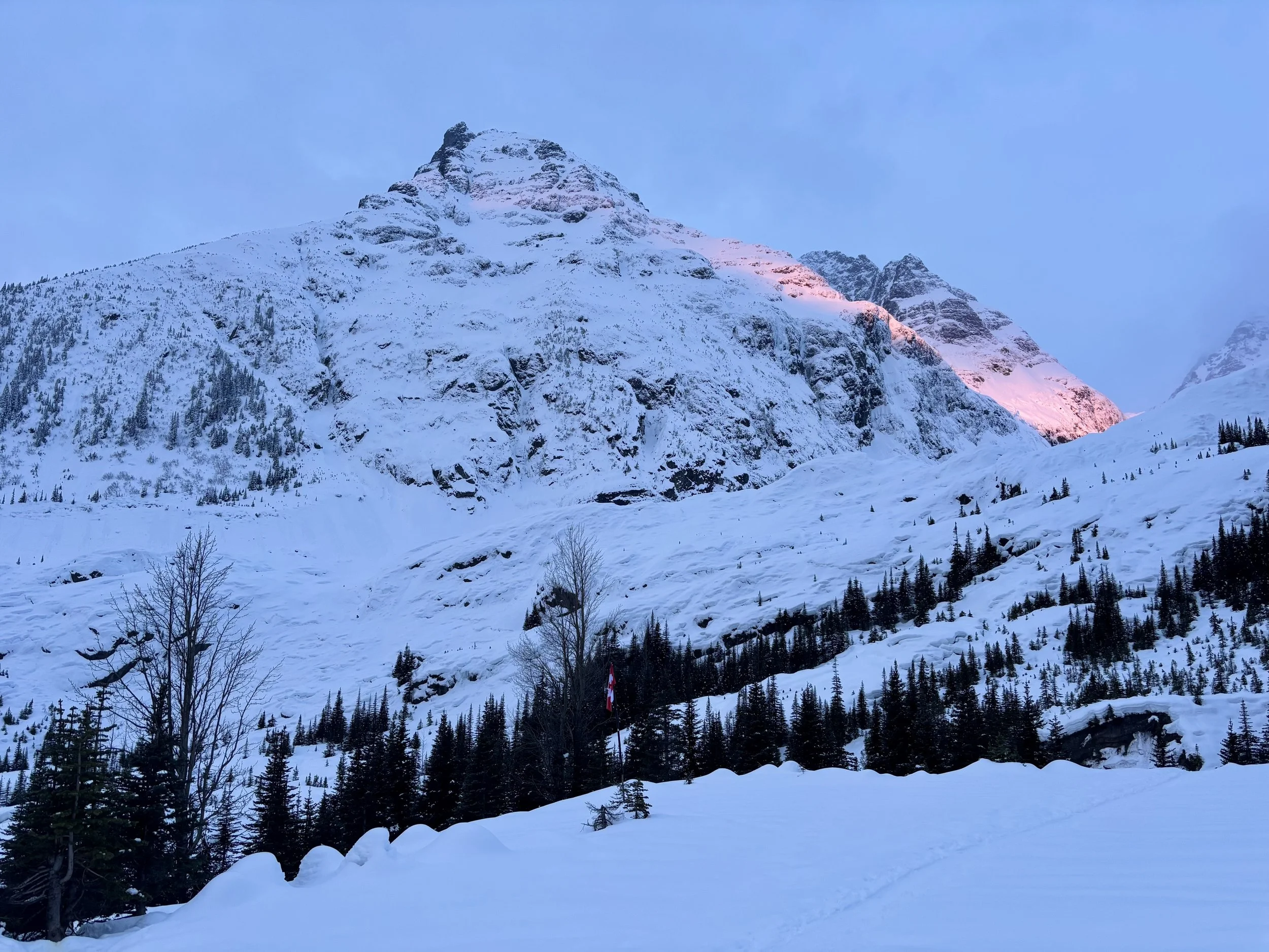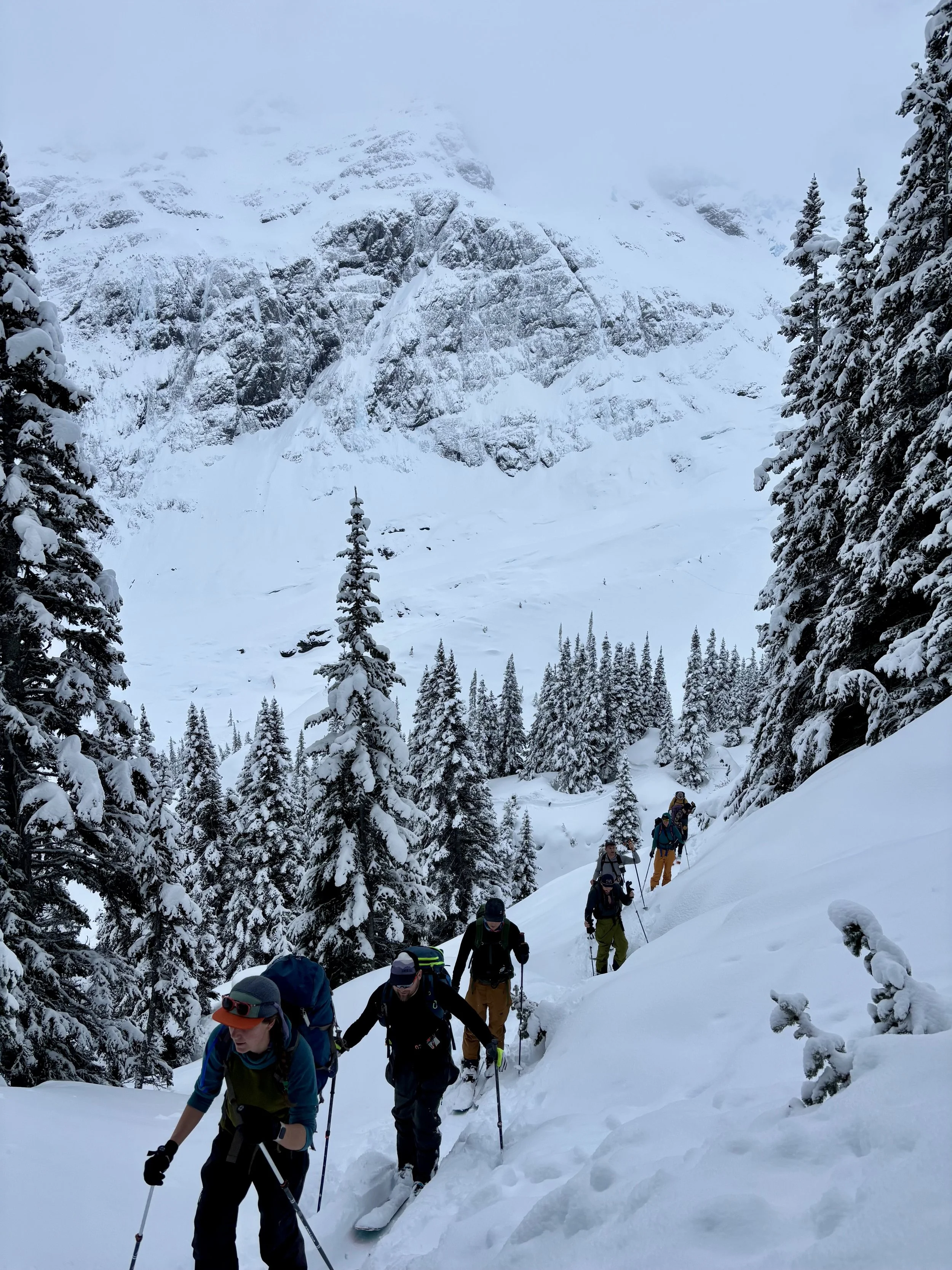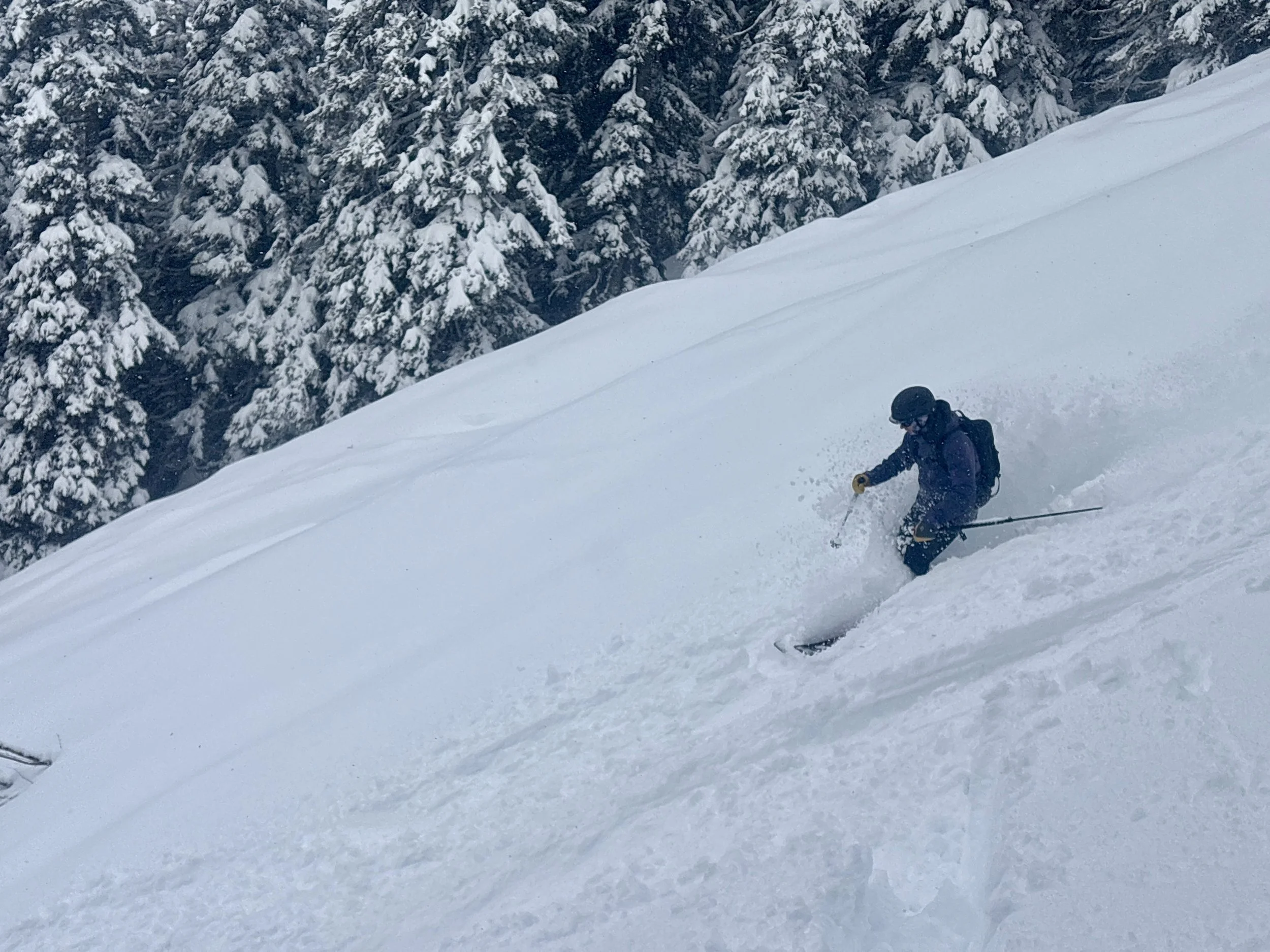 Feeling like I was in a better mindset after the day off, I decided to head out skiing again the following day. We once again took the skin track up towards Tom George. At the decision point of whether we should go to the glacier or ski the trees, I voted trees with the primary reason being it was totally flat light, and I was worried about getting injured if we went up any higher. I said the snow where we were standing at the bottom of the trees felt quite good and it was what I wanted to ski. I was then told by Conor that the snow in the trees had a crust that wouldn’t ski well and risk of injury was high there. I didn’t observe this crust he mentioned and think it was just a way to convince us to go up to the alpine. Once again frustrated, I followed the group up to the alpine. Once we got to the spot where we had turned around 2 days before, I voiced that I was 100% going to turn around regardless of what others wanted to do because visibility was so poor, and I didn’t want to be in connected, alpine avalanche terrain with a large group of people in considerable avalanche danger with limited visibility (our guides rated the avalanche danger as considerable that day above tree line, while AvCan rated it as high - I did not know this at the time. The avalanche forecast for the region said “Dangerous avalanche conditions exist. Avoid large slopes, overhead hazards, and steep terrain” ). So the group split up and several of us skied back down the way we had come up with one of the guides. On the way down, I had zero visibility and at one point found myself in free fall into a wind scoop. This was exactly what I was trying to avoid. Thankfully, I was uninjured and able to get out of the scoop by myself. We then headed over to the trees that I had pushed to ski earlier than morning. As we were ascending, remarks were made about how good the snow felt from others. I agreed and this is why I wanted to ski this terrain in the first place! When Conor met us there on his second lap, he said that because we gave the slope time, the crust disappeared. It had been maybe an hour since he had made the comment about the crust in the first place and there was no sun or warm temps to soften the snow. What made the originally mentioned “crust” disappear? I think the fact that it didn’t exist in the first place. I did two laps in the trees and then we headed back to the hut.