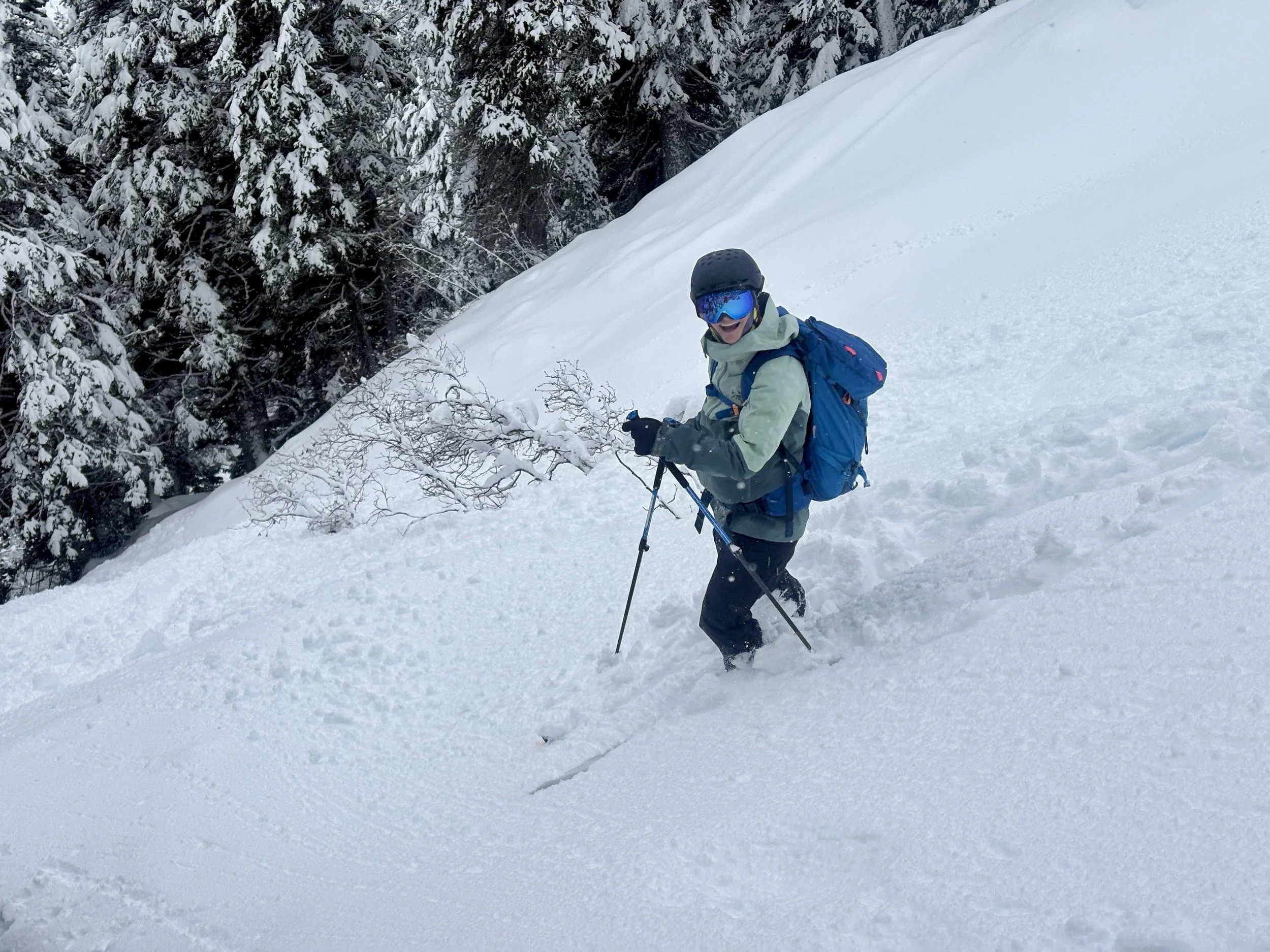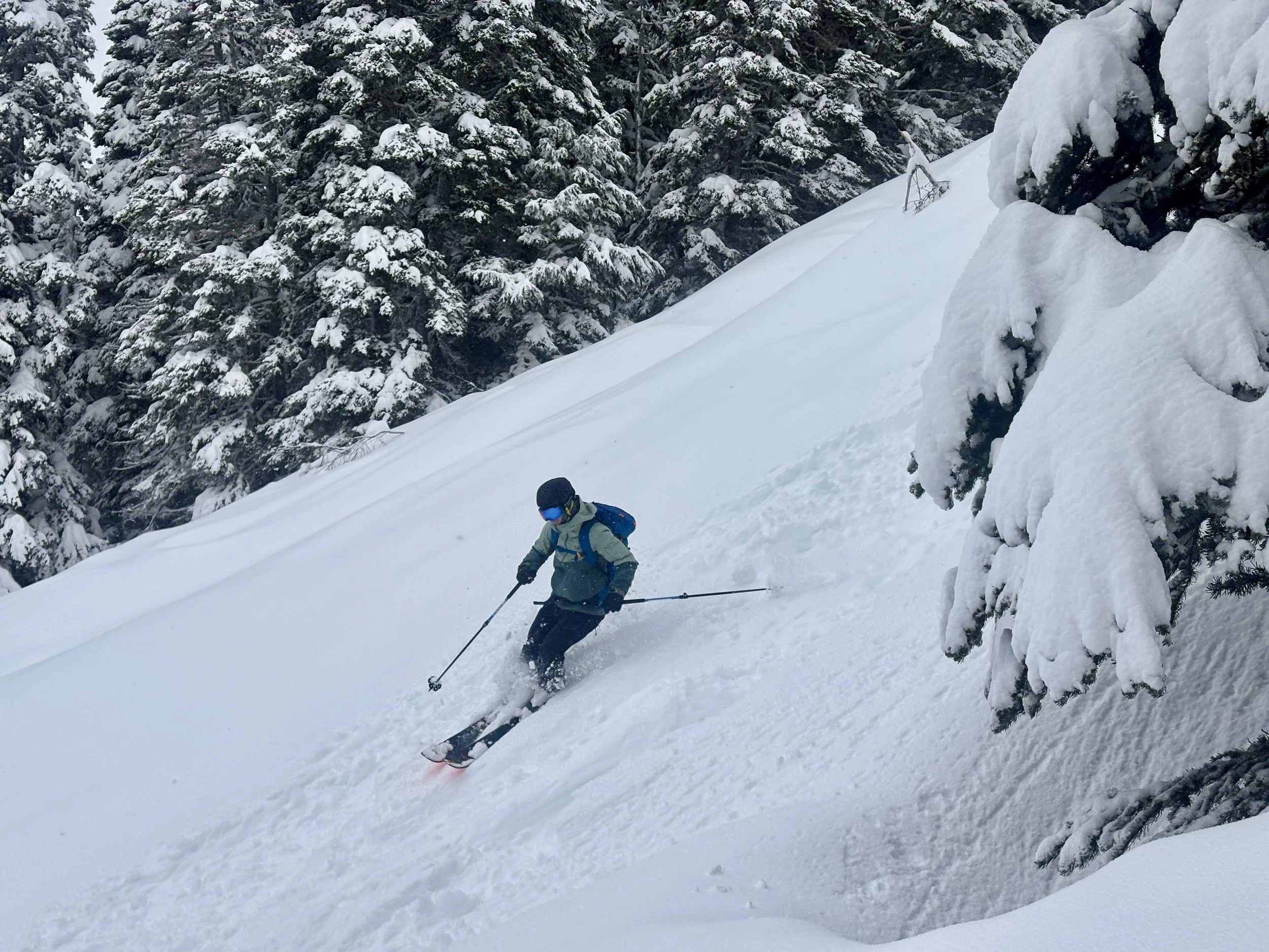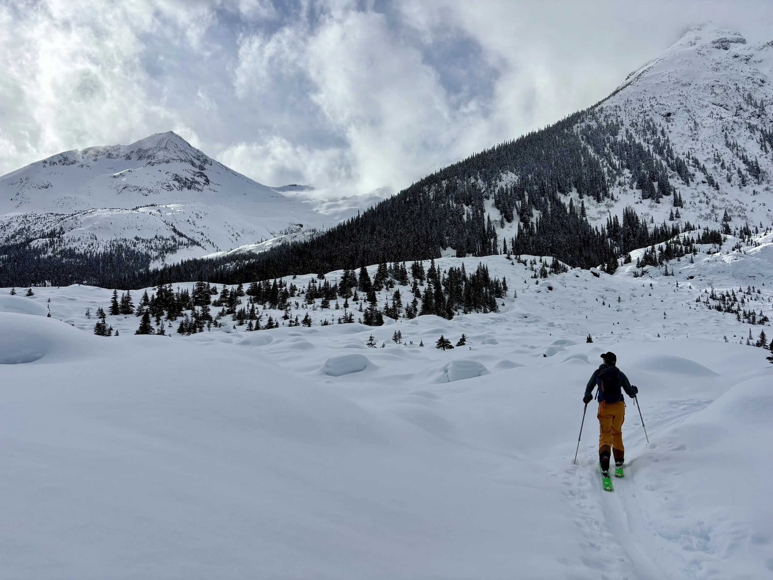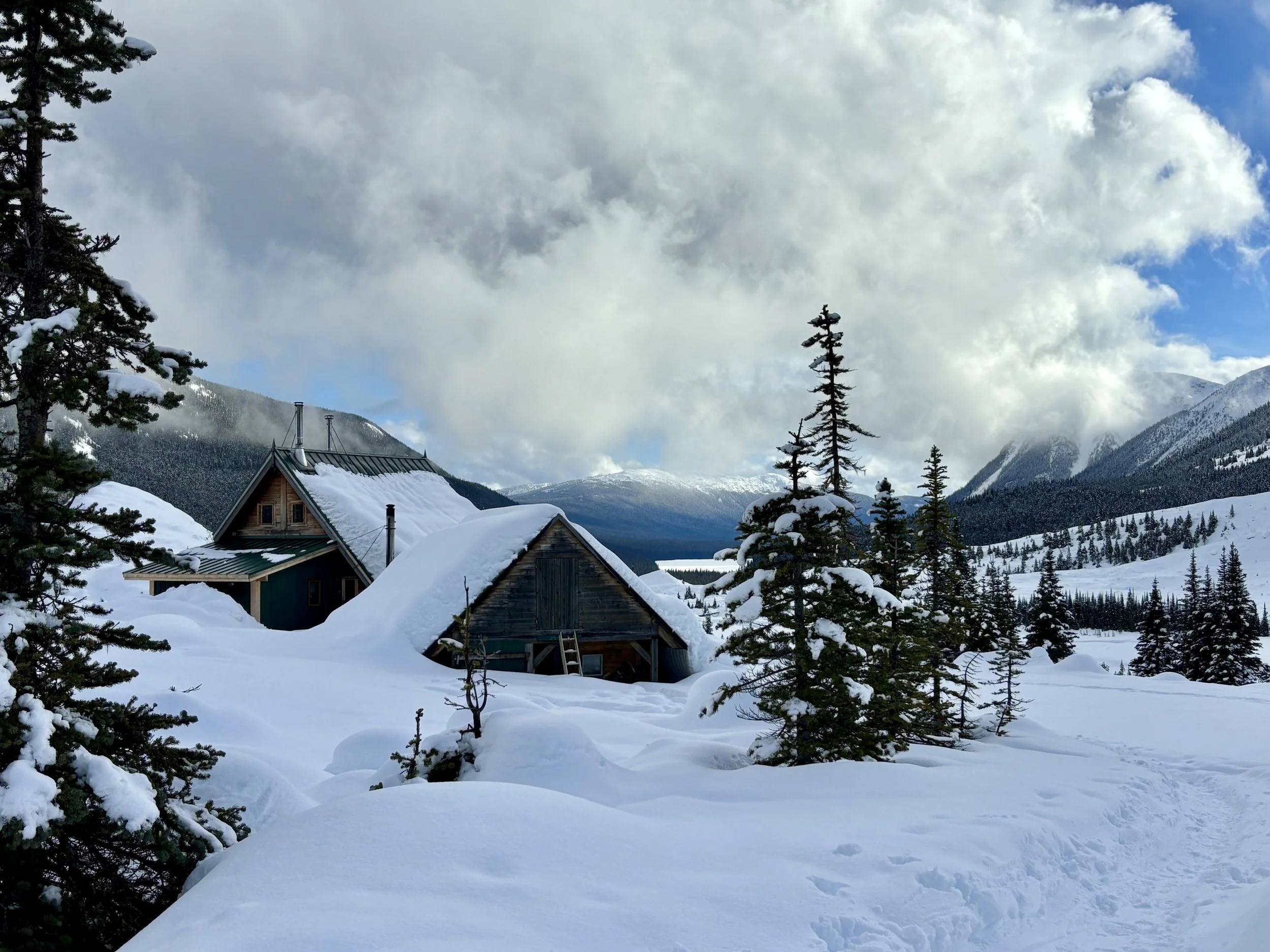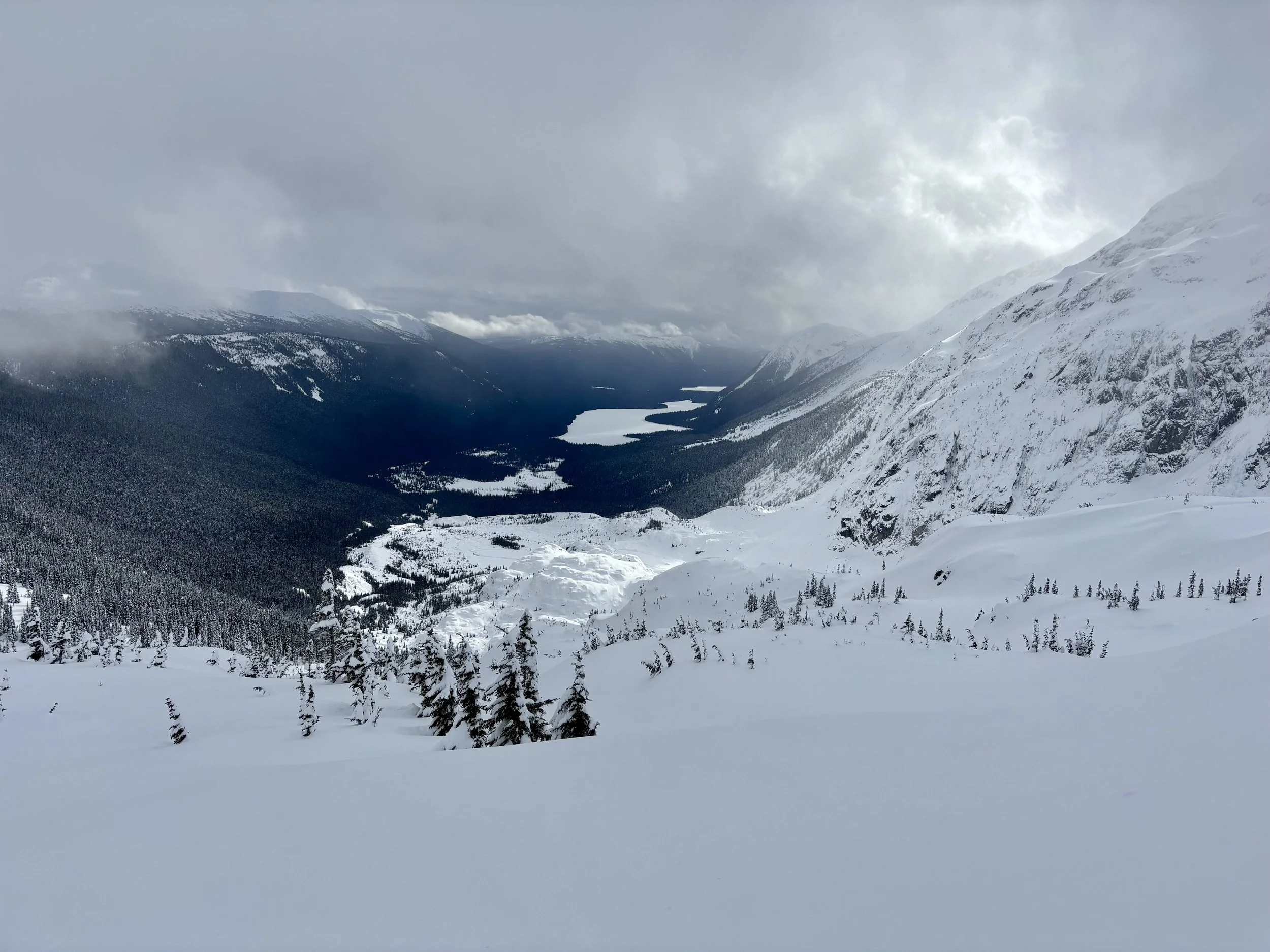 Feeling like I was in a better mindset after the day off, I decided to head out skiing again the following day. We once again took the skin track up towards Tom George. At the decision point of whether we should go to the glacier or ski the trees, I voted trees with the primary reason being it was totally flat light, and I was worried about getting injured if we went up any higher. I said the snow where we were standing at the bottom of the trees felt quite good and it was what I wanted to ski. I was then told by Conor that the snow in the trees had a crust that wouldn’t ski well and risk of injury was high there. I didn’t observe this crust he mentioned and think it was just a way to convince us to go up to the alpine. Once again frustrated, I followed the group up to the alpine. Once we got to the spot where we had turned around 2 days before, I voiced that I was 100% going to turn around regardless of what others wanted to do because visibility was so poor, and I didn’t want to be in connected, alpine avalanche terrain with a large group of people in considerable avalanche danger with limited visibility (our guides rated the avalanche danger as considerable that day above tree line, while AvCan rated it as high - I did not know this at the time. The avalanche forecast for the region said “Dangerous avalanche conditions exist. Avoid large slopes, overhead hazards, and steep terrain” ). So the group split up and several of us skied back down the way we had come up with one of the guides. On the way down, I had zero visibility and at one point found myself in free fall into a wind scoop. This was exactly what I was trying to avoid. Thankfully, I was uninjured and able to get out of the scoop by myself. We then headed over to the trees that I had pushed to ski earlier than morning. As we were ascending, remarks were made about how good the snow felt from others. I agreed and this is why I wanted to ski this terrain in the first place! When Conor met us there on his second lap, he said that because we gave the slope time, the crust disappeared. It had been maybe an hour since he had made the comment about the crust in the first place and there was no sun or warm temps to soften the snow. What made the originally mentioned “crust” disappear? I think the fact that it didn’t exist in the first place. I did two laps in the trees and then we headed back to the hut.