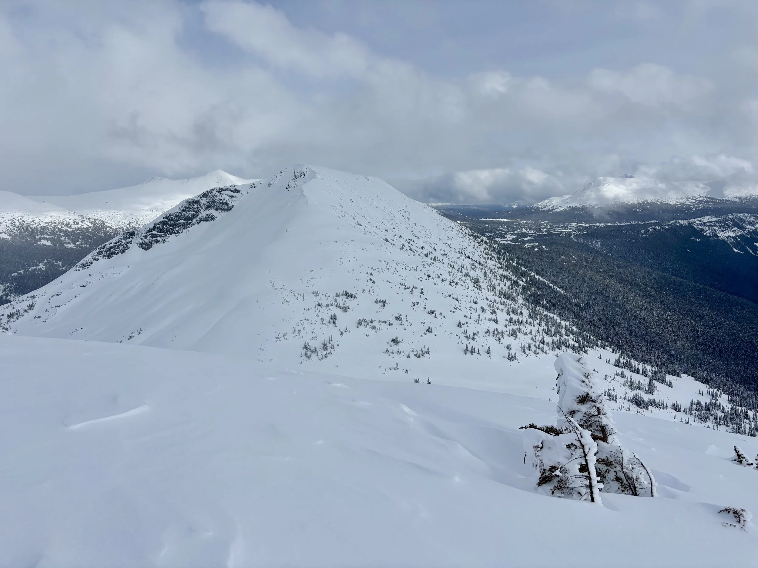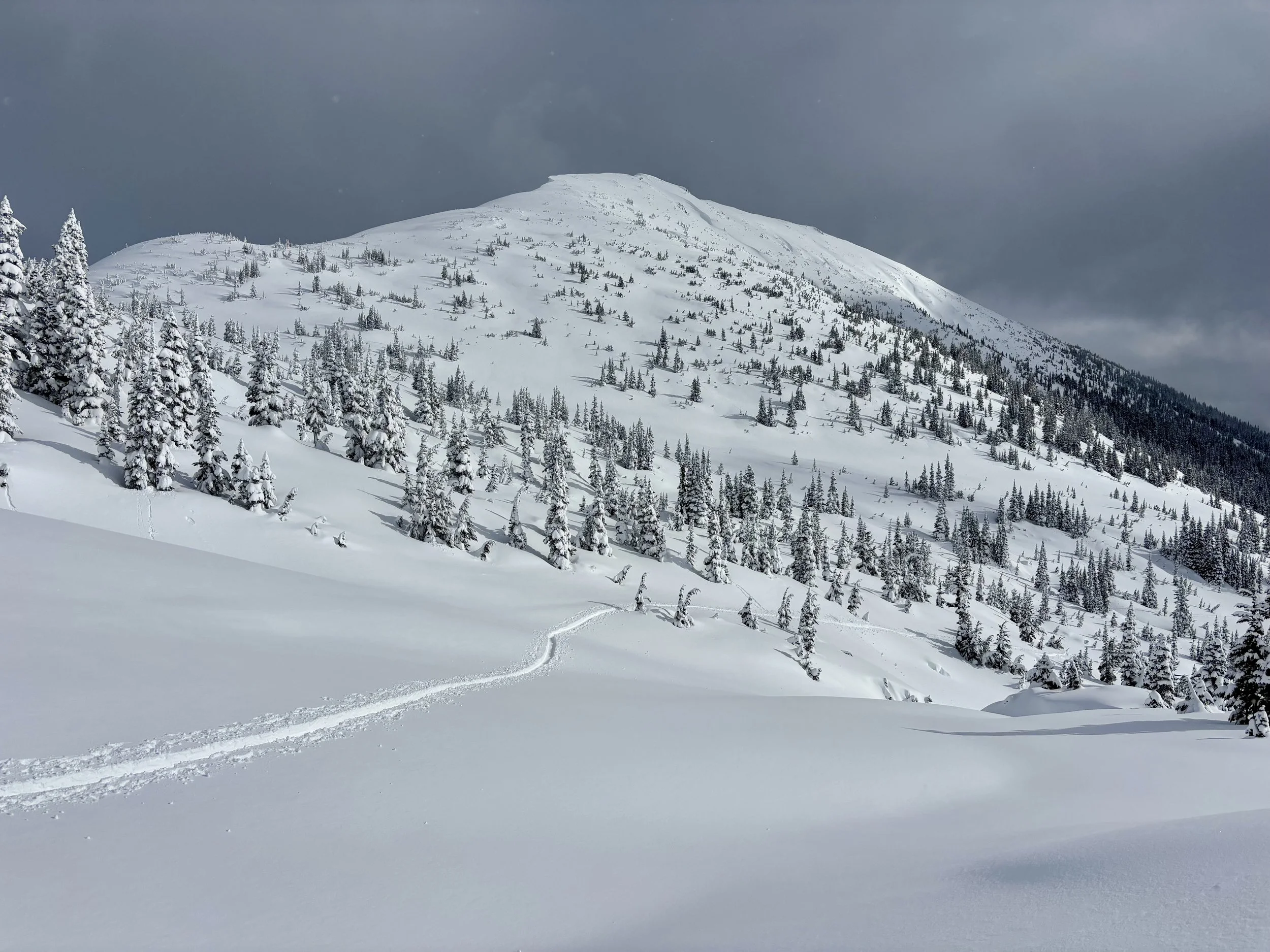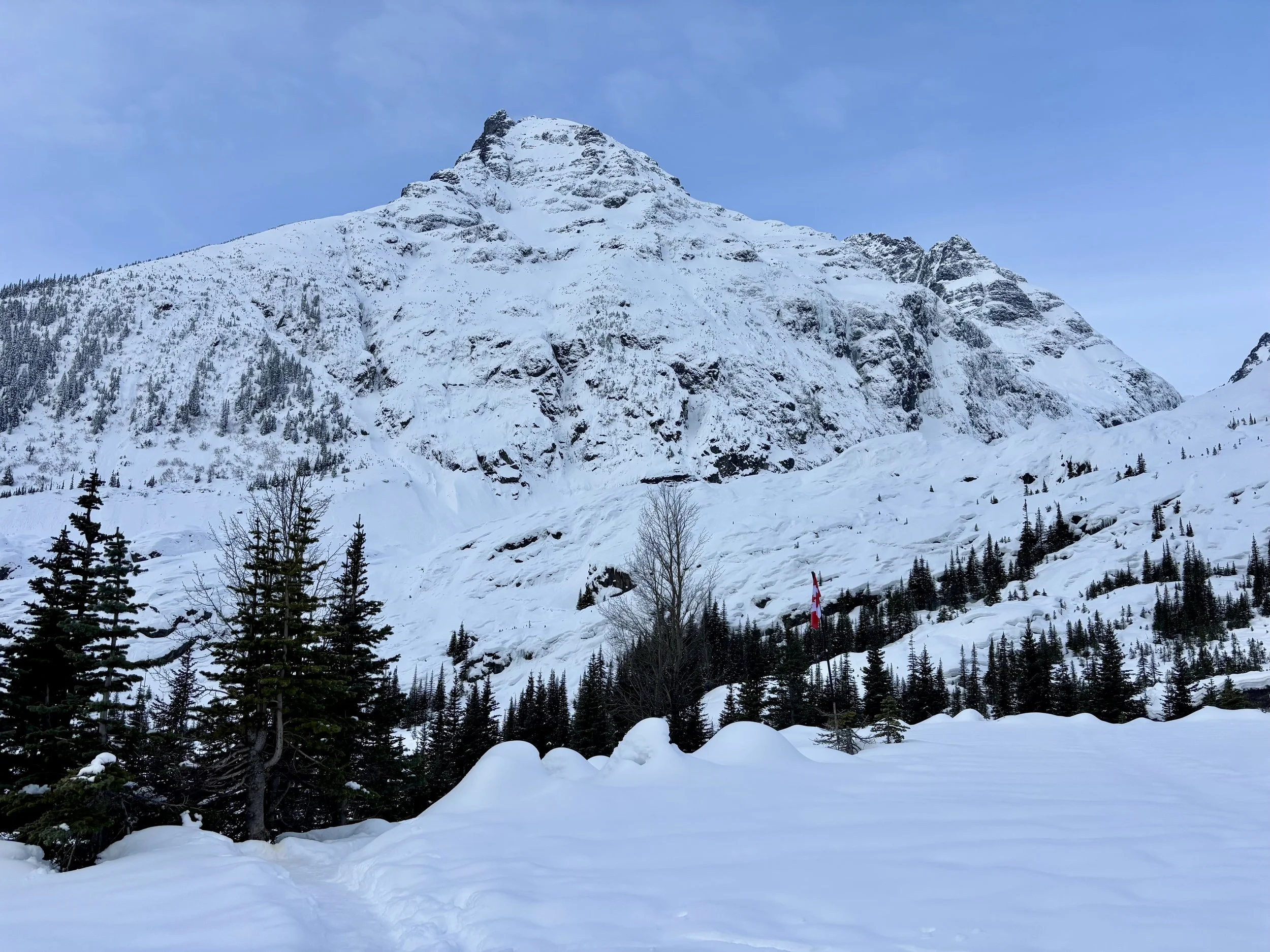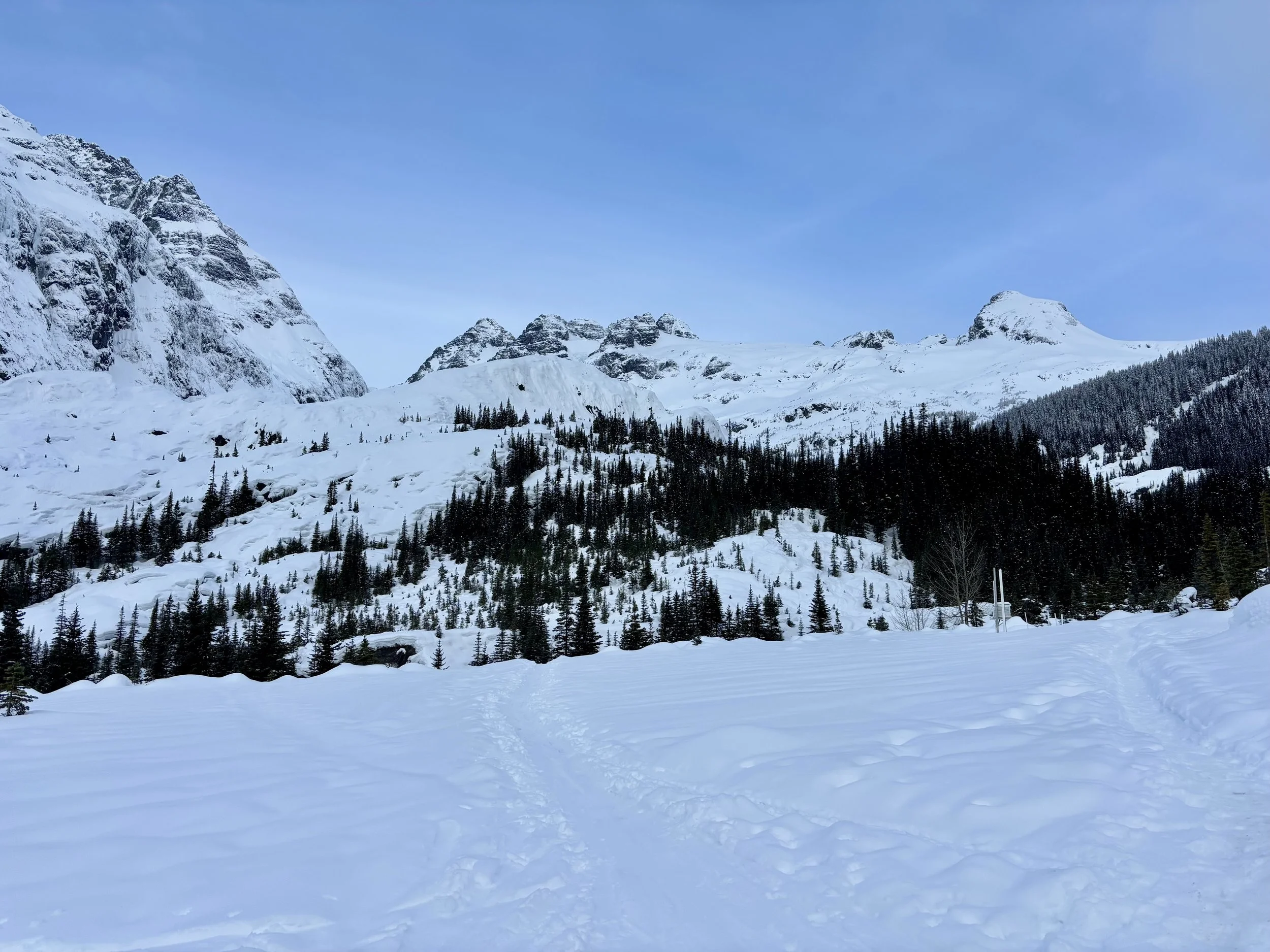 Feeling like I was in a better mindset after the day off, I decided to head out skiing again the following day. We once again took the skin track up towards Tom George. At the decision point of whether we should go to the glacier or ski the trees, I voted trees with the primary reason being it was totally flat light, and I was worried about getting injured if we went up any higher. I said the snow where we were standing at the bottom of the trees felt quite good and it was what I wanted to ski. I was then told by Conor that the snow in the trees had a crust that wouldn’t ski well and risk of injury was high there. I didn’t observe this crust he mentioned and think it was just a way to convince us to go up to the alpine. Once again frustrated, I followed the group up to the alpine. Once we got to the spot where we had turned around 2 days before, I voiced that I was 100% going to turn around regardless of what others wanted to do because visibility was so poor, and I didn’t want to be in connected, alpine avalanche terrain with a large group of people in considerable avalanche danger with limited visibility (our guides rated the avalanche danger as considerable that day above tree line, while AvCan rated it as high - I did not know this at the time. The avalanche forecast for the region said “Dangerous avalanche conditions exist. Avoid large slopes, overhead hazards, and steep terrain” ). So the group split up and several of us skied back down the way we had come up with one of the guides. On the way down, I had zero visibility and at one point found myself in free fall into a wind scoop. This was exactly what I was trying to avoid. Thankfully, I was uninjured and able to get out of the scoop by myself. We then headed over to the trees that I had pushed to ski earlier than morning. As we were ascending, remarks were made about how good the snow felt from others. I agreed and this is why I wanted to ski this terrain in the first place! When Conor met us there on his second lap, he said that because we gave the slope time, the crust disappeared. It had been maybe an hour since he had made the comment about the crust in the first place and there was no sun or warm temps to soften the snow. What made the originally mentioned “crust” disappear? I think the fact that it didn’t exist in the first place. I did two laps in the trees and then we headed back to the hut.