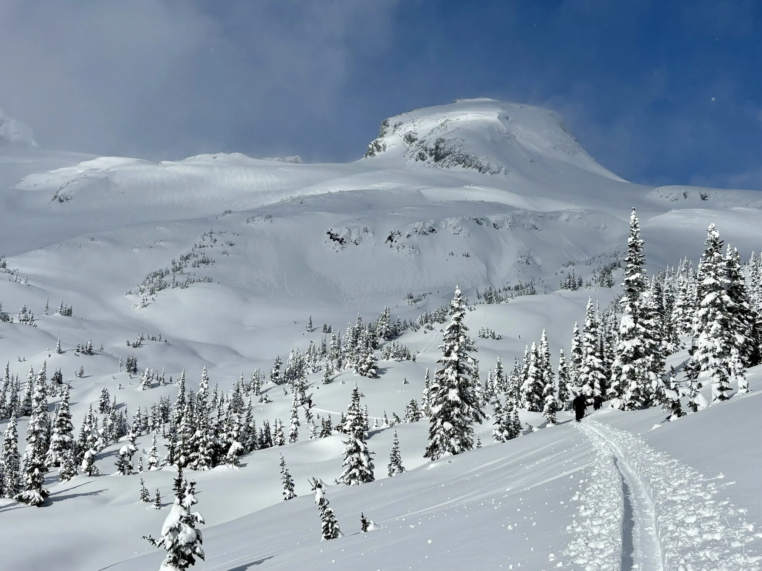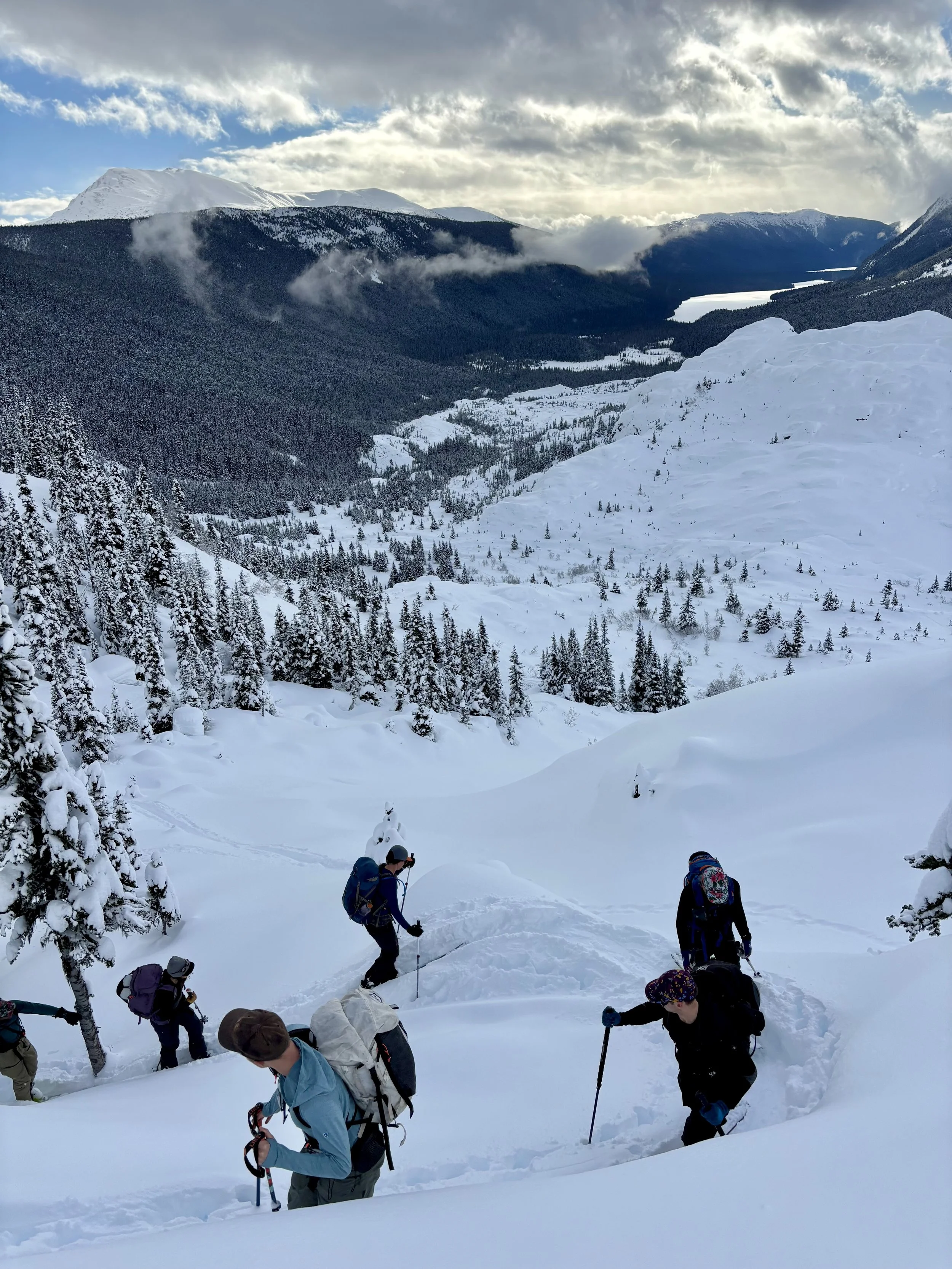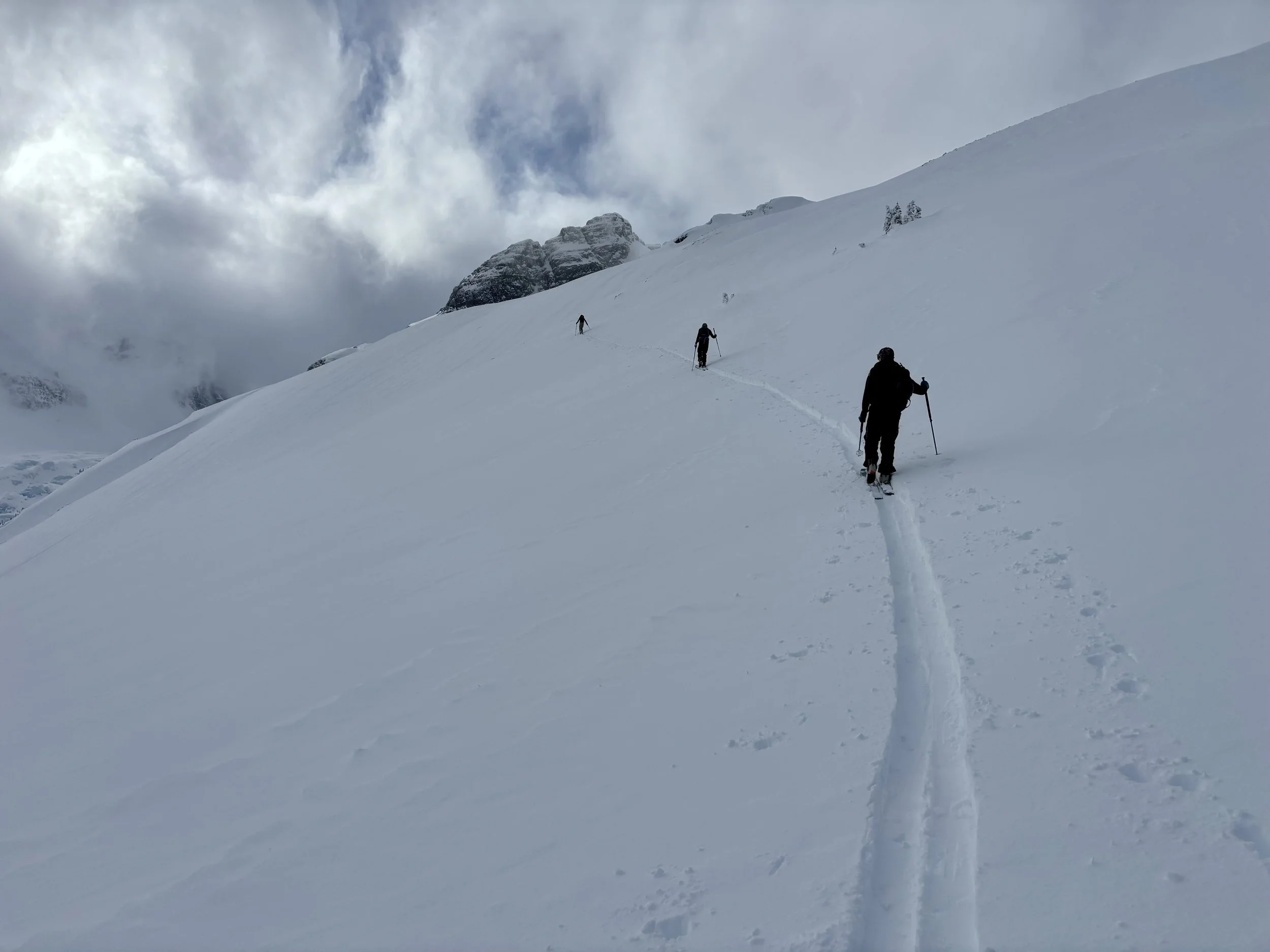 The next morning we woke up to a bunch of new snow around the hut and we knew there would be more snow to be found as we went up high. The guides gave an avalanche danger rating as 4 (high ATL), 3 (considerable NTL), 3 (considerable BTL) for the day. The plan for that day was to ski some different trees off of Tom George, these trees were farther east than the ones we had skied the day before. As we ascended, my prediction for a fair amount of snow was correct. We made it up to the ridge and began transitioning above the slope the guides wanted to ski. As one of the last guests got to the top, he mentioned that he felt a big whumpf on the skin track in a spot that wasn’t too far from the slope we were about to ski. The guides said they expected that, and it wasn’t discussed any further.