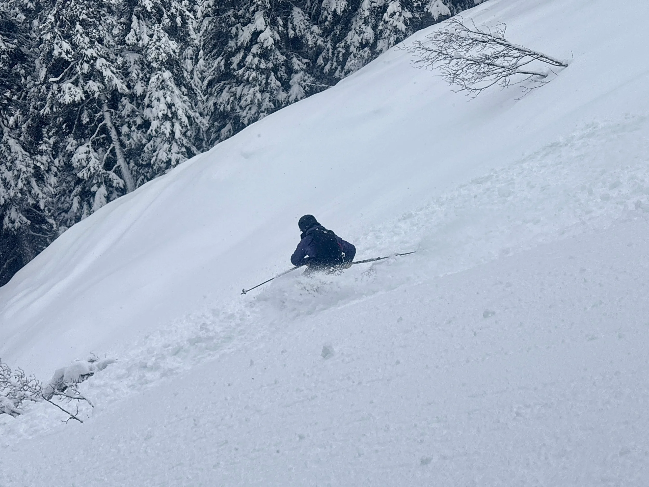 Conor, our lead guide, said he’d ski the line first and to stack skier’s right of his tracks. He was followed by 3 guests without any incident. The fourth guest to descend the slope was also the person who felt the whumpf a few moments earlier. The tail guide told him that he could go left of Conor’s tracks as there wasn’t enough space for everyone to ski right of Conor’s tracks. As guest #4 started heading down the slope, the whole slope around him fractured. Tail guide yelled AVALANCHE and guest #4 started cutting hard to his right in an attempt to get out of it. Unfortunately, the whole slope above and around him decided to slide, and he wasn’t able to get out of the avalanche. He was swept off his feet. He was raked through the trees at the bottom of the slope and got extremely lucky that he only hit one of the trees with his arm instead of his head. He eventually came to a stop and was thankfully mostly above the snow. The crown of the avalanche was about 20-60cm, and it failed on an old facet interface. The guest was carried about 300 vertical feet. Tail guide immediately went down to see if the guest was ok. I was going to be the next guest to ski and went down to help dig the guest out and assist him as needed. Once guest #4 was ok to continue down the slope, we went to find the lead guide and the first three guests who skied. What we discovered was that the avalanche also hit some of them with one person being pushed 30 feet and another having the debris push them as well.