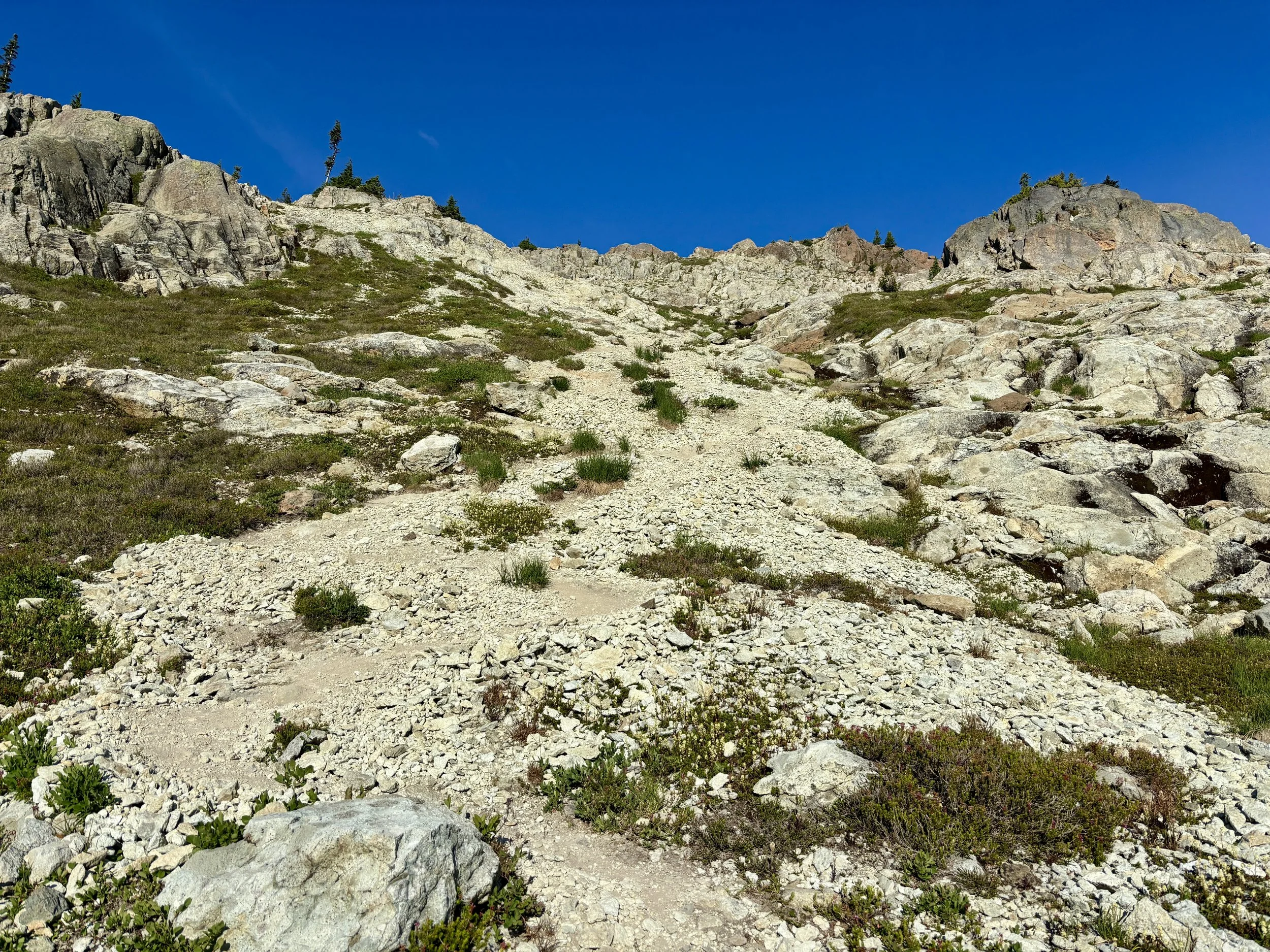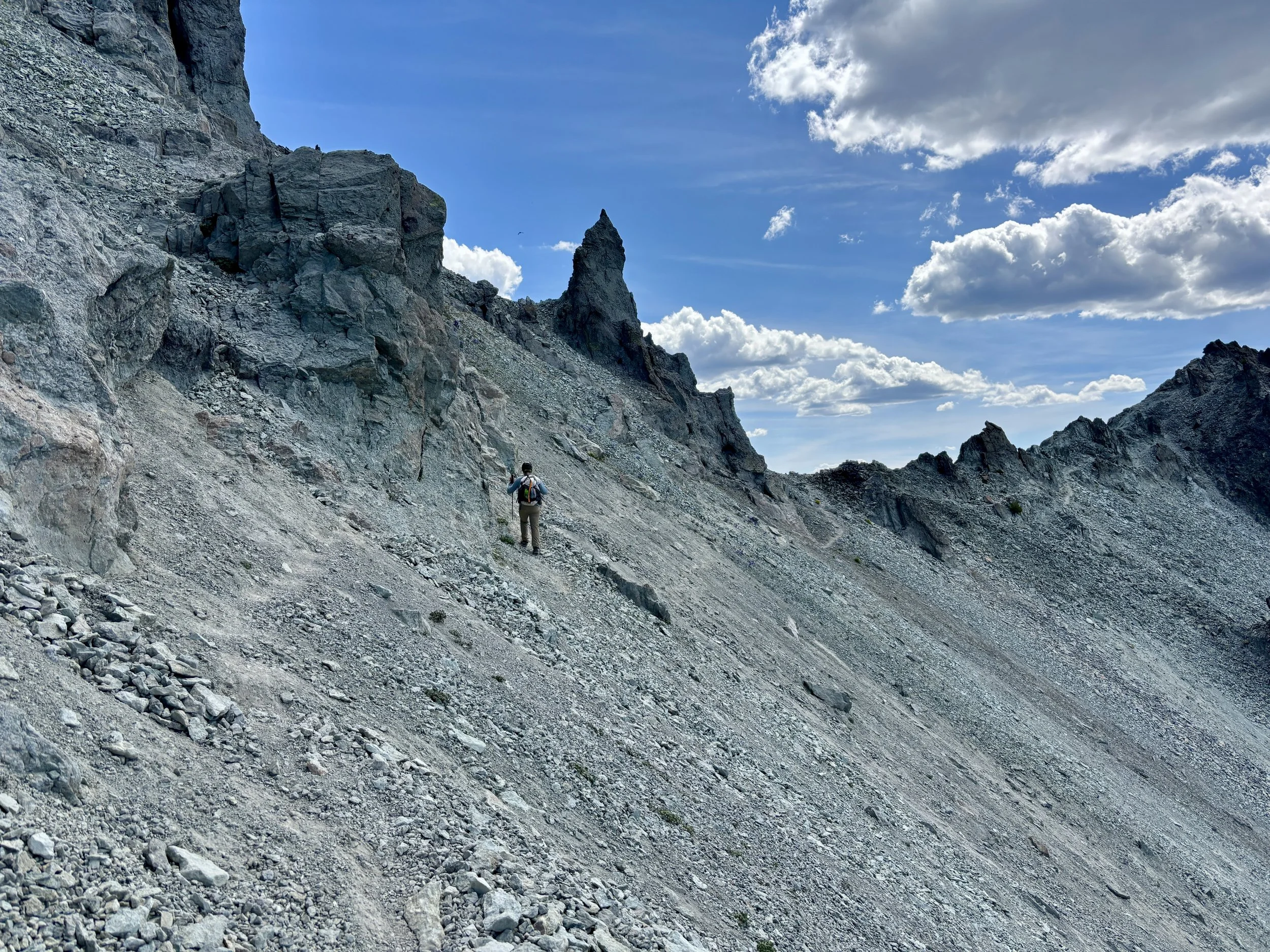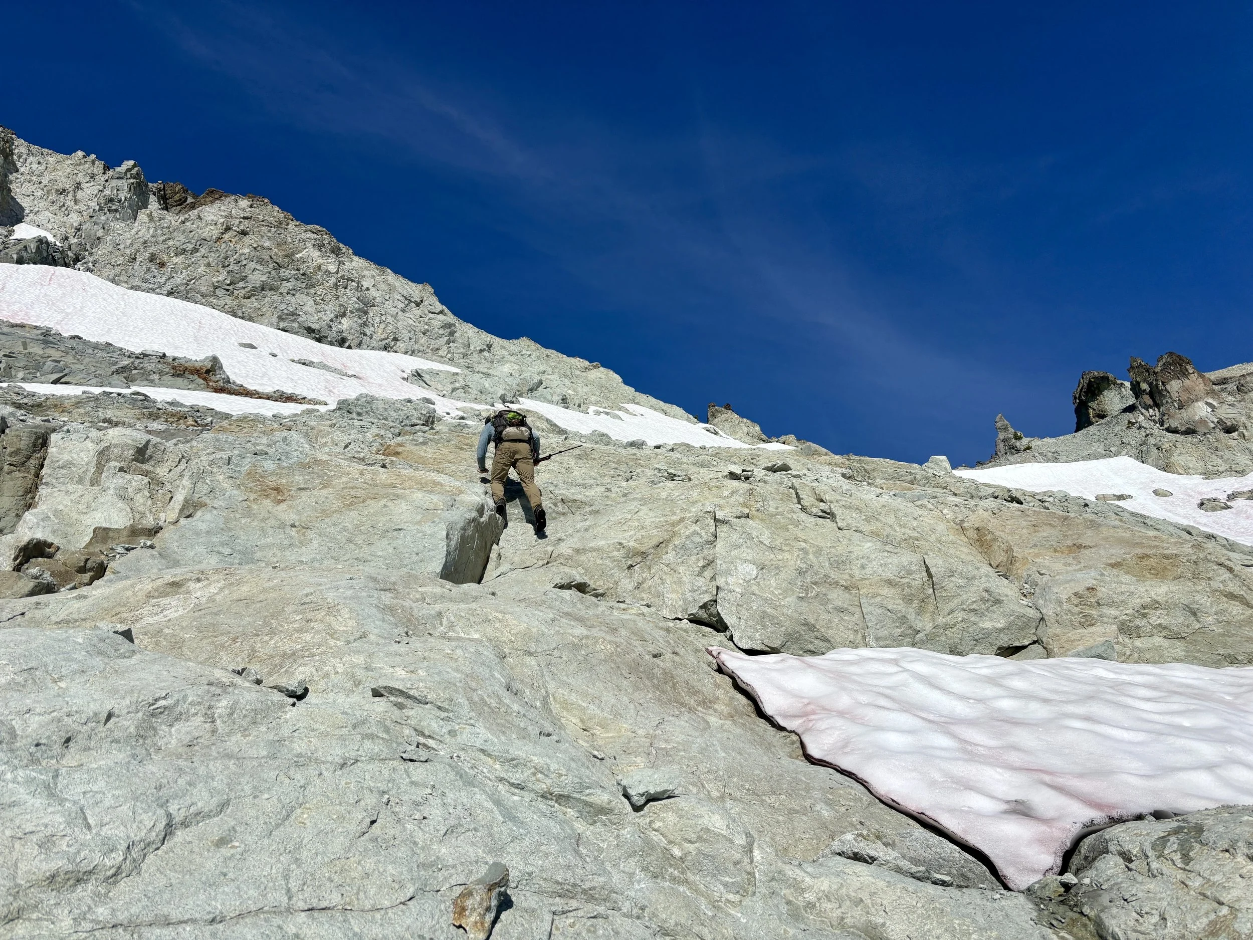 We very quickly started gaining elevation. This trail had more of a climber’s trail feel to it because it was very direct, went straight up the mountain, and had a lot of loose rock to navigate. That said, it was nice that there was a trail there, and we moved through that section pretty quickly.