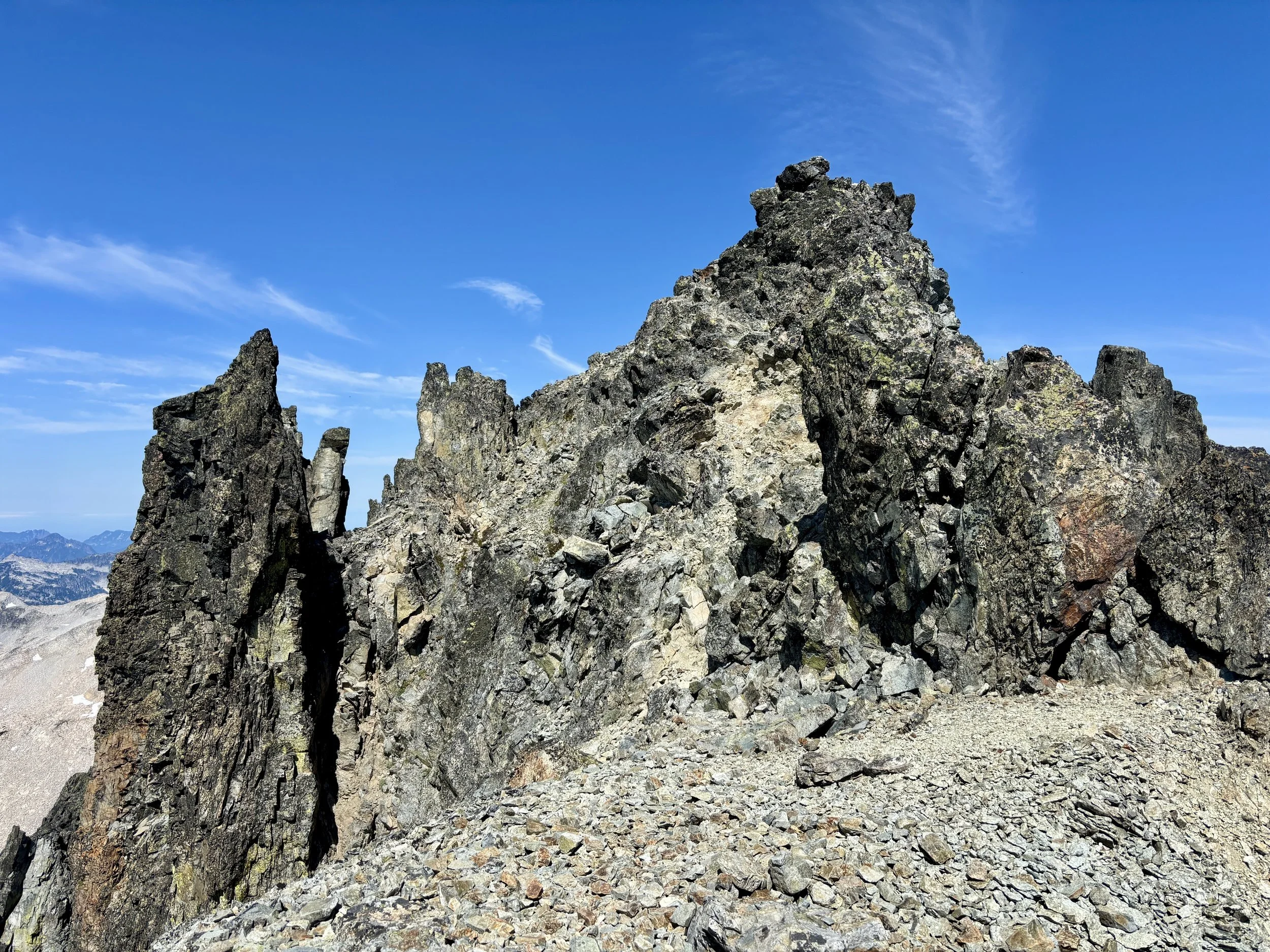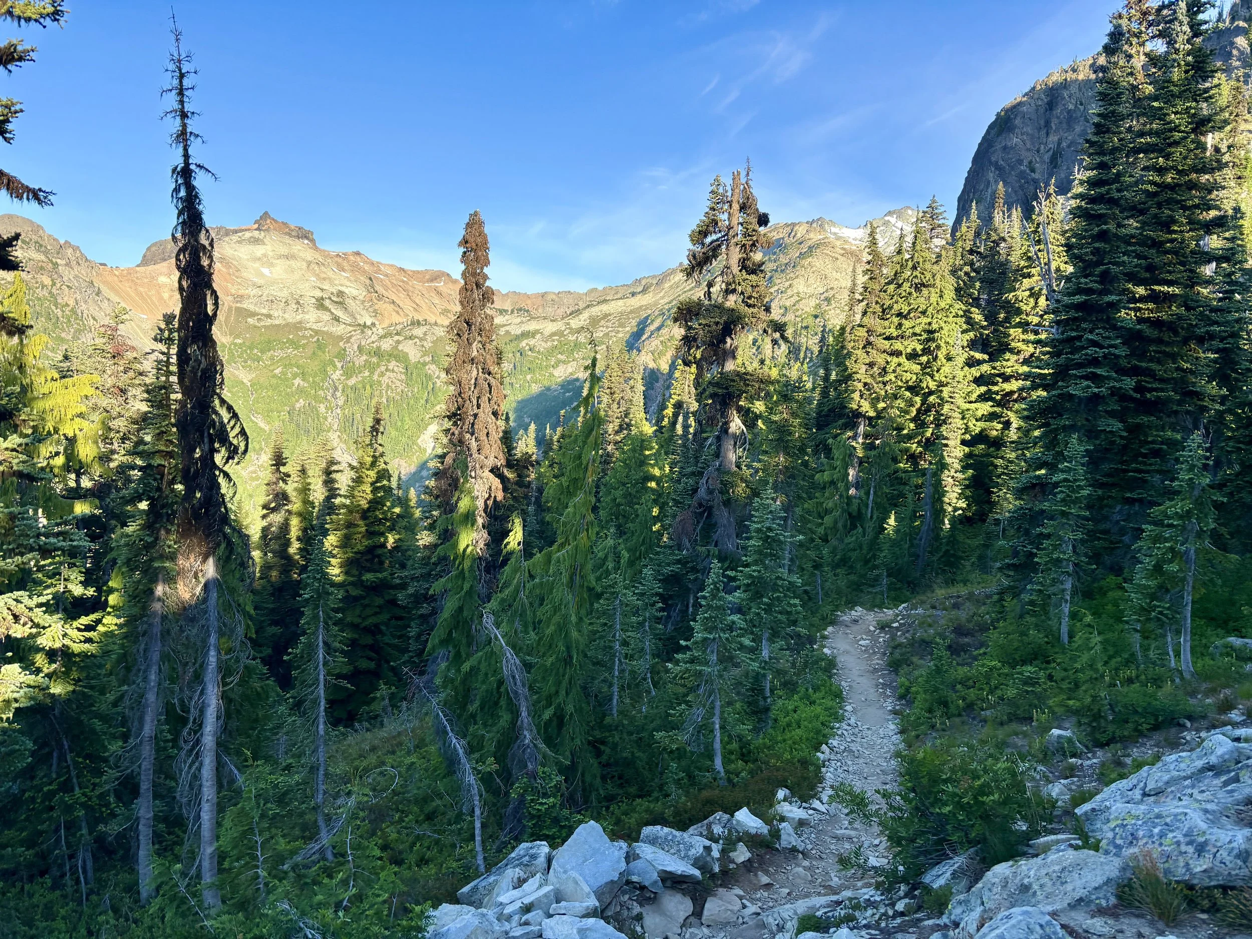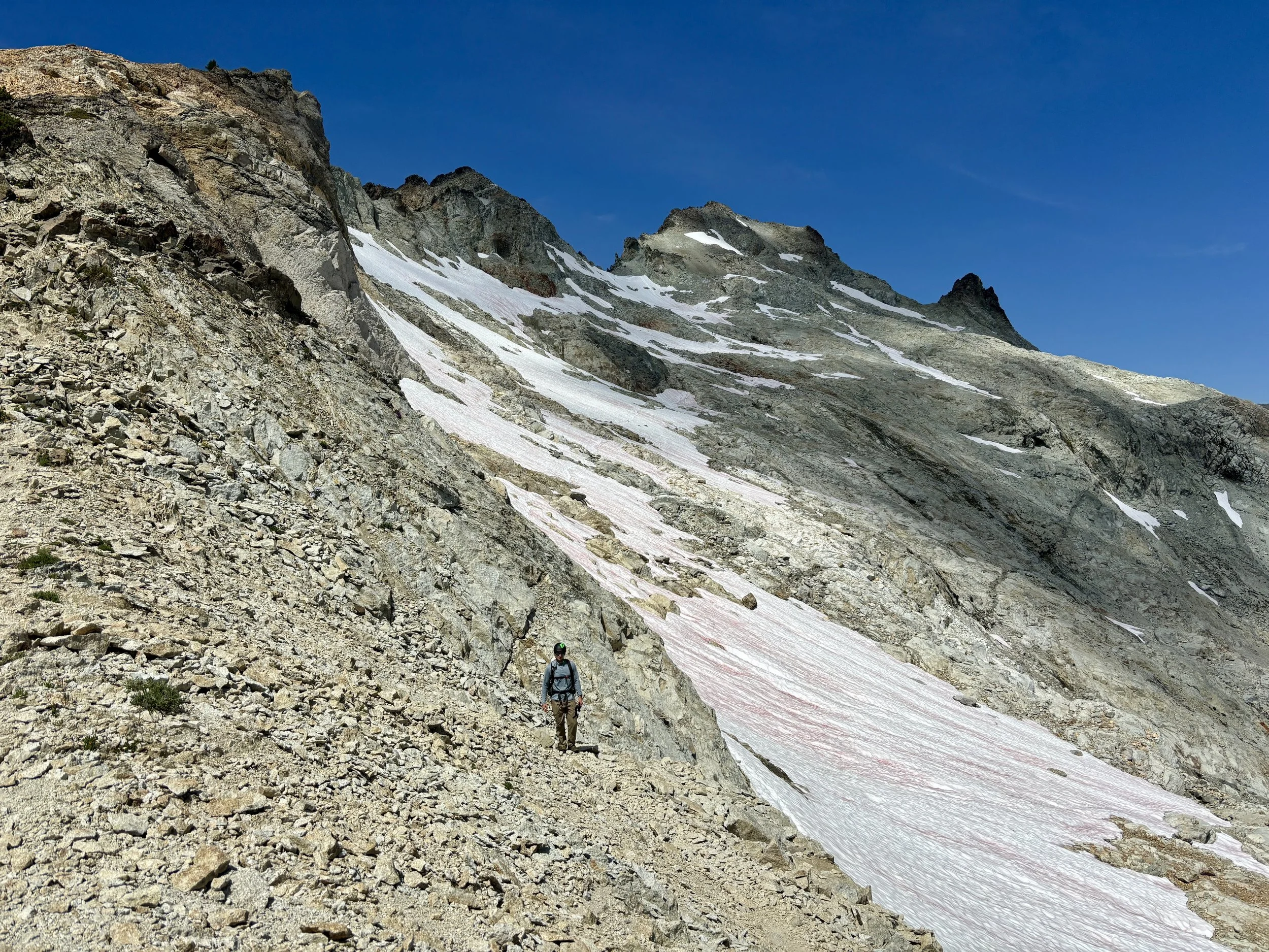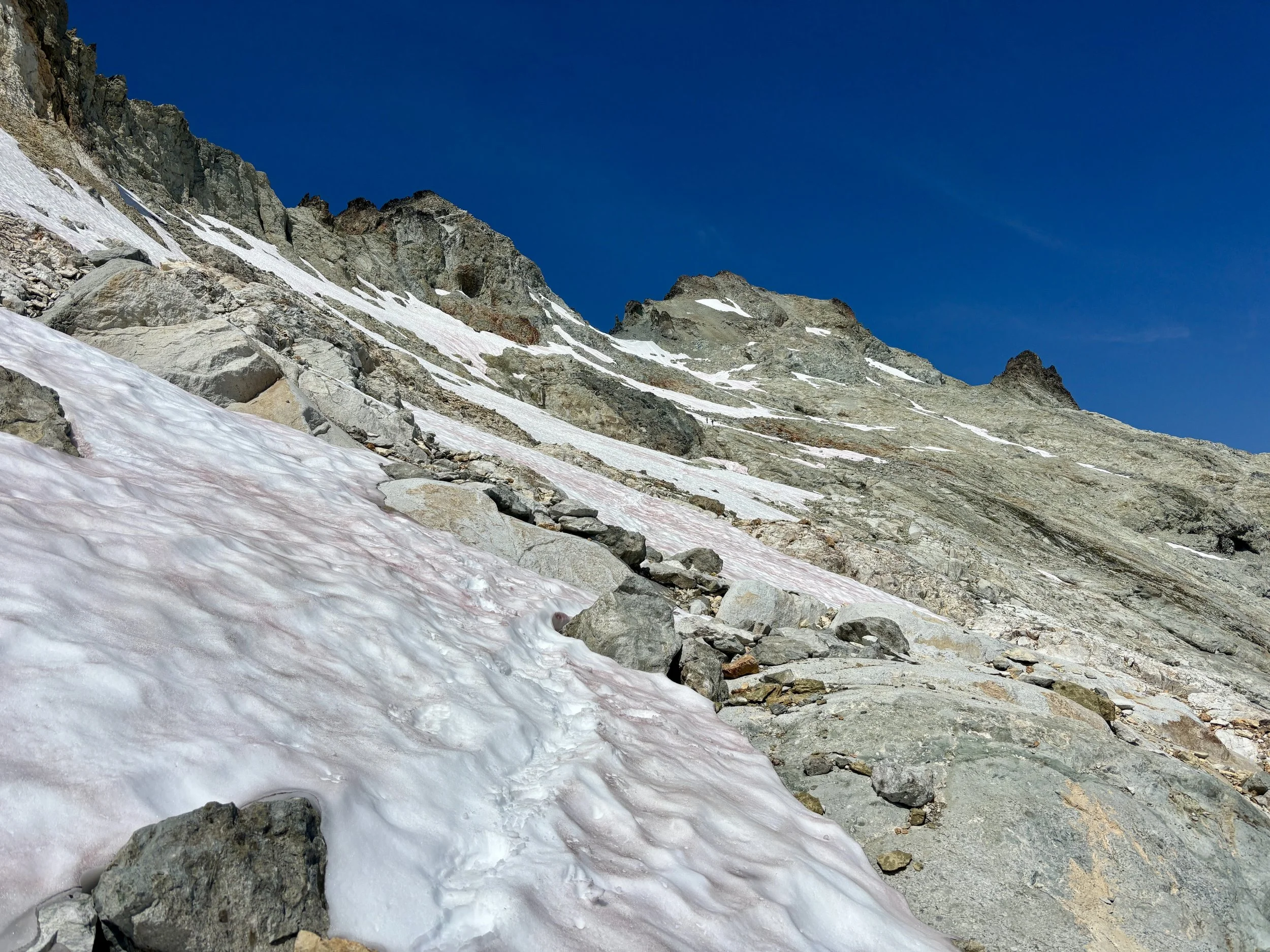 We very quickly started gaining elevation. This trail had more of a climber’s trail feel to it because it was very direct, went straight up the mountain, and had a lot of loose rock to navigate. That said, it was nice that there was a trail there, and we moved through that section pretty quickly.