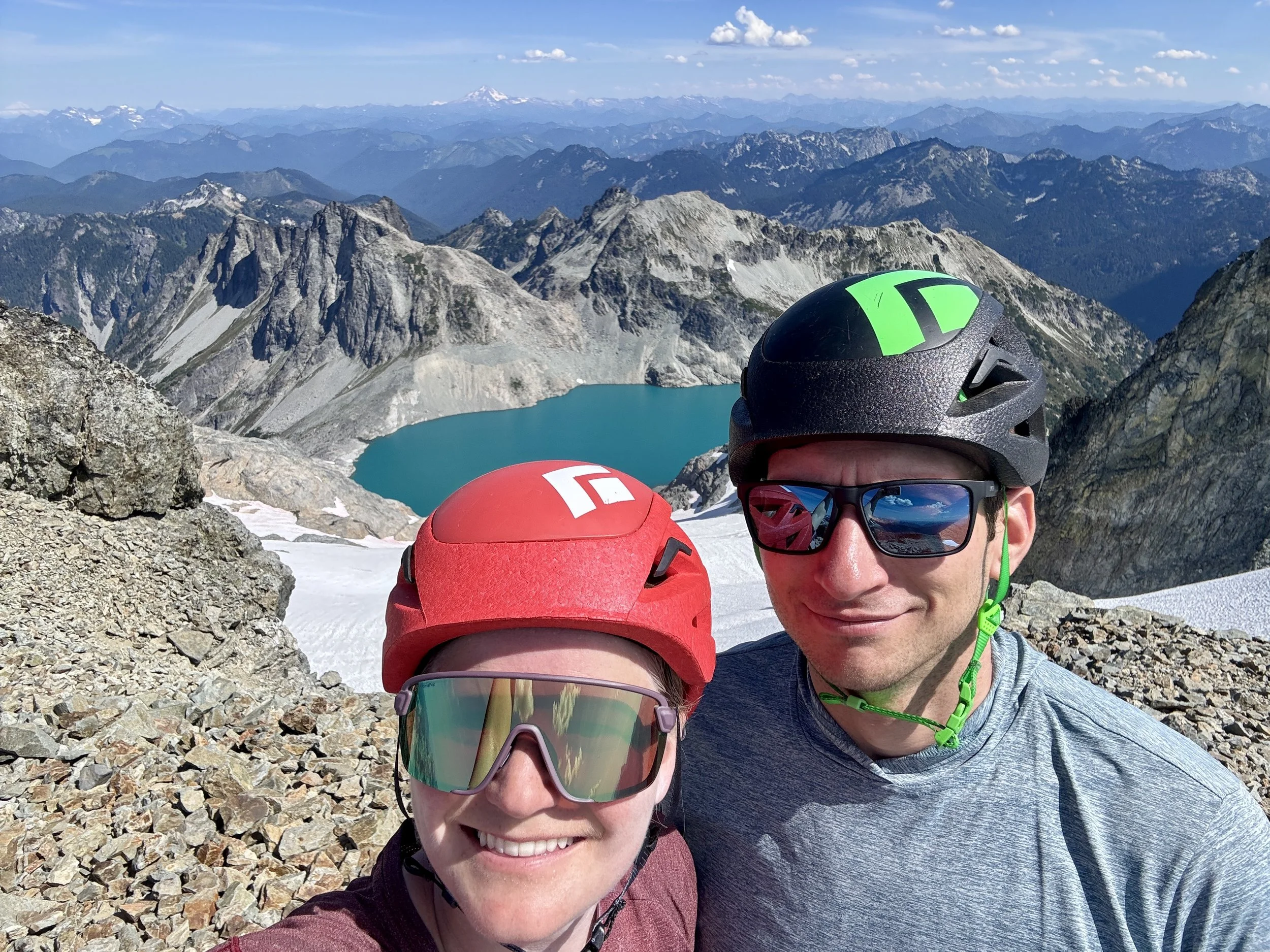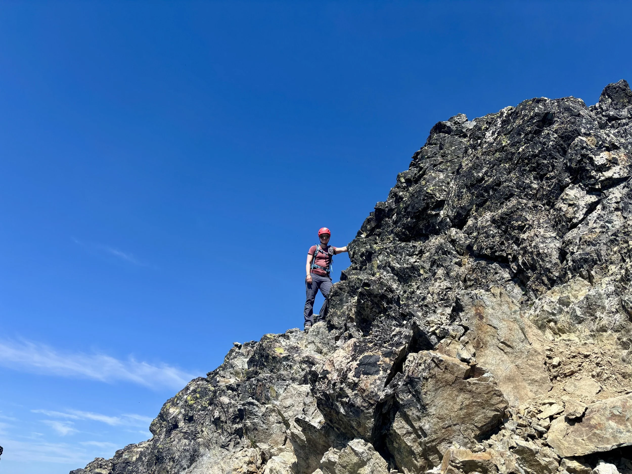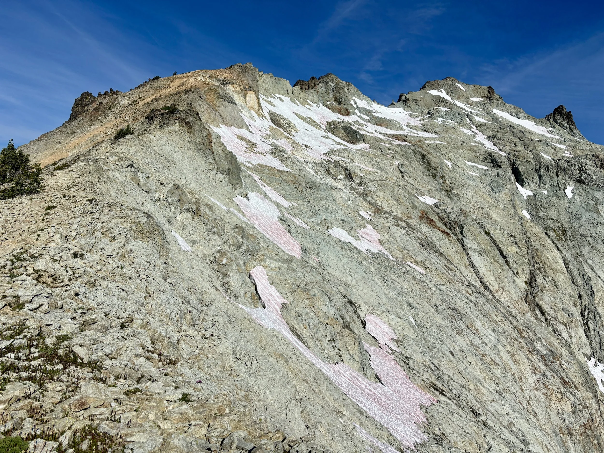 It looked like we just had to traverse a steep slope and then the slope angle would lessen and we’d be at the top in no time. Turns out the traverse right after the saddle was hands down the worst part of the day. The slope is so steep that there are very few rocks left on the slope and so there are just some small footprints that are worn in to the dirt that are a couple of inches wide. If you fell here, you’d probably tumble for a while before you would be able to stop and I think you’d be pretty banged up. At one point, we somehow found ourselves on some footprints that were below where we wanted to be and we had to very carefully take several steps in the loose dirt to get back up. I think we both held our breath while we did it. Once across this slope, things did get easier. The next little peak did require walking up some very loose scree and dirt, but it looked worse than it actually was. Once we were at this next saddle, we could see two people on the summit. We were close! We followed the social trail to the base of the summit block and scrambled up the last ~25 feet to the top. There were a lot of bugs at the top (similar to Ingalls Peak - why is this a thing in Washington?), so we decided to tag the summit but eat lunch at the bottom of the summit block.