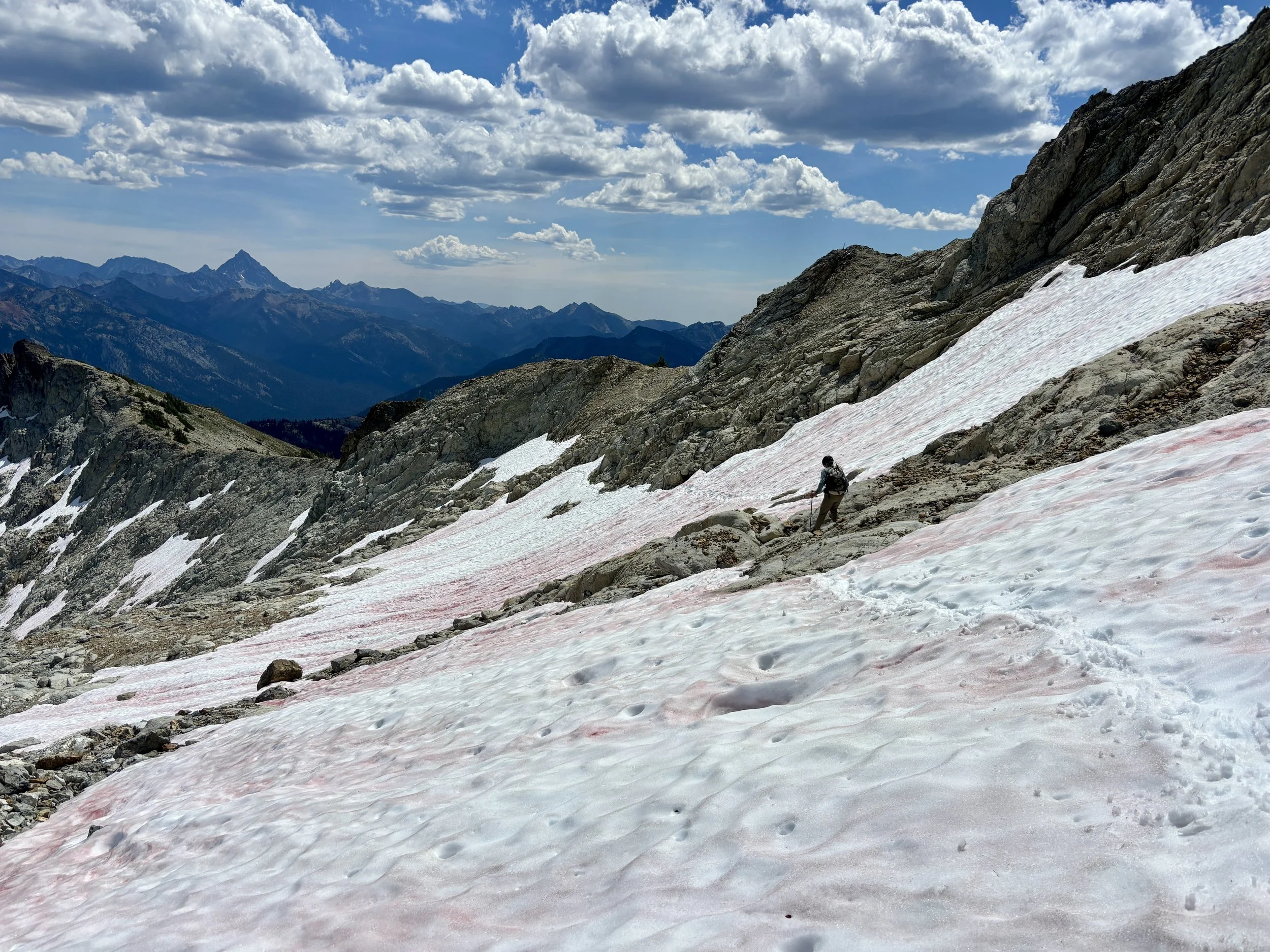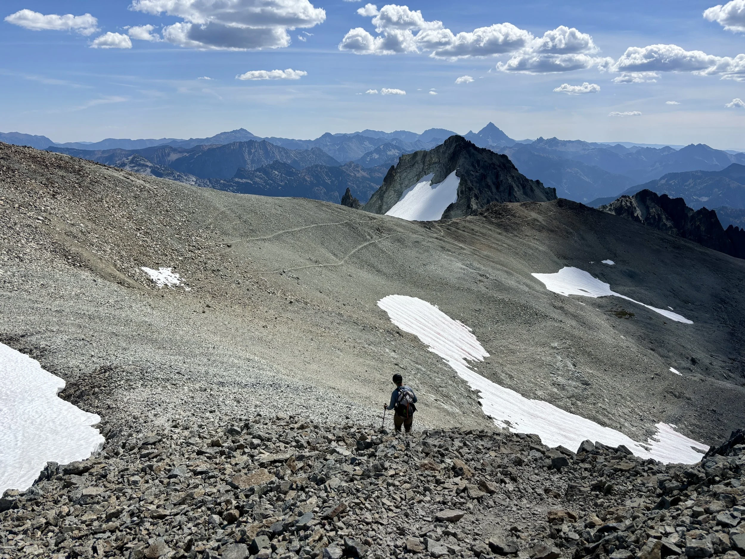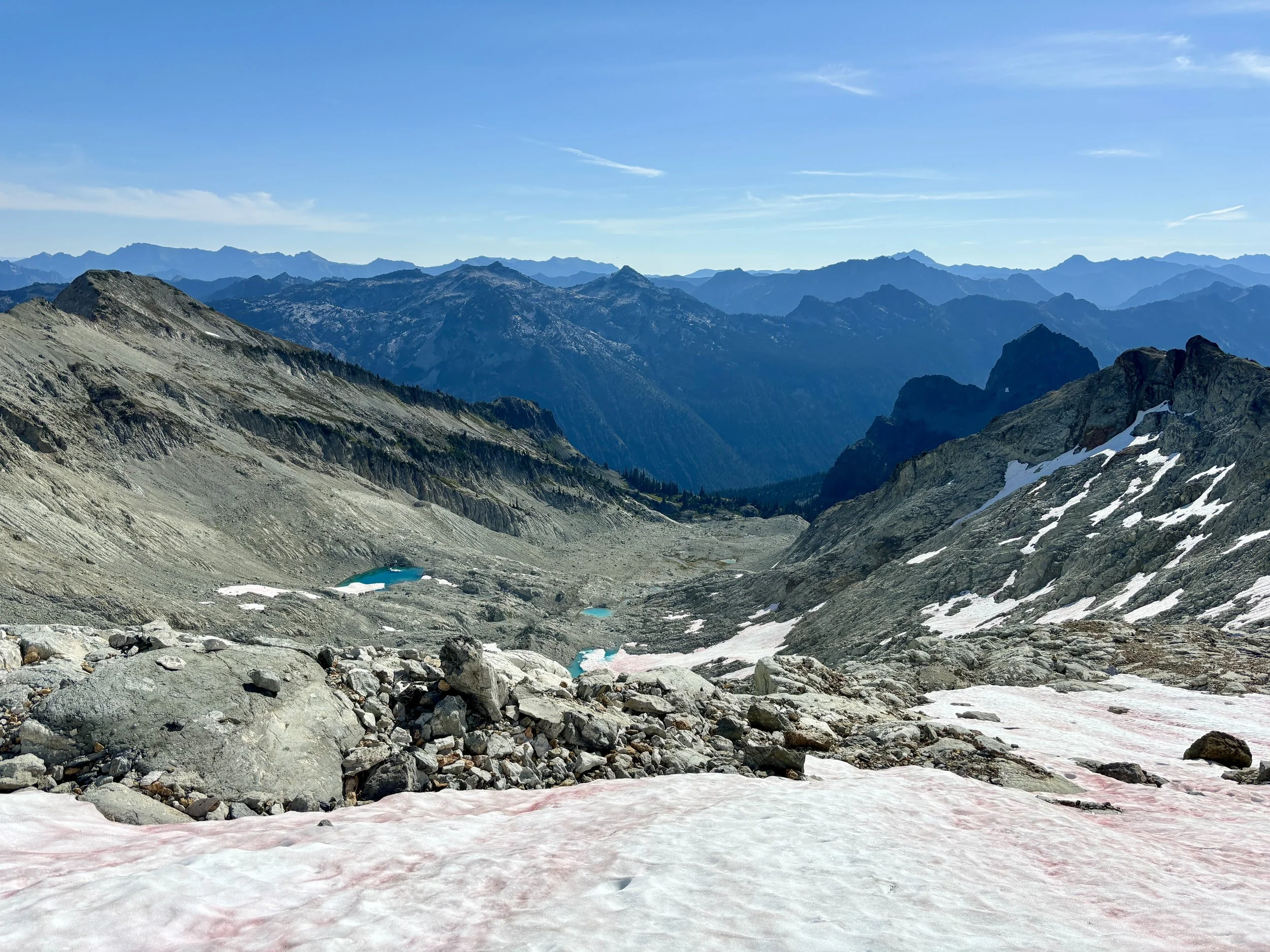 Once we got higher up on the ridge, we started to get some views of the bowl with snow patches that we would have to traverse. Reports online said this would be the faster route to take vs the scrambler’s route that stayed on the ridge. We dropped off the ridge in the obvious spot where we saw bootprints start in the snow. We took out our ice axes and put on our microspikes, and followed this “trail” to the bottom of the bowl that still had snow on it. There were several different options people had taken to go up the bowl. I assumed this would be the hardest part of the day (I was wrong). We took the climber’s left track and didn’t have any issues getting to the saddle. Once at the saddle, we stopped for a snack break and enjoyed the views we had of Rainier and the endless number of mountains around us.