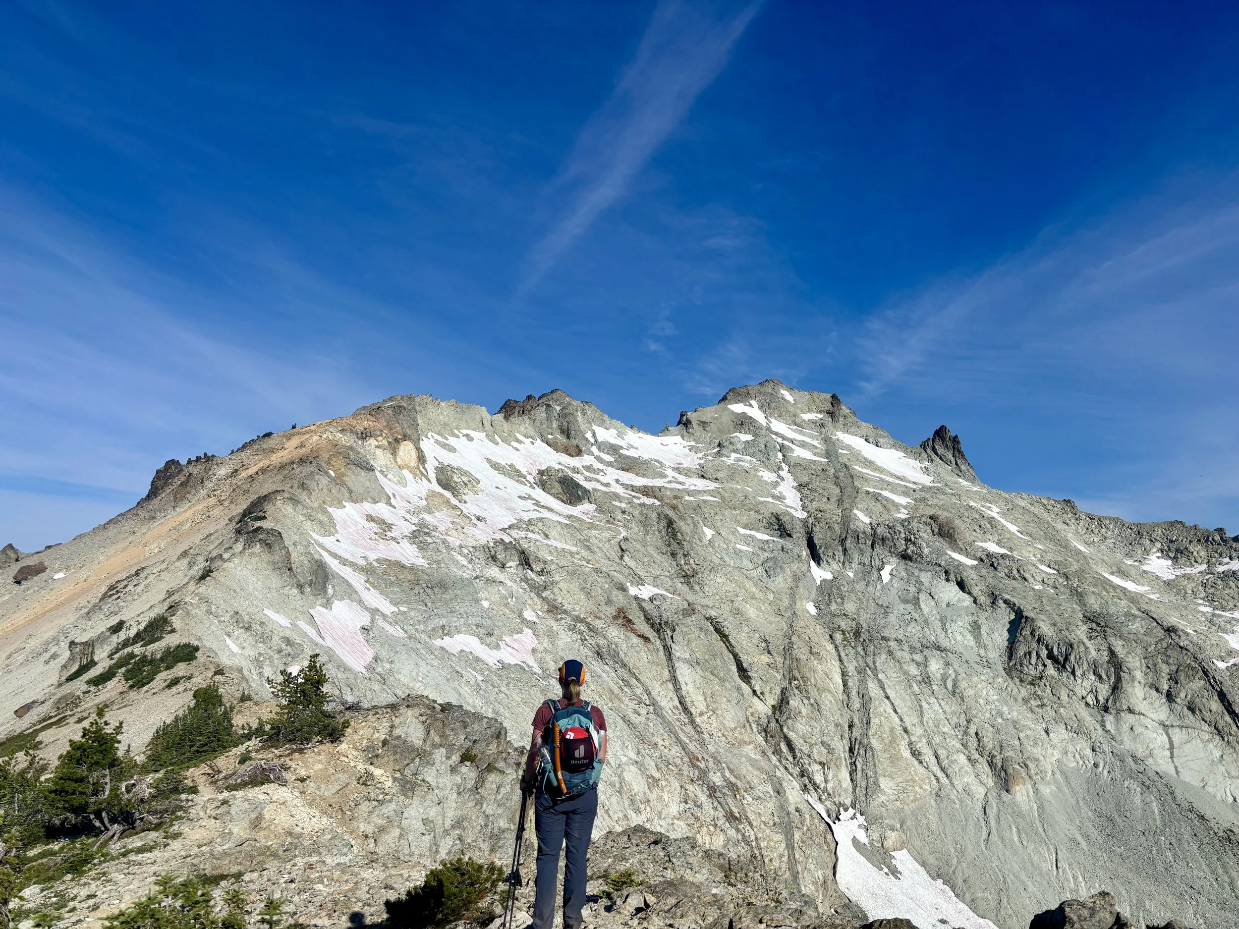 After 4.5 miles on well maintained trails, we turned off of the PCT and took the trail that traverses under Cathedral Rock. I’m guessing this trail doesn’t get any maintenance based upon the state of it, but I was glad there was a trail for this part as there would have been some steep slopes to traverse otherwise. There was a maze of trails around Peggy’s Pond and also an exorbitant amount of mosquitoes. This is the last place to confidently refill on water, but it’s not a great place to stop to rest because you will have 30 mosquito bites before you know it. Once we were refilled with water, we were quickly on our way. There is a social trail that goes up the ridge on the northeast side of Peggy’s Pond. It seems like all of the trails do a decent job of converging to this one.