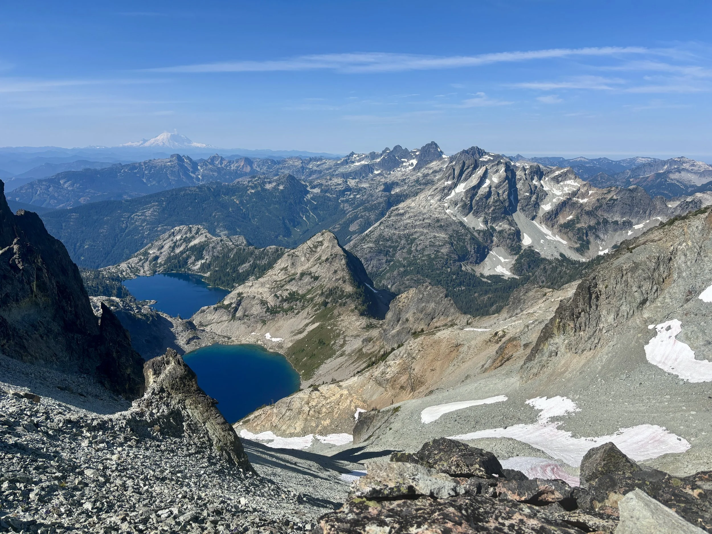Every direction had breathtaking views. Lynch Glacier and Pea Soup Lake to the north were mesmerizing to look at. I really liked the dark spires that rose up out of Mount Daniel’s southwest face. It looked like there might be some fun couloirs to ski there, but we couldn’t tell if any of them actually went. Looking towards Venus and Spade lakes with the dark mountains of Summit Chief and Chimney Rock were also beautiful. And don’t forget Mount Rainier was behind all of this!