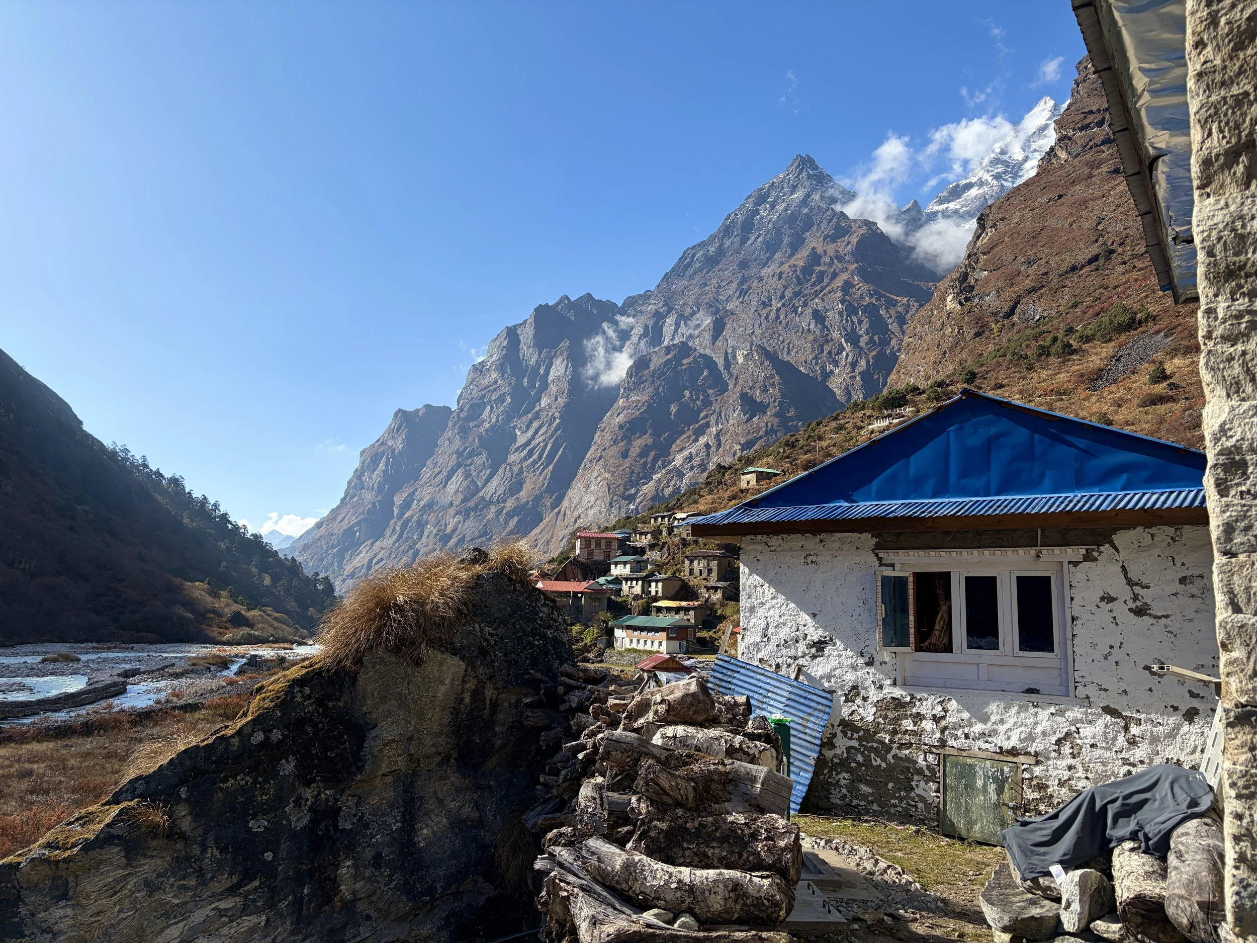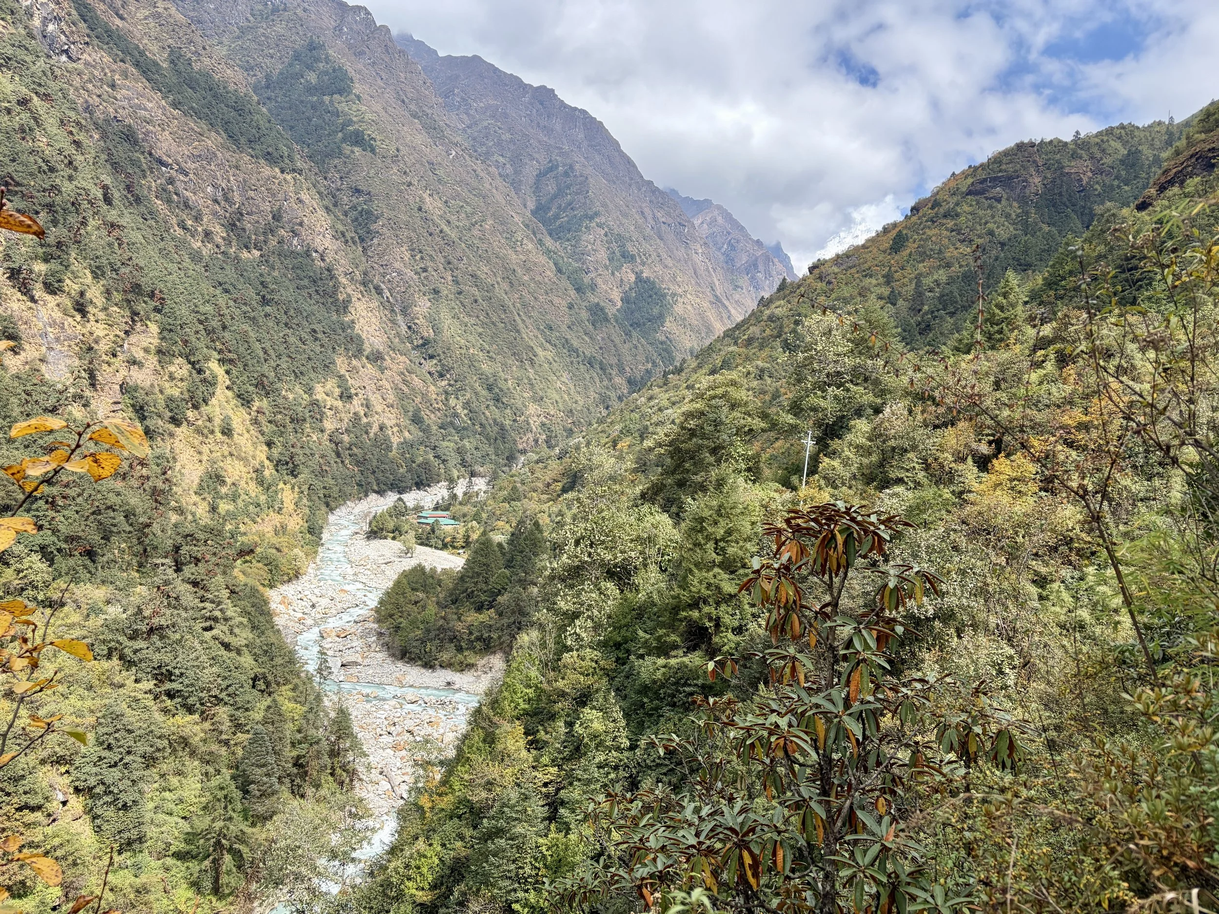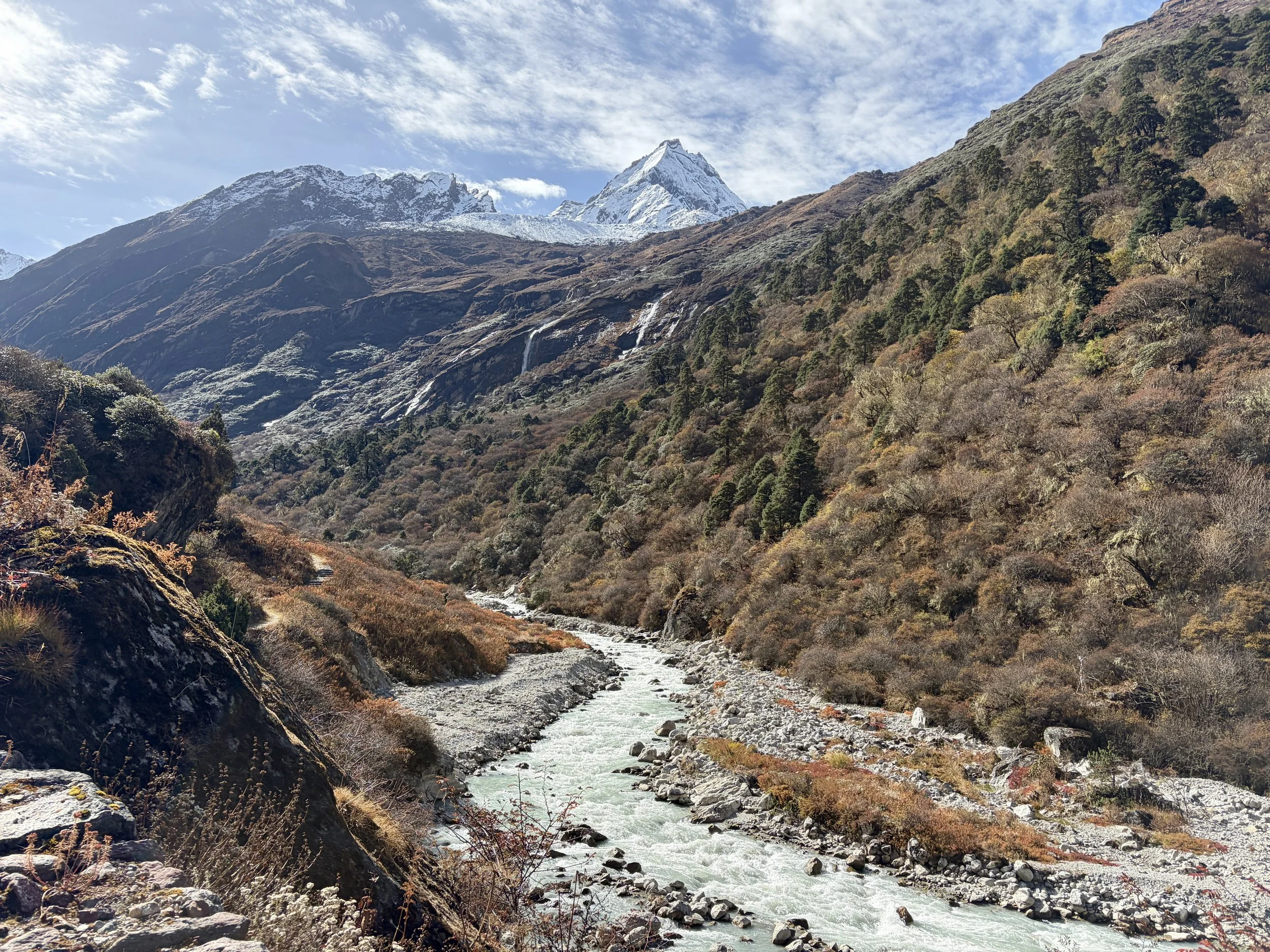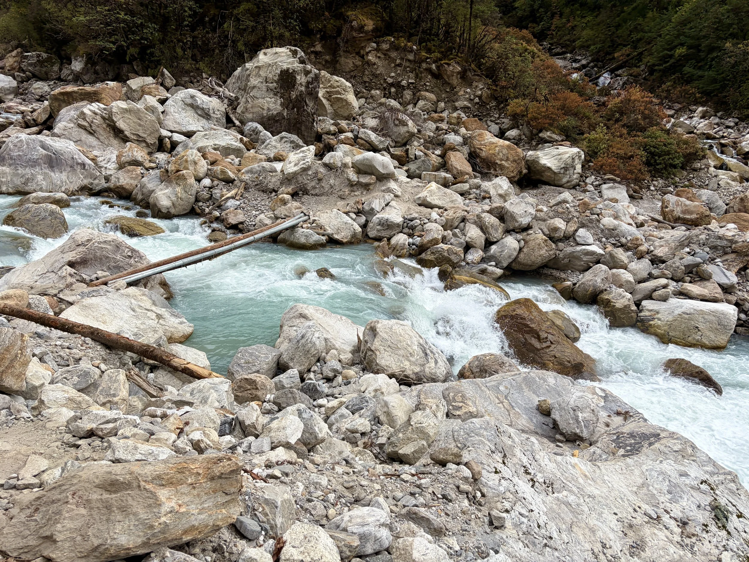 On our fourth morning, we woke up at the same time as the day before, had breakfast at 7am, and were on the trail by 8 again. We continued up the valley along the Rolwaling Kosi River. It was wonderful to spend most of the morning witnessing the power of this river. Our guide told us that 10 years ago it wasn’t as big as it is now. I suspect this is due to glacier melt happening faster than before, but we didn’t get an explanation why from the guide.