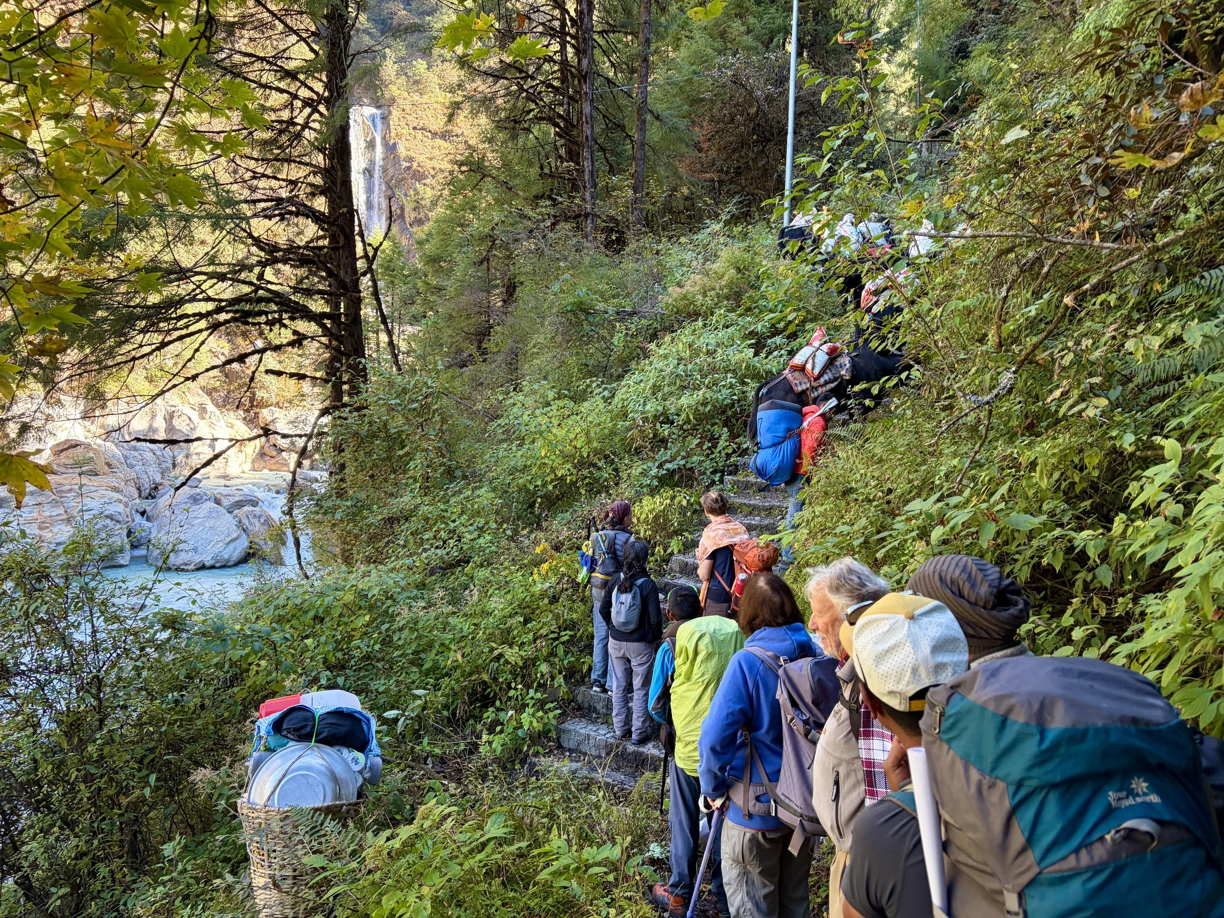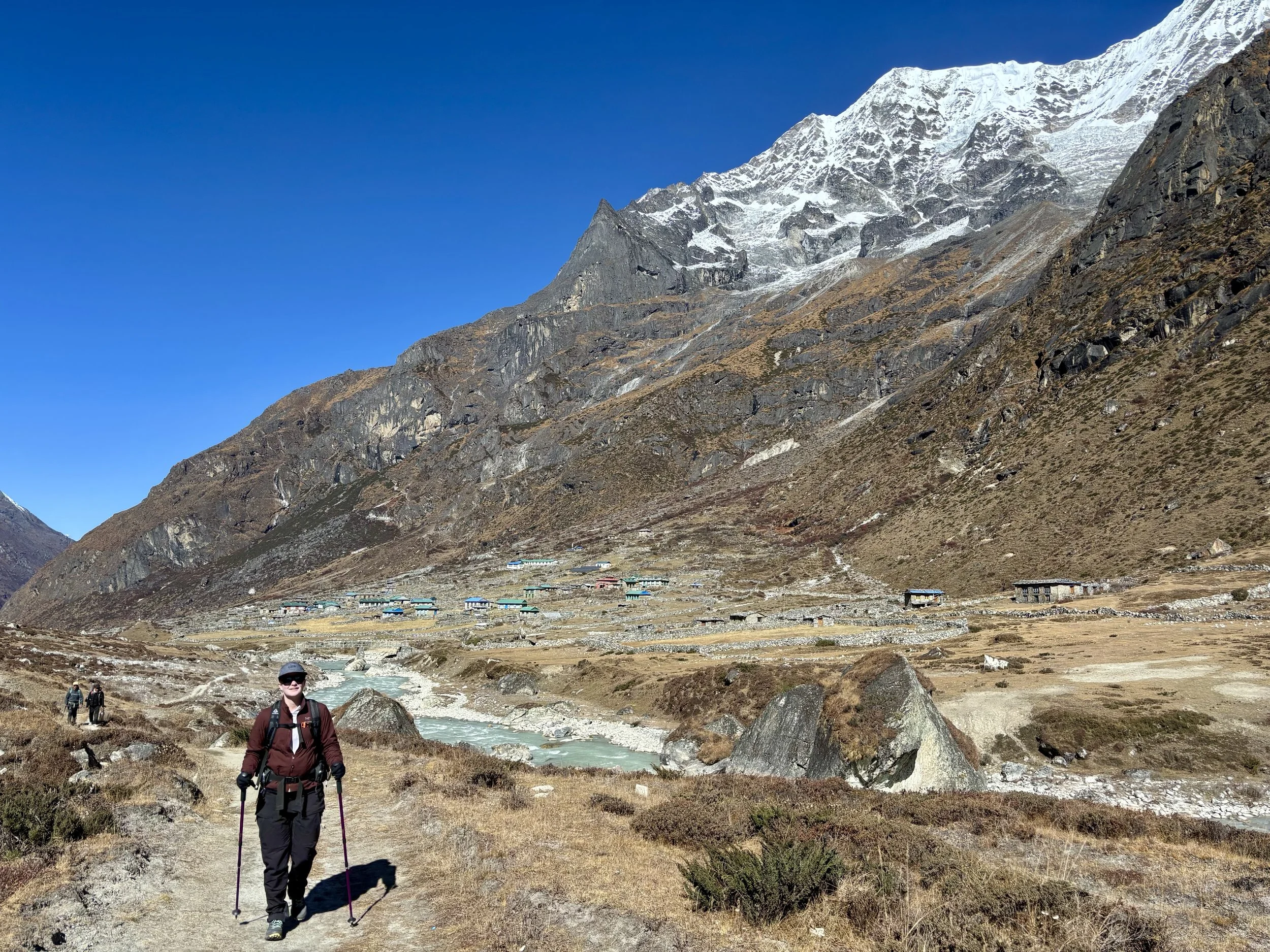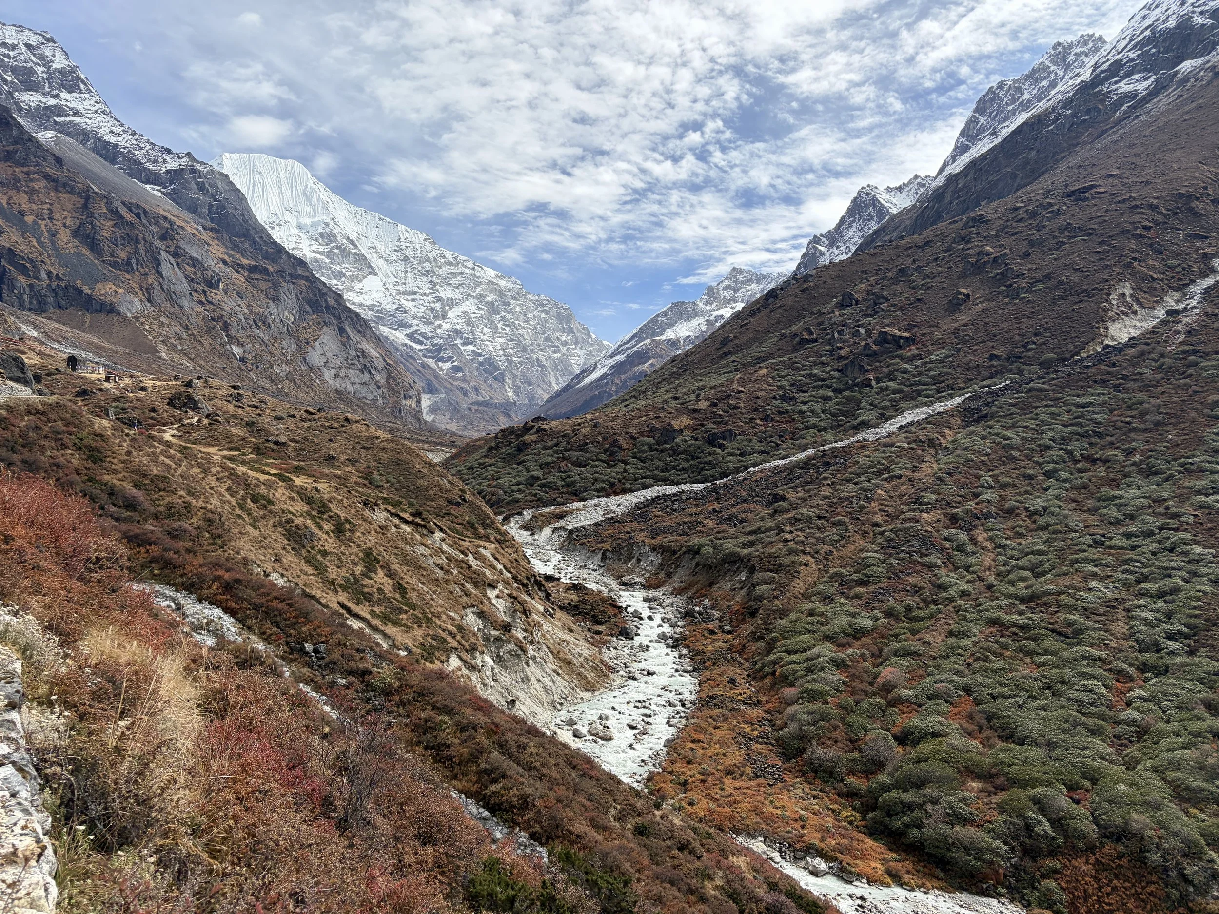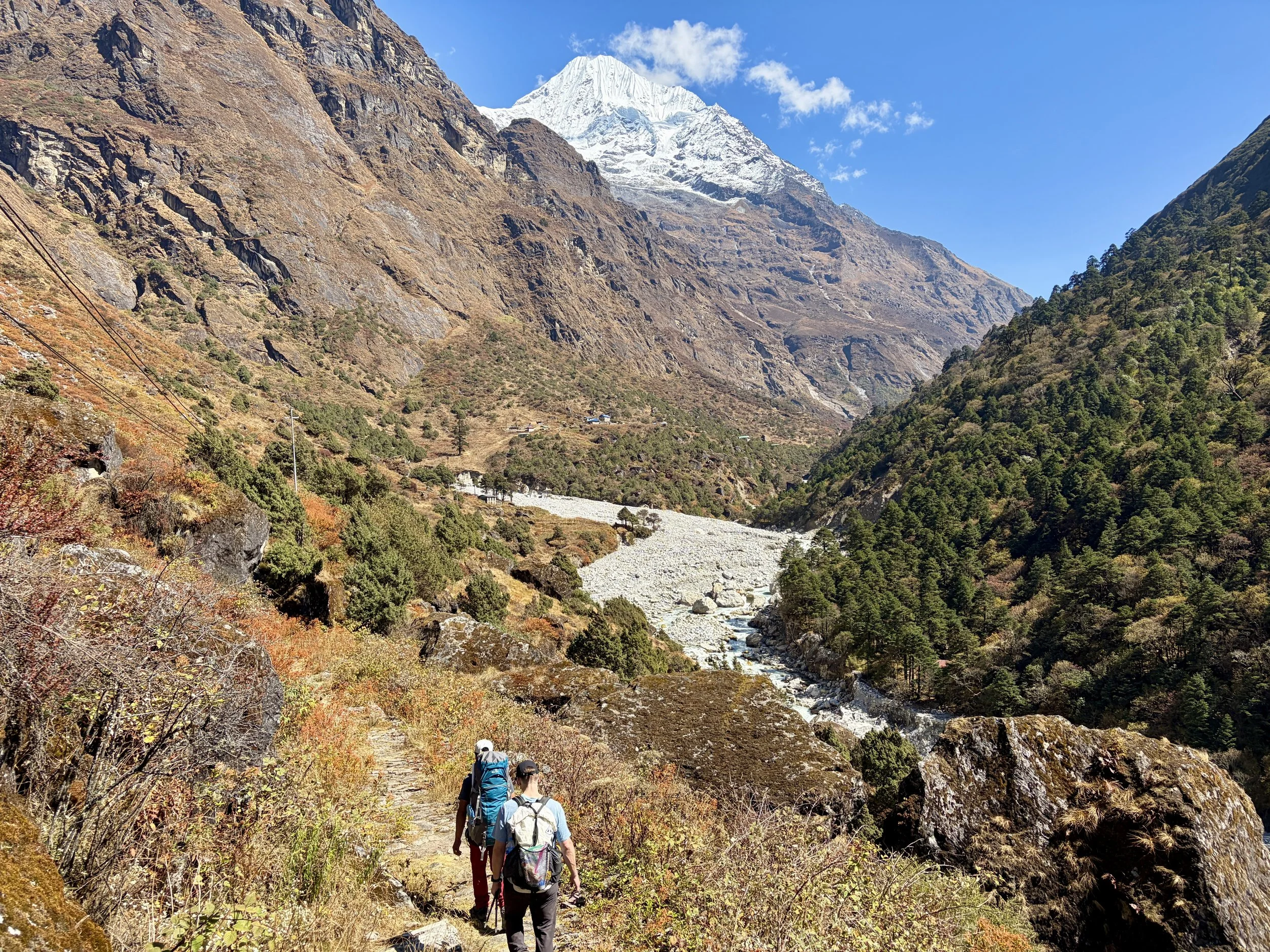 On our fourth morning, we woke up at the same time as the day before, had breakfast at 7am, and were on the trail by 8 again. We continued up the valley along the Rolwaling Kosi River. It was wonderful to spend most of the morning witnessing the power of this river. Our guide told us that 10 years ago it wasn’t as big as it is now. I suspect this is due to glacier melt happening faster than before, but we didn’t get an explanation why from the guide.