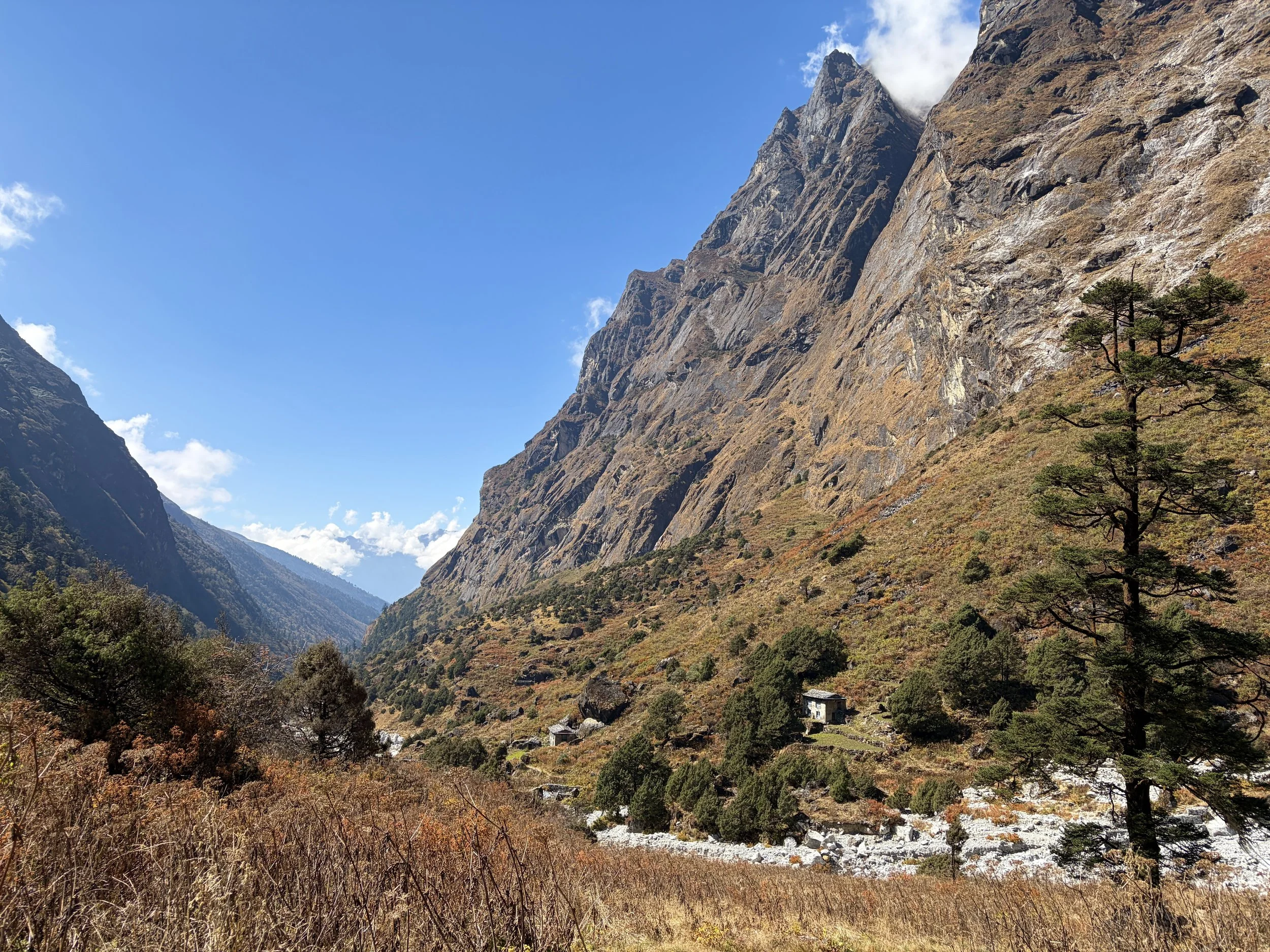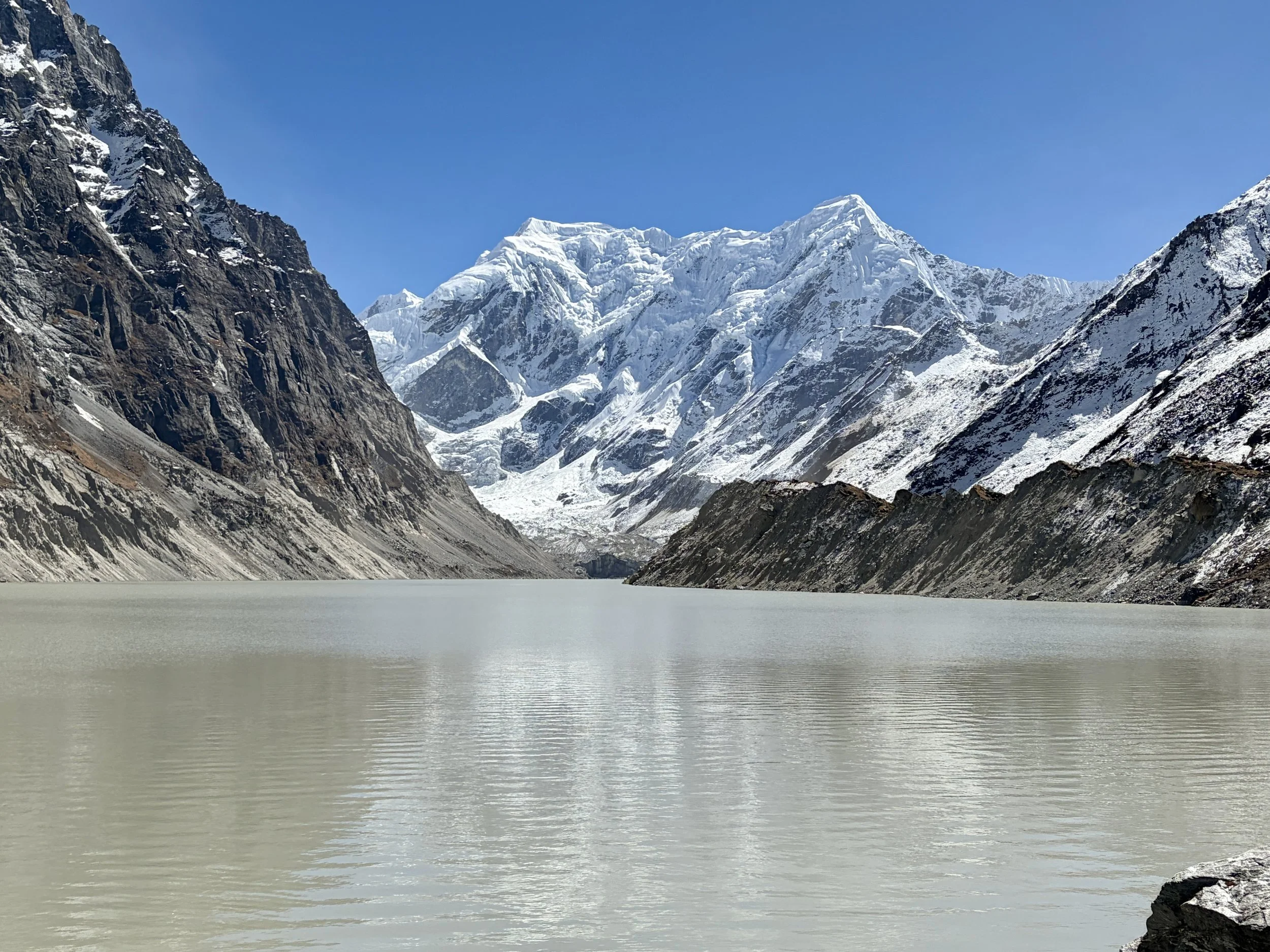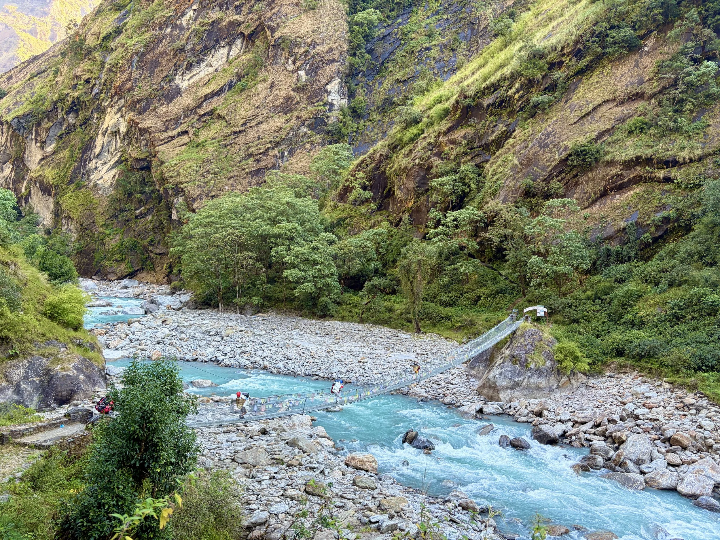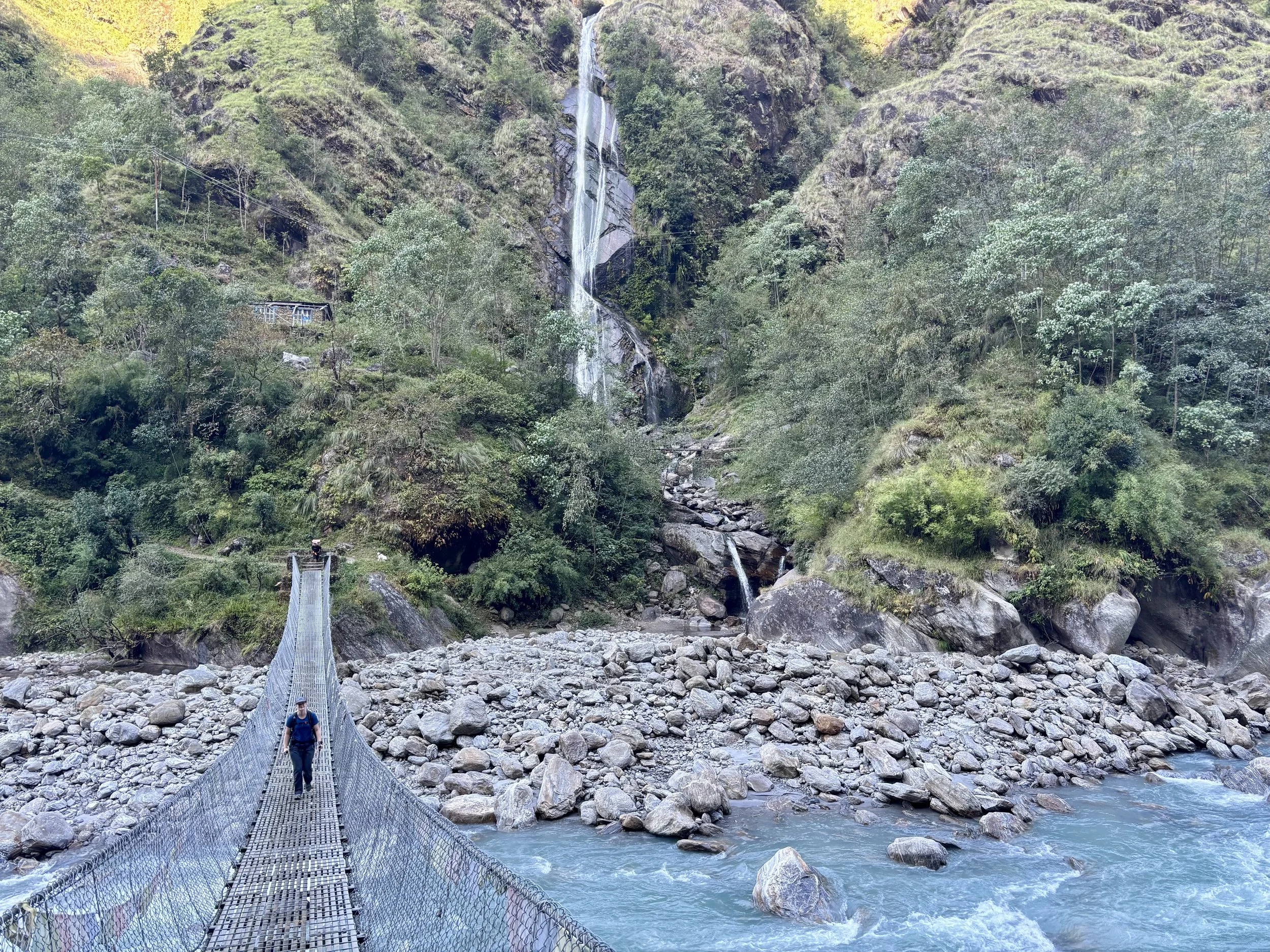 On our fourth morning, we woke up at the same time as the day before, had breakfast at 7am, and were on the trail by 8 again. We continued up the valley along the Rolwaling Kosi River. It was wonderful to spend most of the morning witnessing the power of this river. Our guide told us that 10 years ago it wasn’t as big as it is now. I suspect this is due to glacier melt happening faster than before, but we didn’t get an explanation why from the guide.