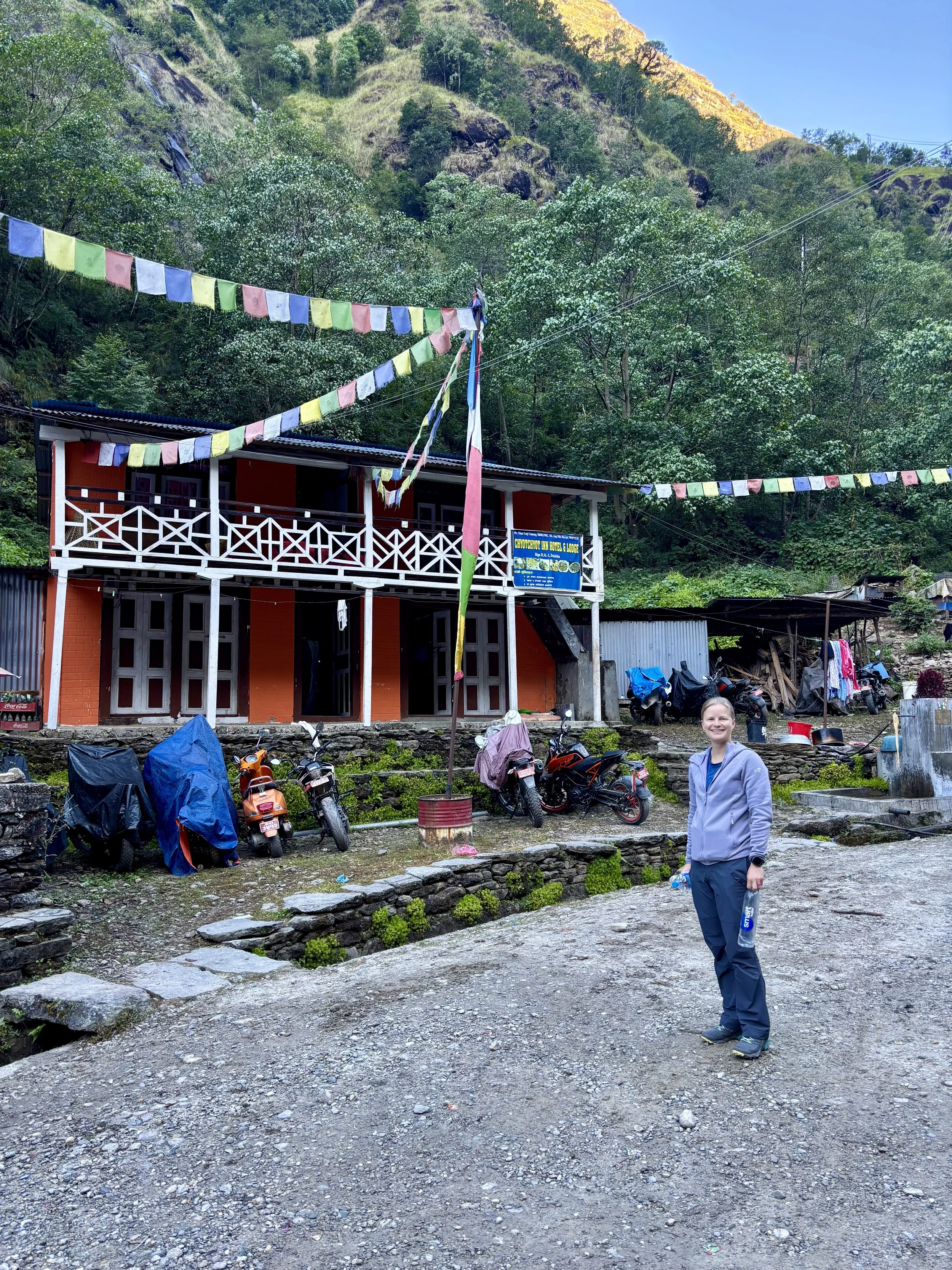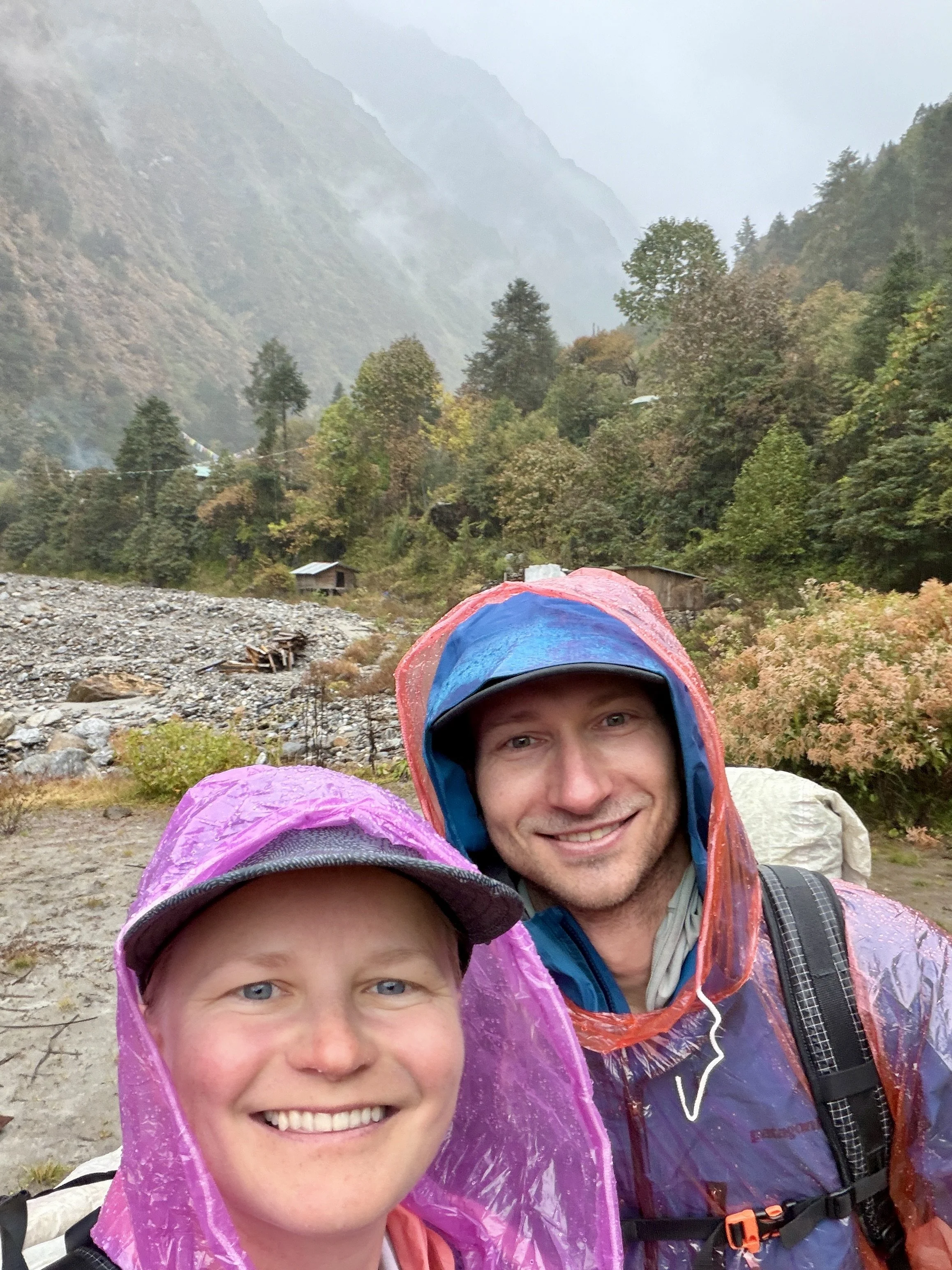 We woke up to pouring rain. The rain had started at midnight. Our guide, who was unhappy the day before about our decision to turn around, praised us for our smart decision to turn around and was in a much better mood himself. With no end to the rain in sight, we decided to hike to Simigaun in the pouring rain after breakfast. The rain was motivating, and we found ourselves back in Simigaun in 3 hours. I don’t think I’ve ever been so soaked in my life despite having a poncho, waterproof pants, and Gore-Tex shoes. Since it had already felt like I had been standing in a shower all day, I took my first shower since the last time I was in Simigaun on day 2, and it felt marvelous. After putting on some dry clothes and ordering some hot tea, we sat and watched the rain and wondered how much snow was falling up on Tashi Lapcha Pass. Our guide guessed meters. We were so happy with our decision to descend. We once again slept well that night!