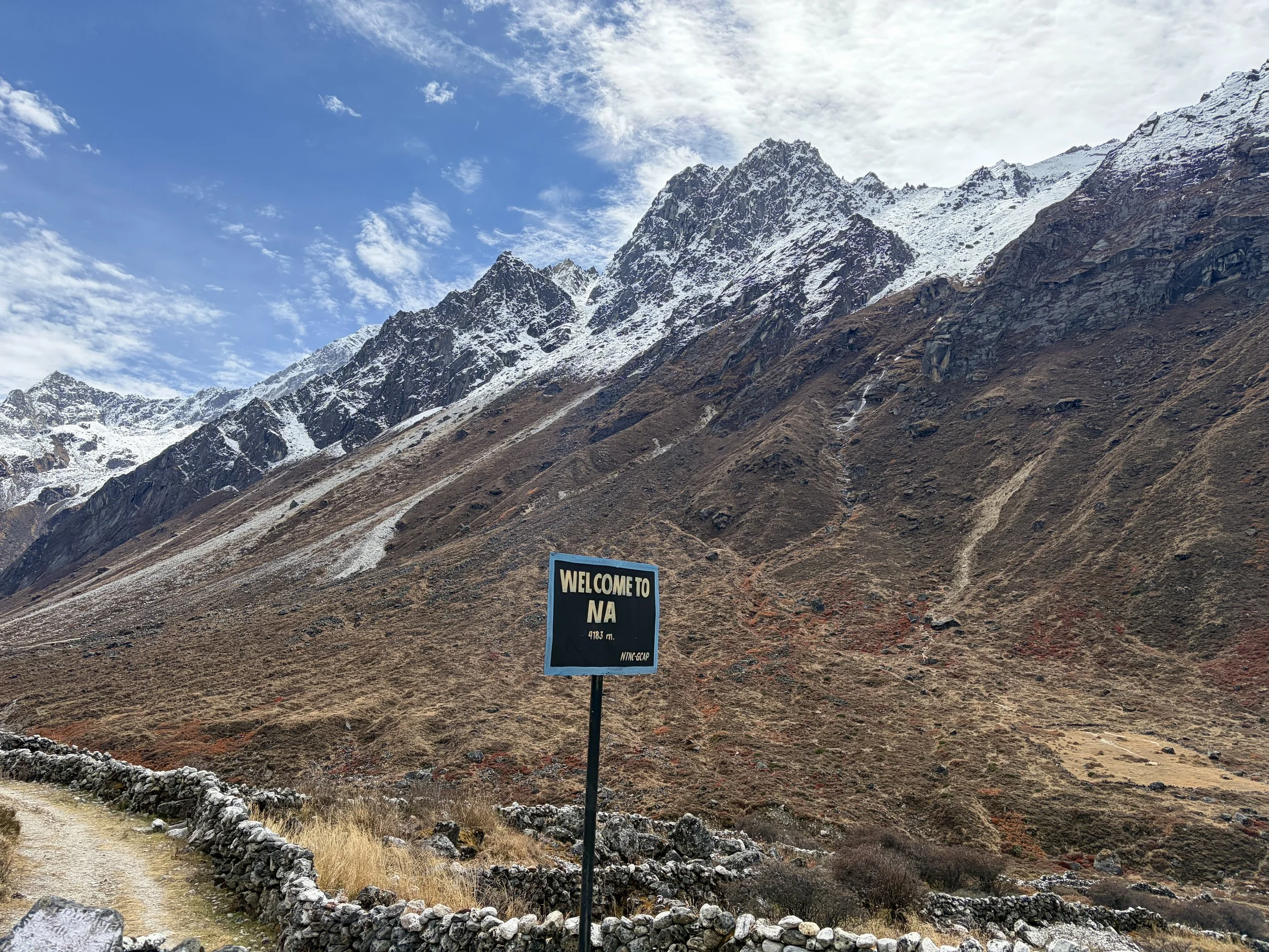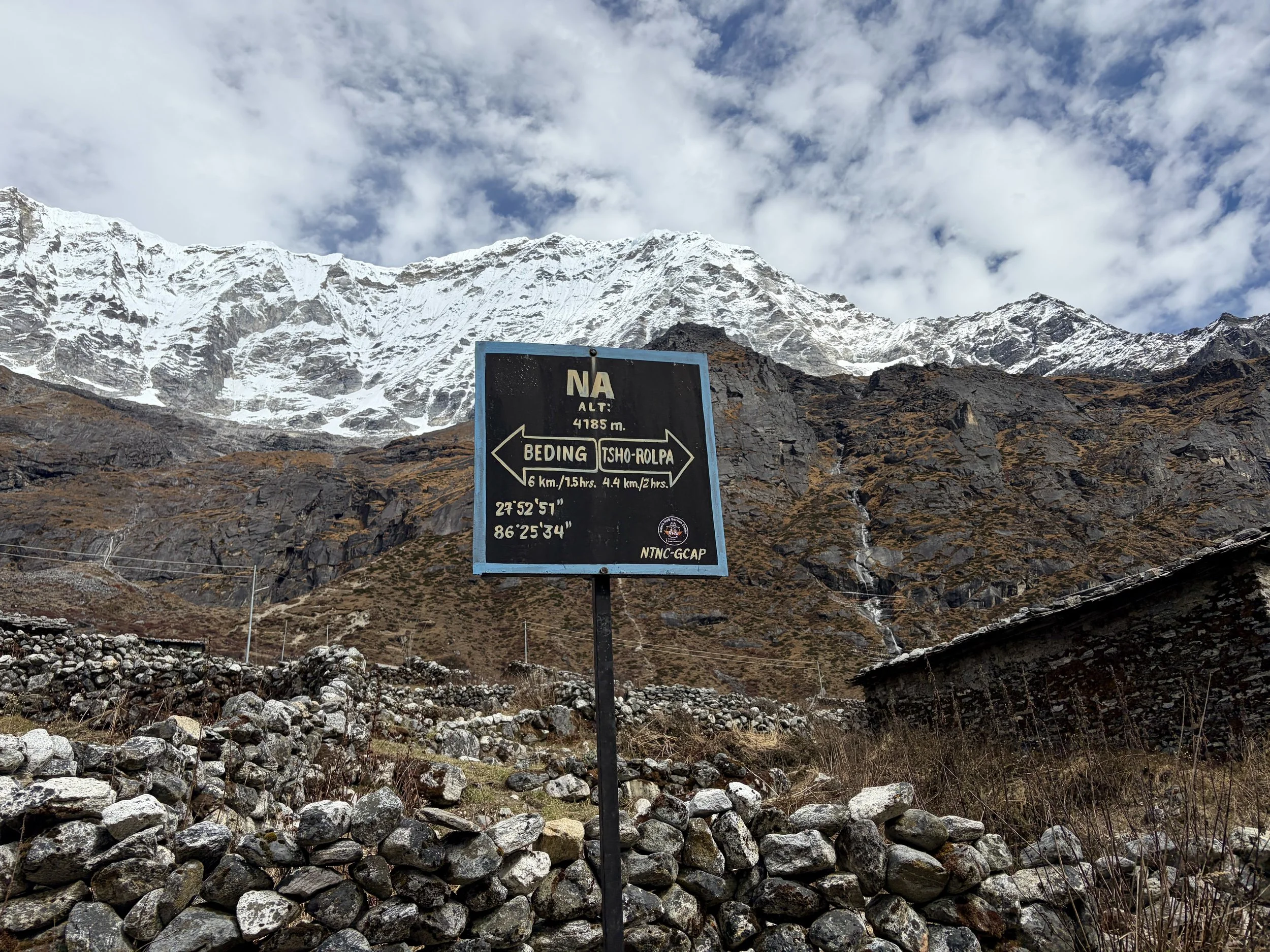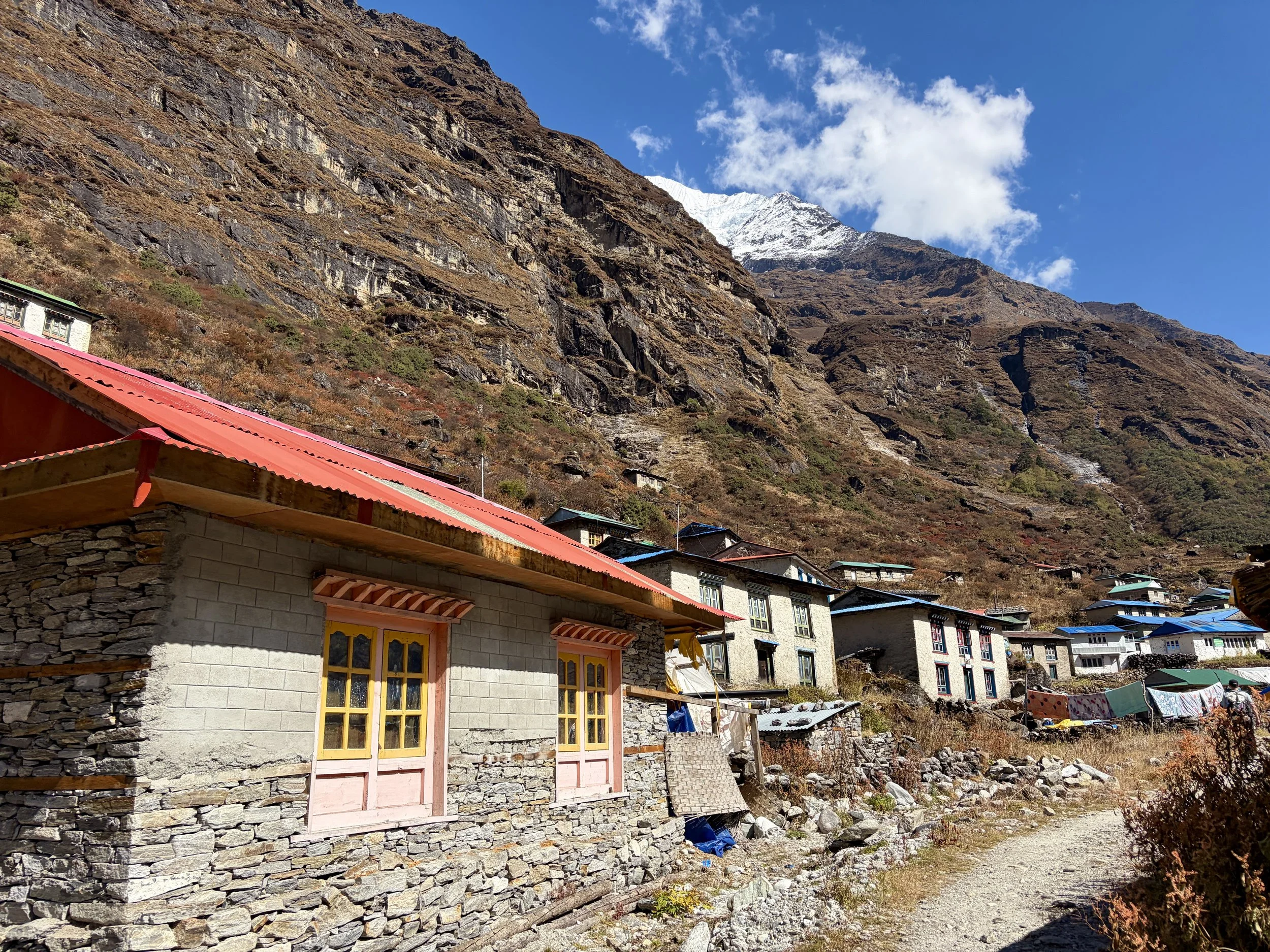 After two full days of trekking, today was going to be much shorter so we all slept in an extra hour and had breakfast at 8am. An hour later we were on the trail, continuing to head up valley along the Rolwaling Kosi. Beautiful views of the mountains surrounded us for the entire day. If you looked back at any point, you’d have fantastic views of Gaurishankar. We were also finally able to see the summits of the peaks on the south side of the drainage and admired them as waterfalls cascaded off of them for thousands of feet down into the river. We only saw locals walking the trail this day. My favorite part of the day was seeing all of the prayer flags that led up to a monastery just to the west of Na with a beautiful mountain, Chekigo, in the background. As we entered Na, we stayed in the teahouse that was run by the same folks that ran the teahouse we stayed in Beding. It even had the same name in both locations: Na-View Point Hotel. We arrived at lunch time so we sat down and had some hot lemon water as we ordered some garlic soup and chow mein for lunch. After lunch we did some outdoor laundry and then relaxed for the rest of the day. The temperature had gotten noticeably colder each day of the trek, but in Na, it was really starting to feel cold. The snow line was only a couple hundred feet above the town. We were happy to have -40 degree sleeping bags with us to keep us warm!