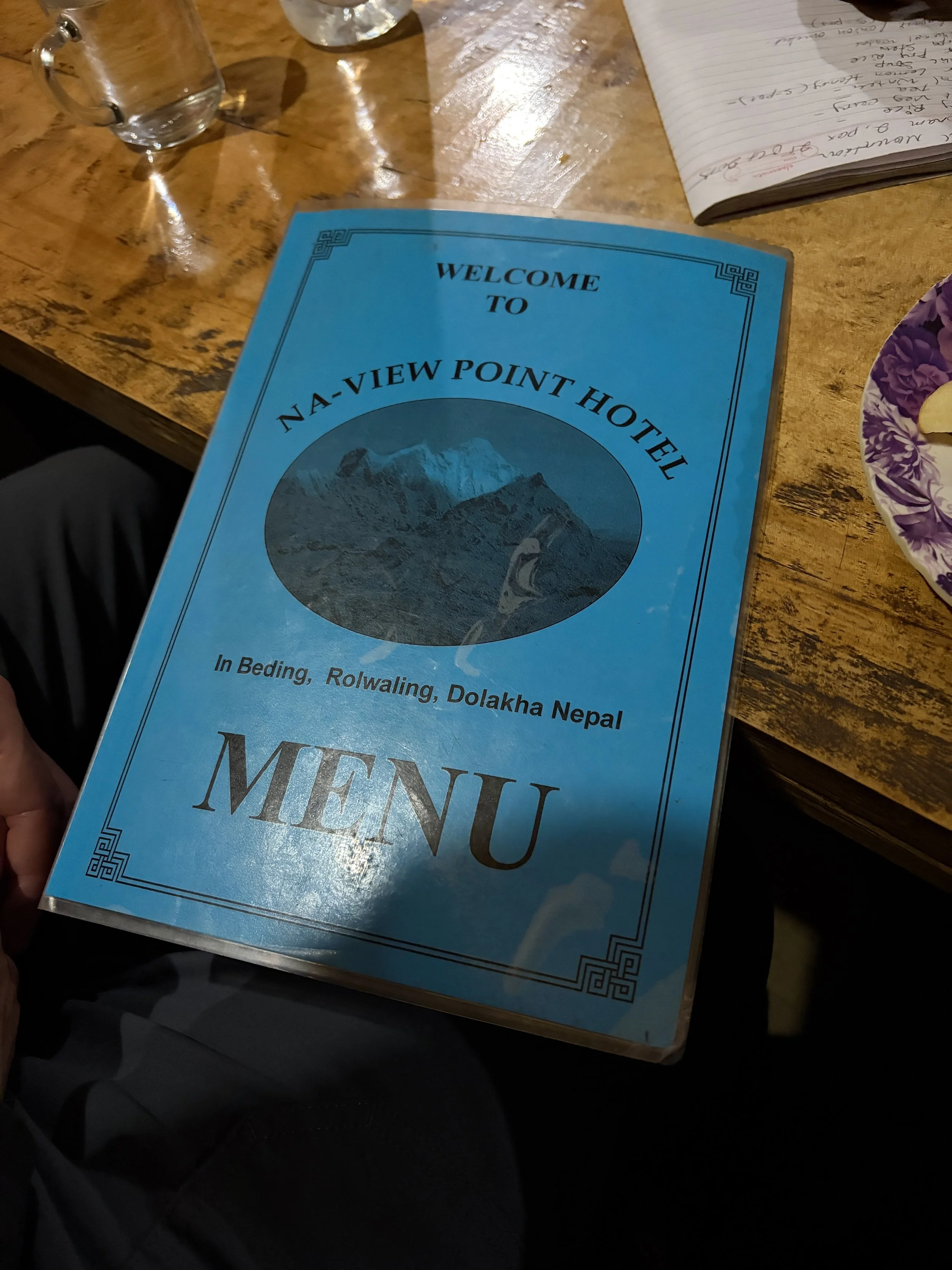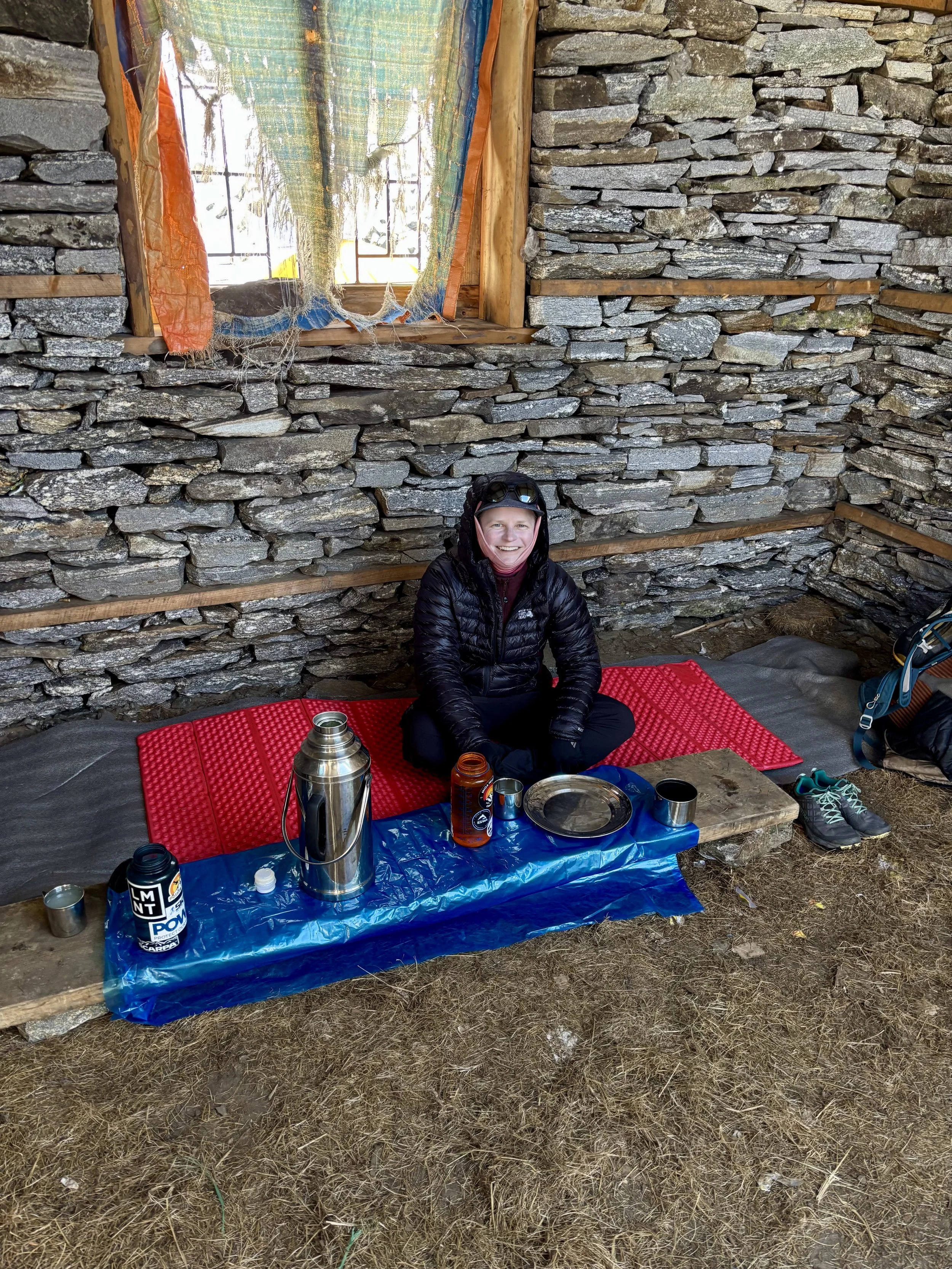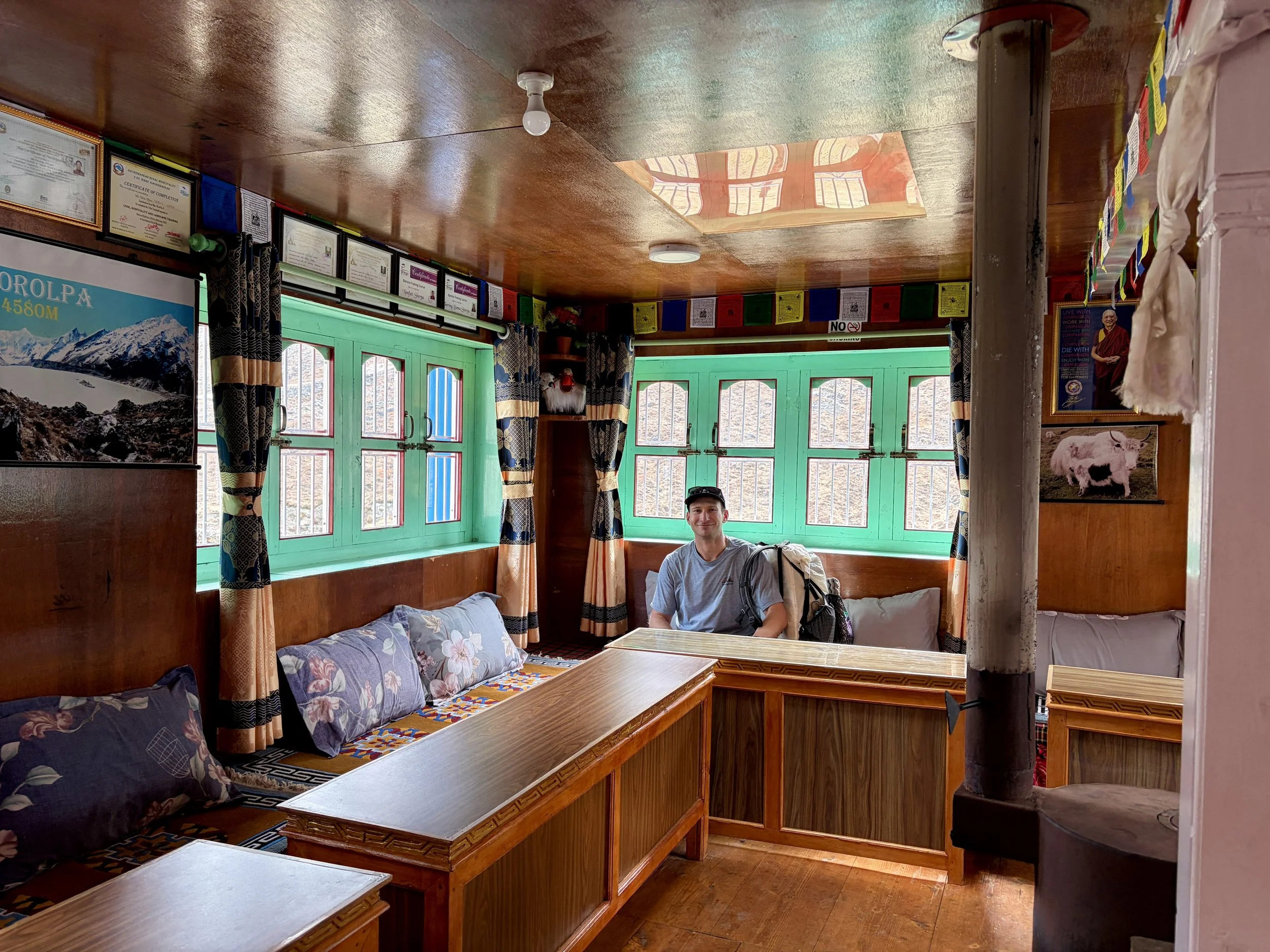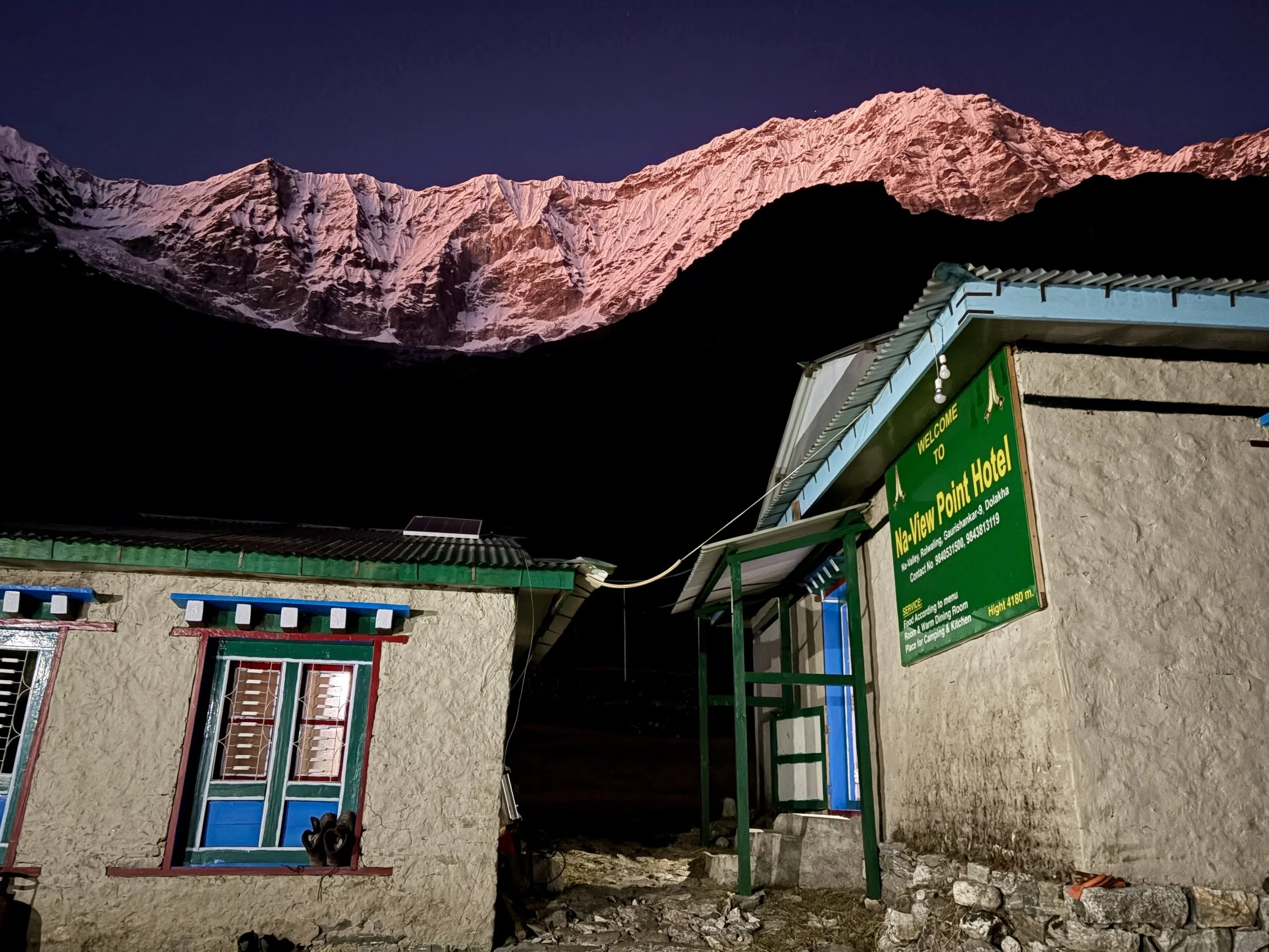 With our headlamps as the only light, five of us set out from camp. The crew consisted of me, Mike, our guide, one of the porters (he just wanted to join), and a local man that lived in Na that had been up the peak a few days prior named Dorje Sherpa. The trail immediately started gaining elevation, and since we were starting the day already at almost 16,400 feet, my pace was pretty slow. We followed a trail that was a mix of moraine and snow for the first mile or so. We traversed along a ridge for a while and then ultimately found ourselves at the base of a glacier. What was hard to determine from where we were was if it was actually a glacier (Gaia said it was, but many “glaciers” on a map now no longer even have snow). Our guide was unsure and Dorje was insistent there were no crevasses (Dorje was a bit of a character so we were hesitant to believe him), but our guide wanted to go with what Dorje said and so we didn’t rope up. Turns out, it was still a glacier and we saw some crevasses. We pointed this out to our guide and told him we’d be roping up on the way down. Thankfully, nothing bad happened and we found ourselves at the bottom of the summit block. A boot pack had already been kicked in and was fairly easy to ascend in boots and crampons. We soon found ourselves on the summit, at 18,471 feet- the highest both of us have ever been. We sat and had a nice snack break and enjoyed the 360 degree views that we had. Once we were ready, we headed back down the way we came up. When we got to the glacier our guide roped us up in a manner where I expected to walk first, followed by Mike, and then the guide, but our guide took off first with all of the extra rope around him. He also put us exceptionally close to each other, and I’m not sure we would have been able to catch any falls without all of us being pulled into the crevasse. We didn’t realize this until we were already on the glacier. Since we already had made a point about the mistake on the way in and morale was a little off between us and the guide because of his mistake earlier, we decided the best option was just to keep moving since we were already on the glacier and the amount of time it would take to cross it was 5-10 minutes (less time than it would have taken to change things and have a whole discussion about it while standing on the glacier). We made it across fine, but put it on our list of learning experiences. Once across the glacier, we took off our crampons and walked the rest of the way back to camp where hot soup was waiting for us. We had lunch and packed up our bags and then continued hiking to head back down to Na for the night. After our short, cold night, I was excited for a teahouse (which was also cold but still warmer).