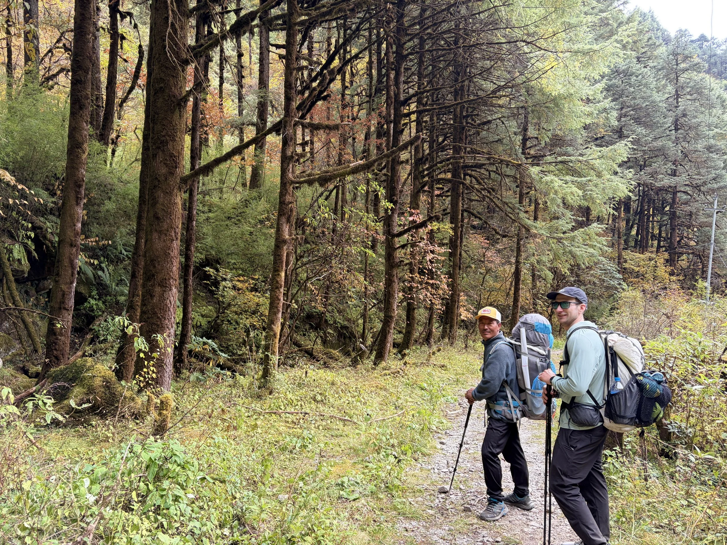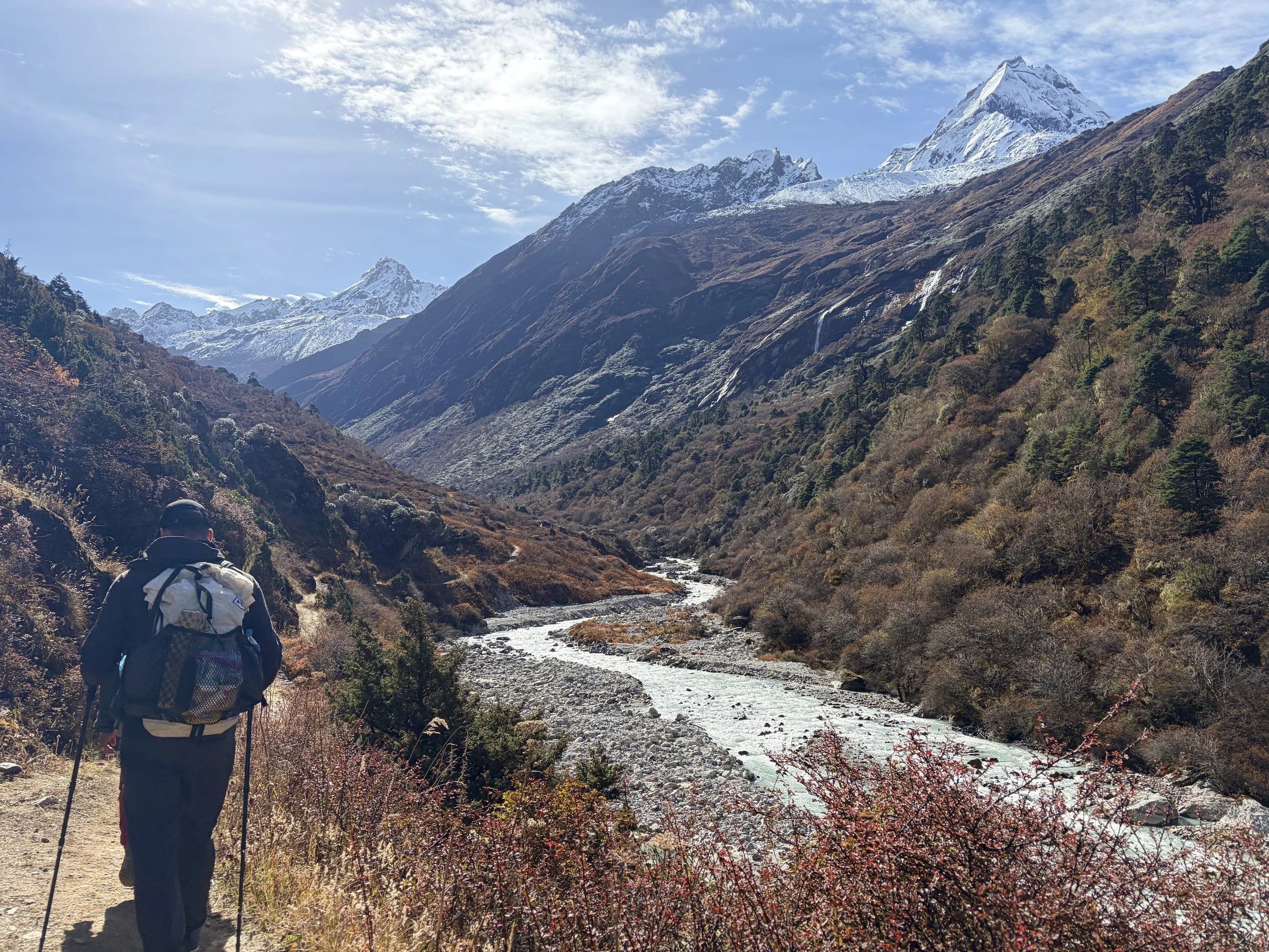Upon refreshing the weather forecast, we decided we would turn around the next day and head out the same way we had come in. The forecast was for 5 feet of snow to fall in two days and for another 12 feet to fall between Thursday and Friday at the top of Tashi Lapcha pass. Even if these estimates were off to some degree, the magnitude of the amount of snow to come was too high for us to continue the trek. It was simply unsafe to continue. We showed our guide these forecasts, and shockingly, he still wanted to continue. Ego seemed to be the issue, but we told him it really wasn’t a discussion, and we’d be turning back. We asked to plan to hike as far as we could the following day when the weather would still be nice. Particularly, we wanted to make it over the makeshift bridge on the river that we suspected would wash out the next time the river surged. So it was decided that we would wake up early to retreat all the way to Dongang in a day.