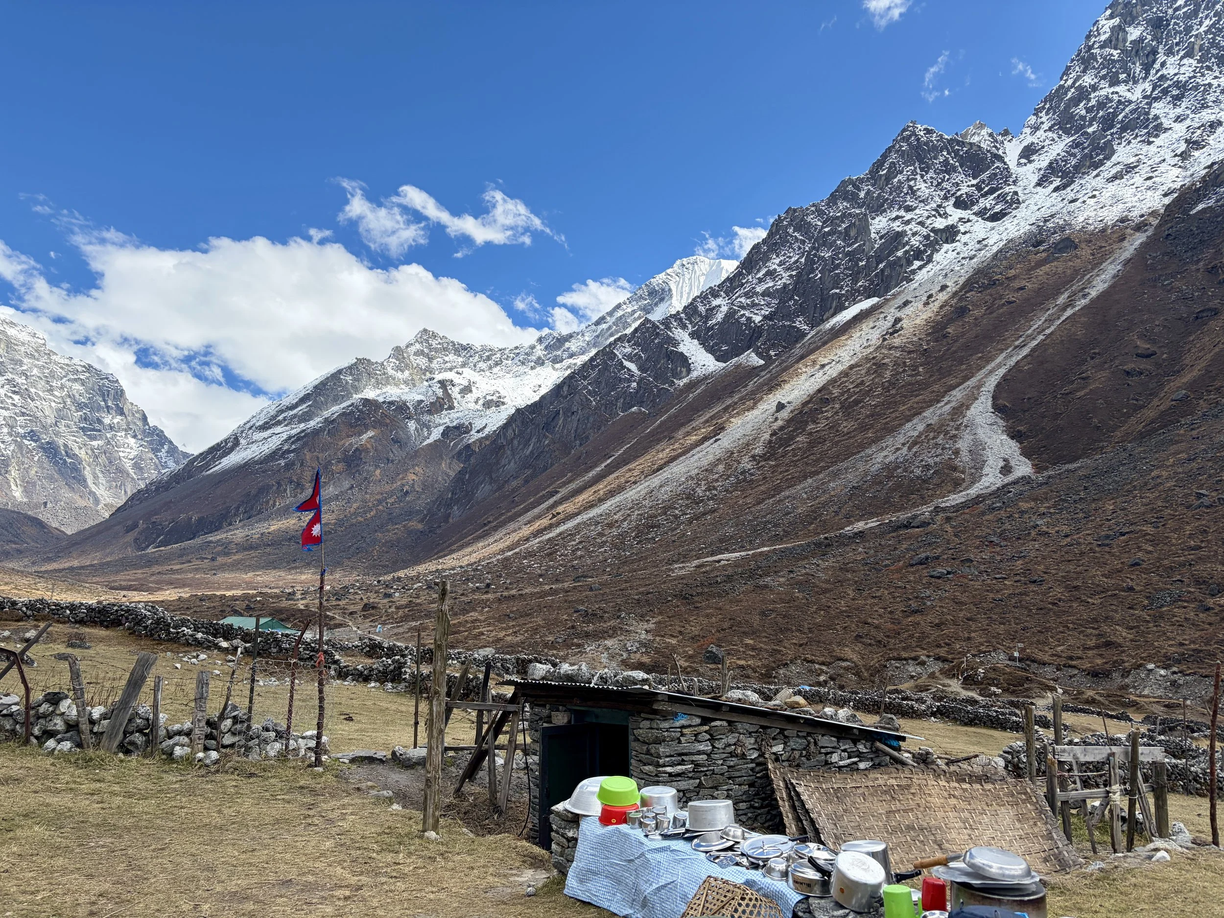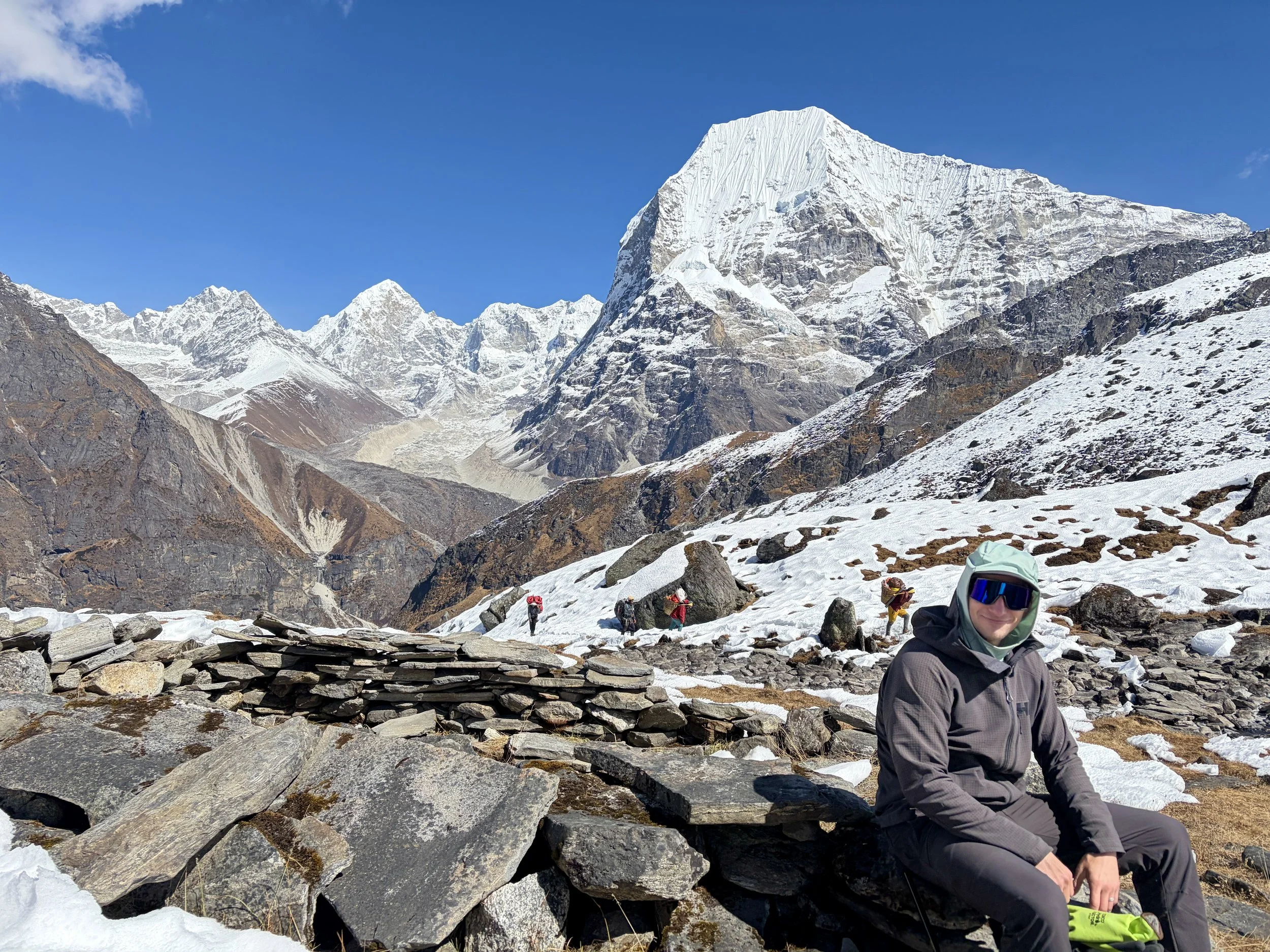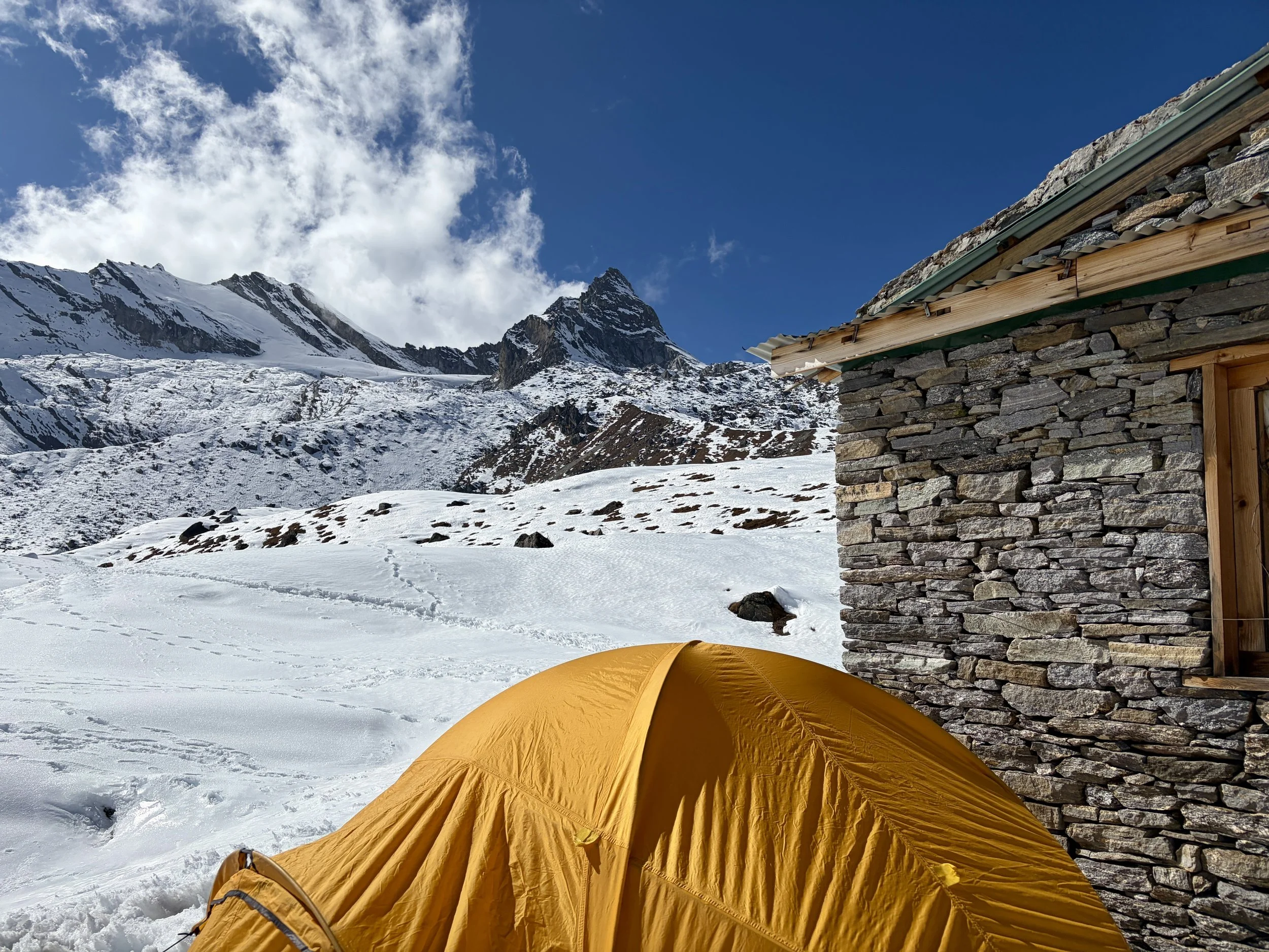 After a nice day off to rest, we were ready to begin the trek up to basecamp for Yalung Ri. We headed out from the teahouse and continued heading up the Rolwaling Valley. After 10-15 minutes of hiking, we took a trail that cut off to the right and started climbing up a steep trail. This trail had countless switchbacks and quickly gained elevation. After ~1000 feet of elevation gain, we hit snow line and found ourselves walking on a trail that was half melted and half frozen steps. It was tricky walking and each step required focus to not slip and fall. I commend the porters for making it up that trail. Eventually the trail flattened out and after a little longer, we found ourselves at a porter hut where some of our porters were waiting for us with our tent already set up. We were welcomed with hot lemon water and settled in to our tent. After a delicious dinner from our cook, we headed to bed early with a 2:45am alarm set for the next day.