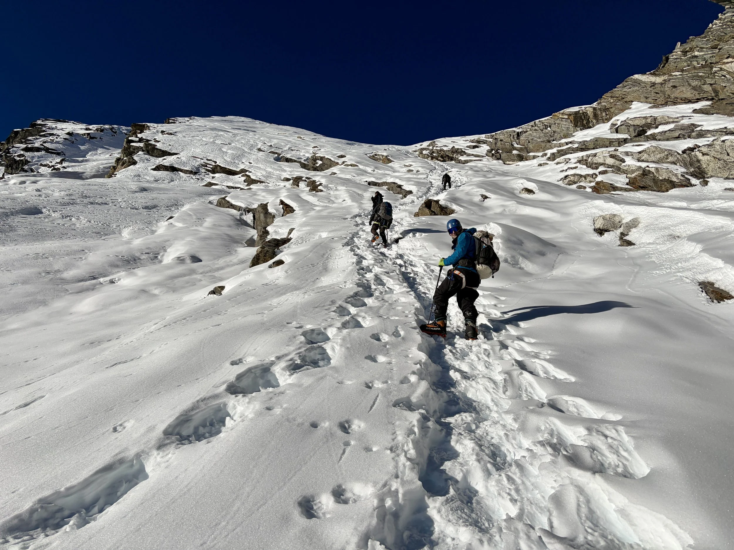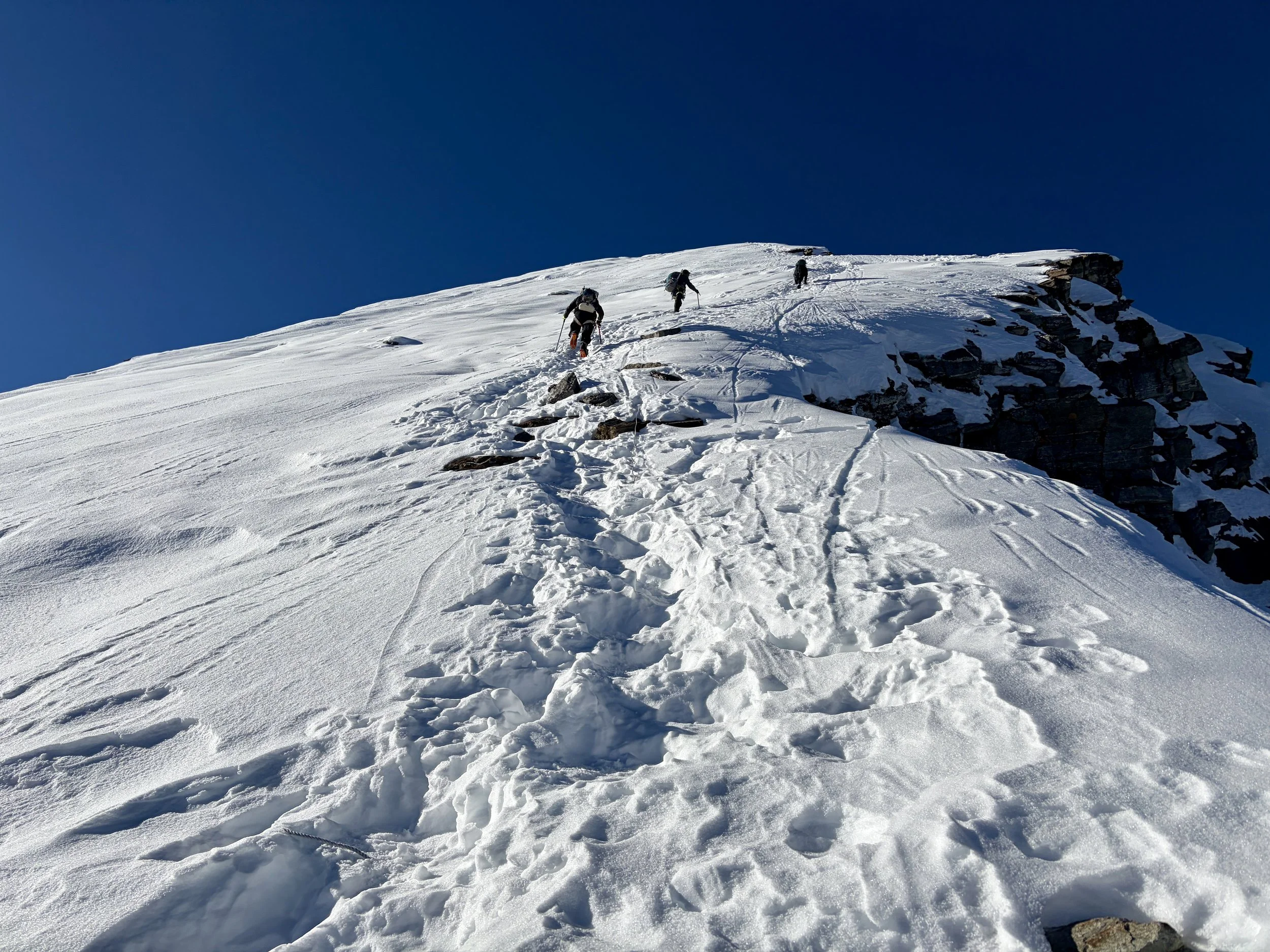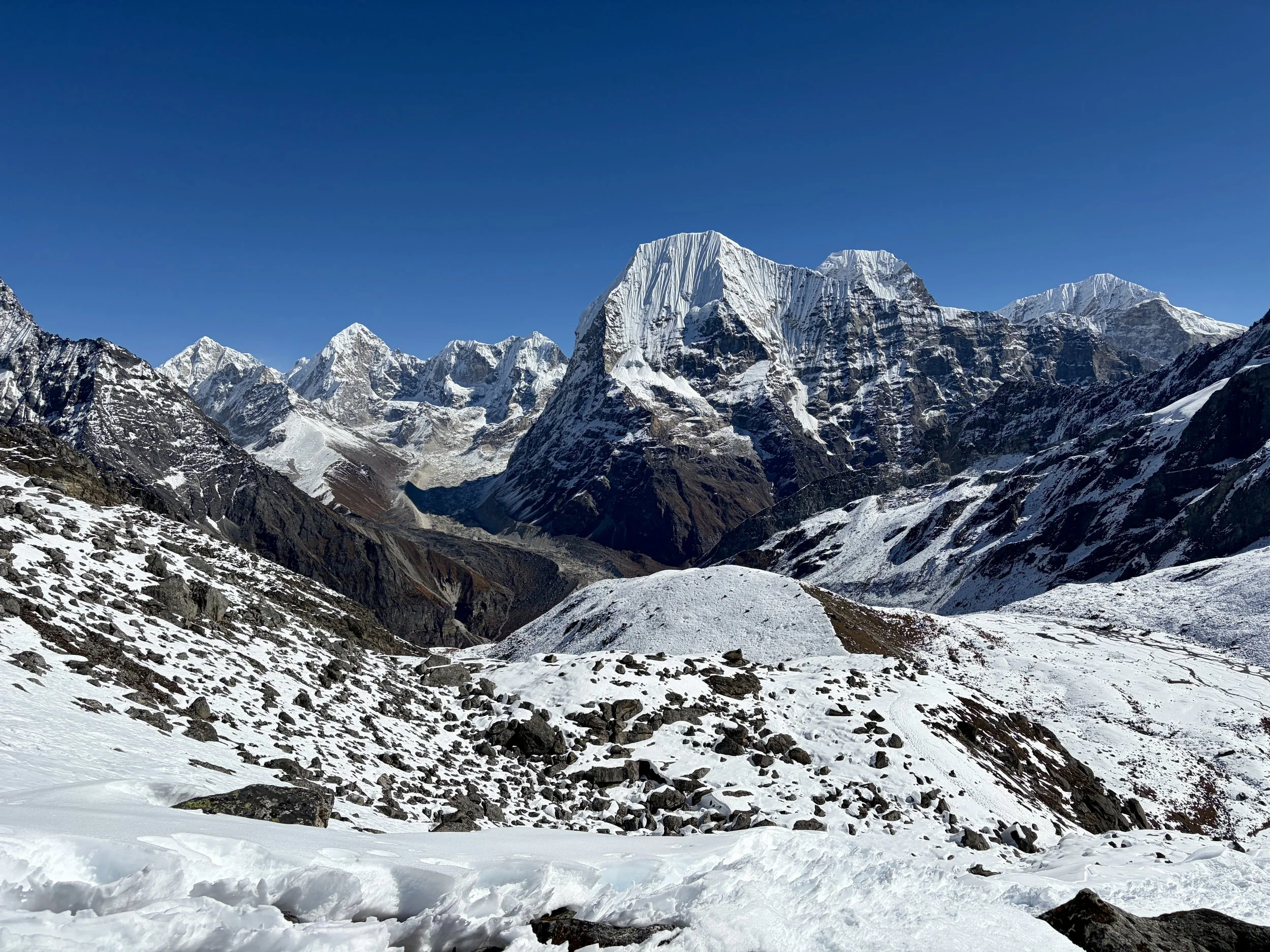 After a nice day off to rest, we were ready to begin the trek up to basecamp for Yalung Ri. We headed out from the teahouse and continued heading up the Rolwaling Valley. After 10-15 minutes of hiking, we took a trail that cut off to the right and started climbing up a steep trail. This trail had countless switchbacks and quickly gained elevation. After ~1000 feet of elevation gain, we hit snow line and found ourselves walking on a trail that was half melted and half frozen steps. It was tricky walking and each step required focus to not slip and fall. I commend the porters for making it up that trail. Eventually the trail flattened out and after a little longer, we found ourselves at a porter hut where some of our porters were waiting for us with our tent already set up. We were welcomed with hot lemon water and settled in to our tent. After a delicious dinner from our cook, we headed to bed early with a 2:45am alarm set for the next day.