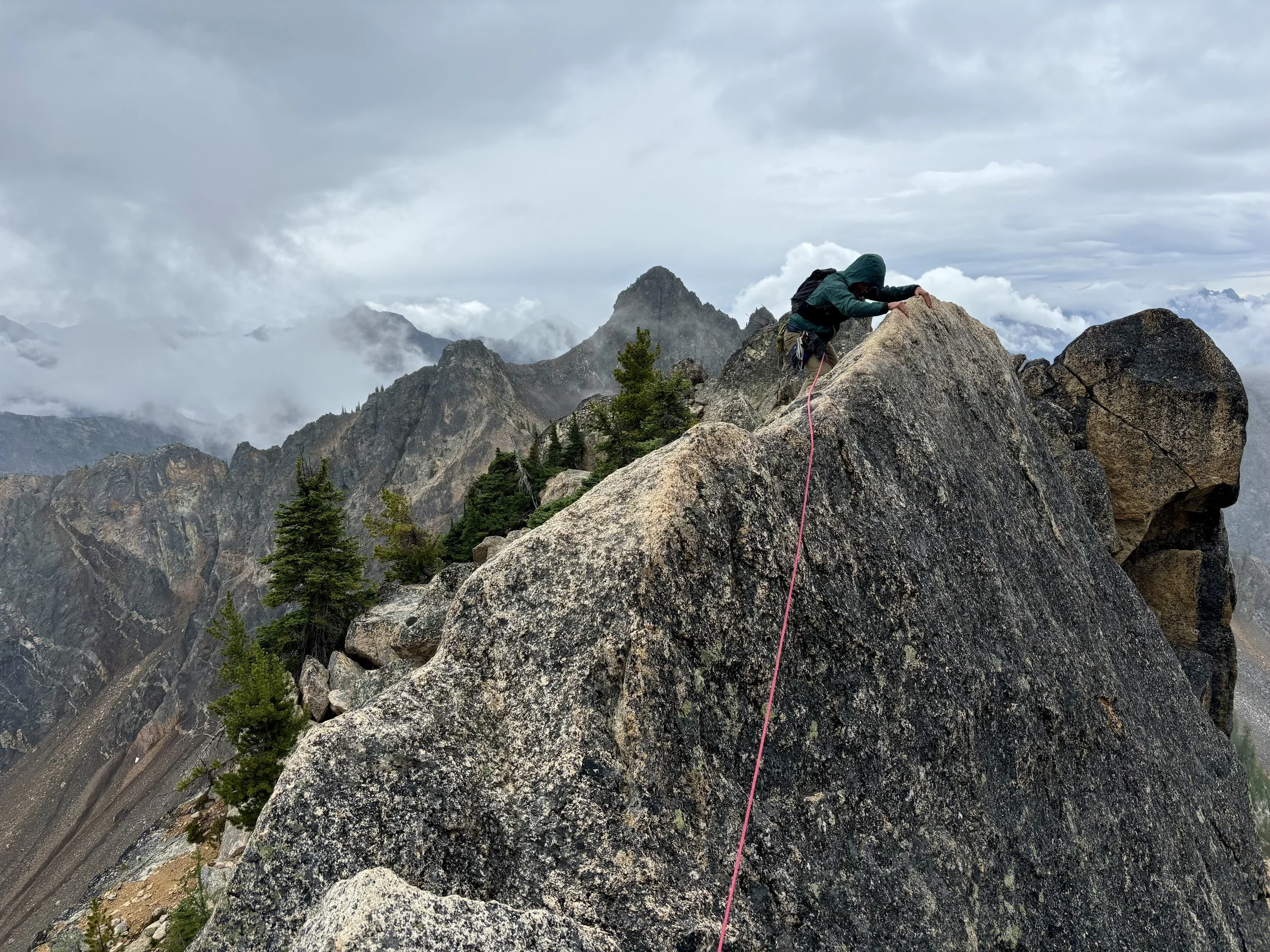 We parked at the Blue Lake Trailhead and began hiking up to the bottom of the climbing route. The hiking portion was about 2.5 miles with about 1900 ft of elevation gain. Once we got to the bottom of the route, we put on our harnesses and roped up. Tino led the first pitch, which ended up being the hardest pitch in my opinion. The rest of the route involved some class 3, class 4, and low class 5 climbing. One part involved traversing a rock that dropped off on both sides that I found was pretty fun to cross. It looked like it was going to rain most of the day and at one point it did start lightly raining for about 10 minutes. Had it kept raining and the rock gotten any wetter, we probably would have turned around. The weather held out for us though, and we ended up making it to the top. After a snack break, we headed back down the way we came up. This was a really fun route to get our first exposure to some alpine rock climbing. We’d be coming back to the same area in two days to try a route up Liberty Bell.
