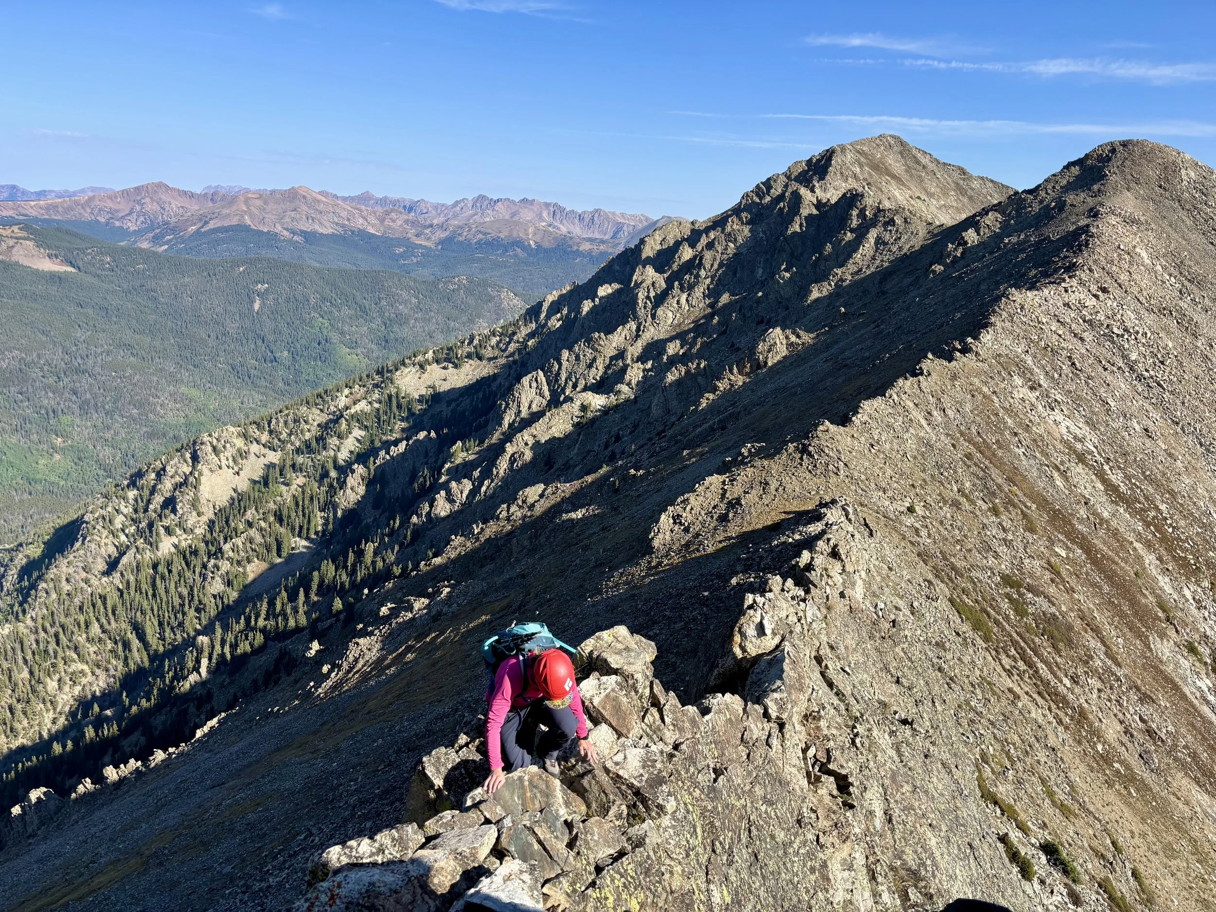 The ridge between Peak 3 and Peak 4 looked more intimidating than the ridge had looked between Tenmile Peak and Peak 3, which was supposed to be the crux. We descended the south ridge of Peak 3 and once we got to the saddle to begin the ascent to Peak 4, it was clear that we had some class 3 scrambling ahead of us and route finding would be key. We stayed ridgeline-proper, except for in a few spots, and I didn’t come across any scrambling that was above class 3. If you find yourself in class 4 or class 5 terrain, you missed an easier option. I found this part of the day to be the most fun. The rock was very solid and the scrambling was very enjoyable. As we approached the top of Peak 4, we had the weirdest experience of our day. When we were about 1/3 of a mile from the top, we realized there was a naked man in his late 30s that was taking photos of himself at the top. He had a tripod for this phone that he would set up and then he would walk out in front of the tripod and stand naked, looking out across the mountains. He did this for about 15 minutes. Thankfully, he put his clothes back on as we approached. We had already leapfrogged a few times with him earlier in the day, but the leapfrogging got more awkward after watching this photoshoot occur as we really weren’t sure what to say to him after that experience.